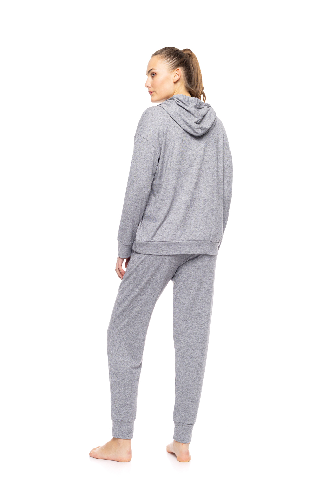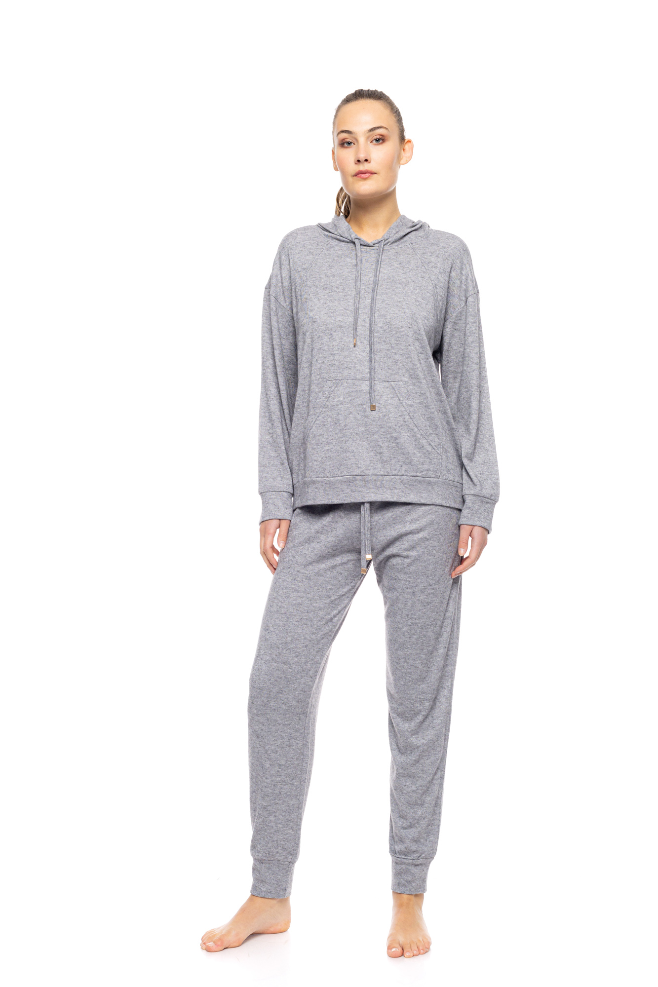 Γυναικεία πυτζάμα Pink Label γκρι με λάστιχο στα τελειώματα. Μακρυμάνικη μπλούζα με κουκούλα και τσέπη μπροστά. Μακρύ παντελόνι σε ίσια γραμμή με μαλακό λάστιχο στην μέση και στους αστραγάλους.