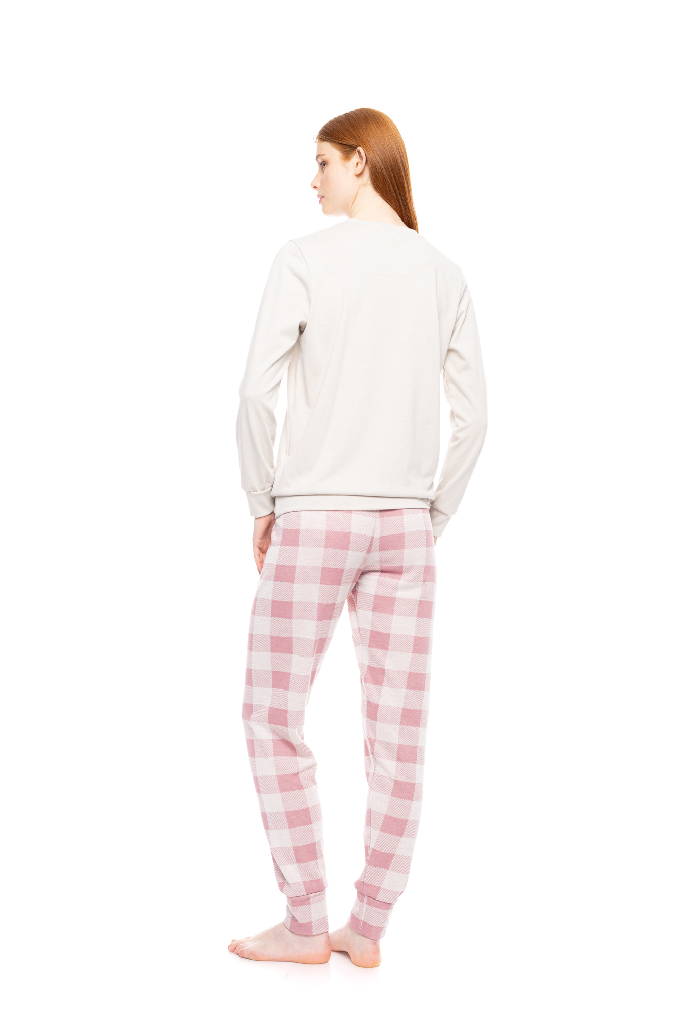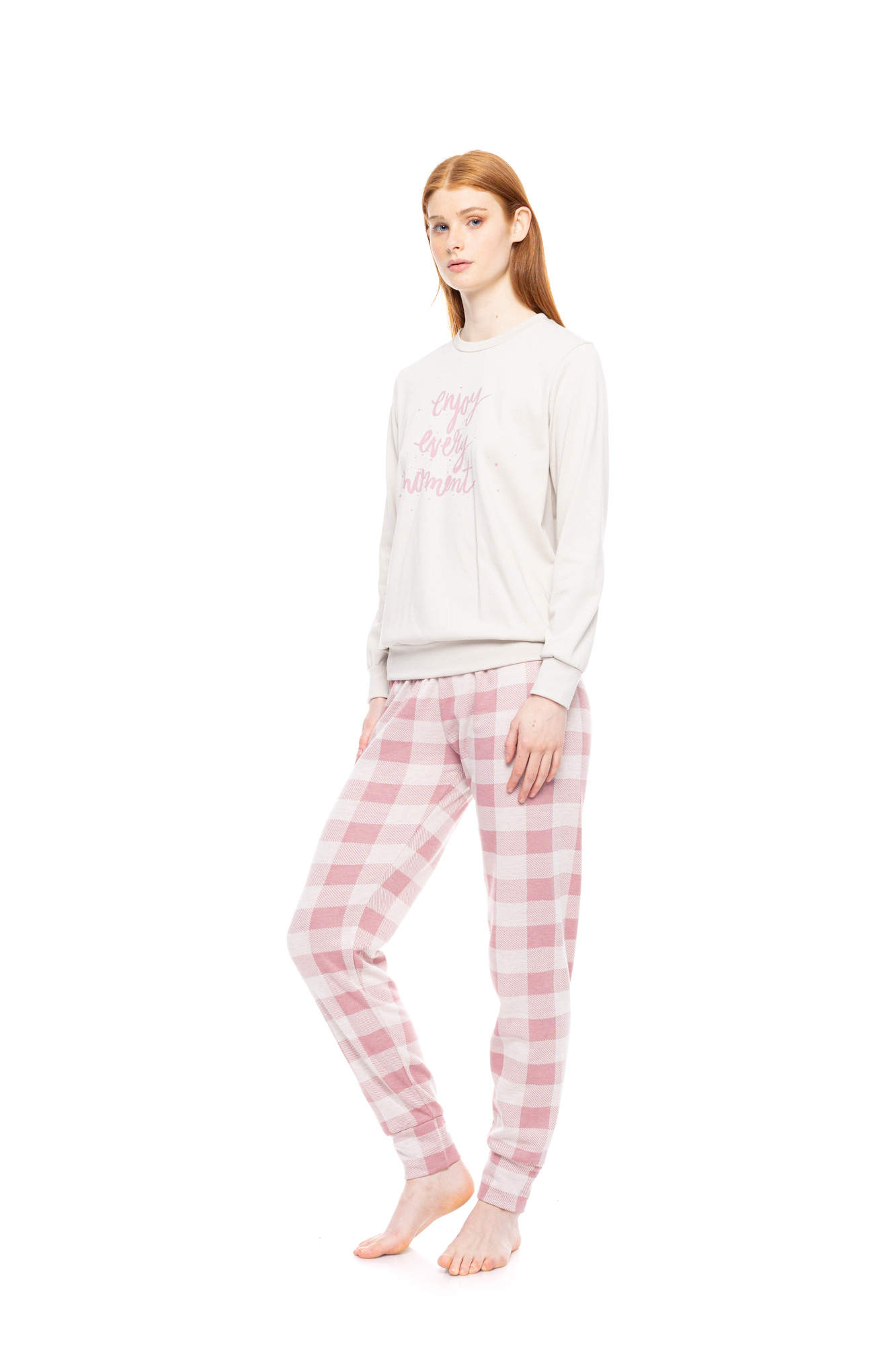 Γυναικεία πυτζάμα Pink Label με λάστιχο στα τελειώματα. Μακρυμάνικη μπλούζα με λεκτικό print στο στήθος. Μακρύ παντελόνι με καρό print σε ίσια γραμμή με μαλακό λάστιχο στην μέση.