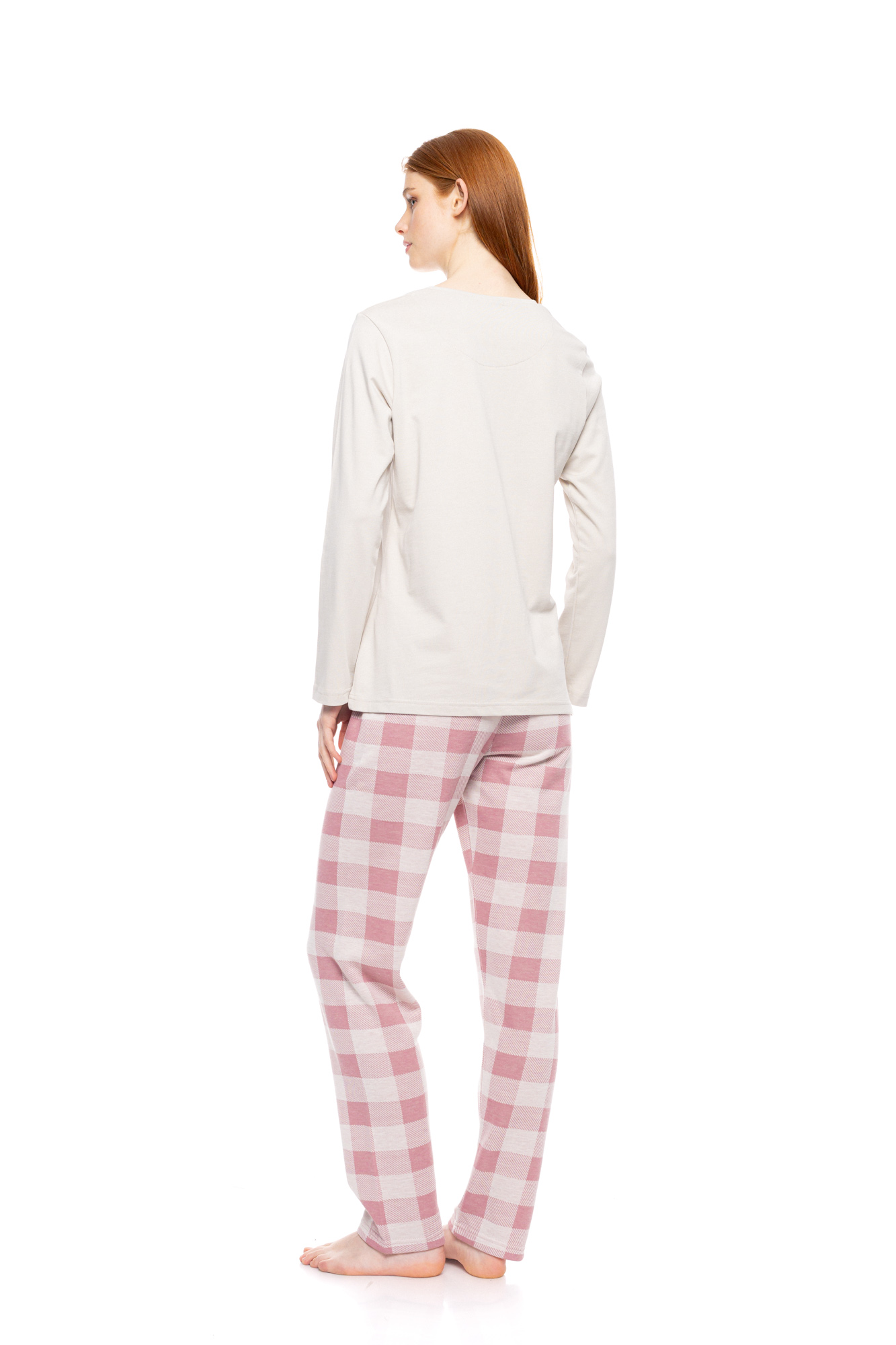 Γυναικεία πυτζάμα Pink Label με πατιλέτα. Μακρυμάνικη μπλούζα Off White με καρό λεπτομέρεια. Μακρύ ροζ καρό παντελόνι σε ίσια γραμμή με μαλακό λάστιχο στην μέση.
