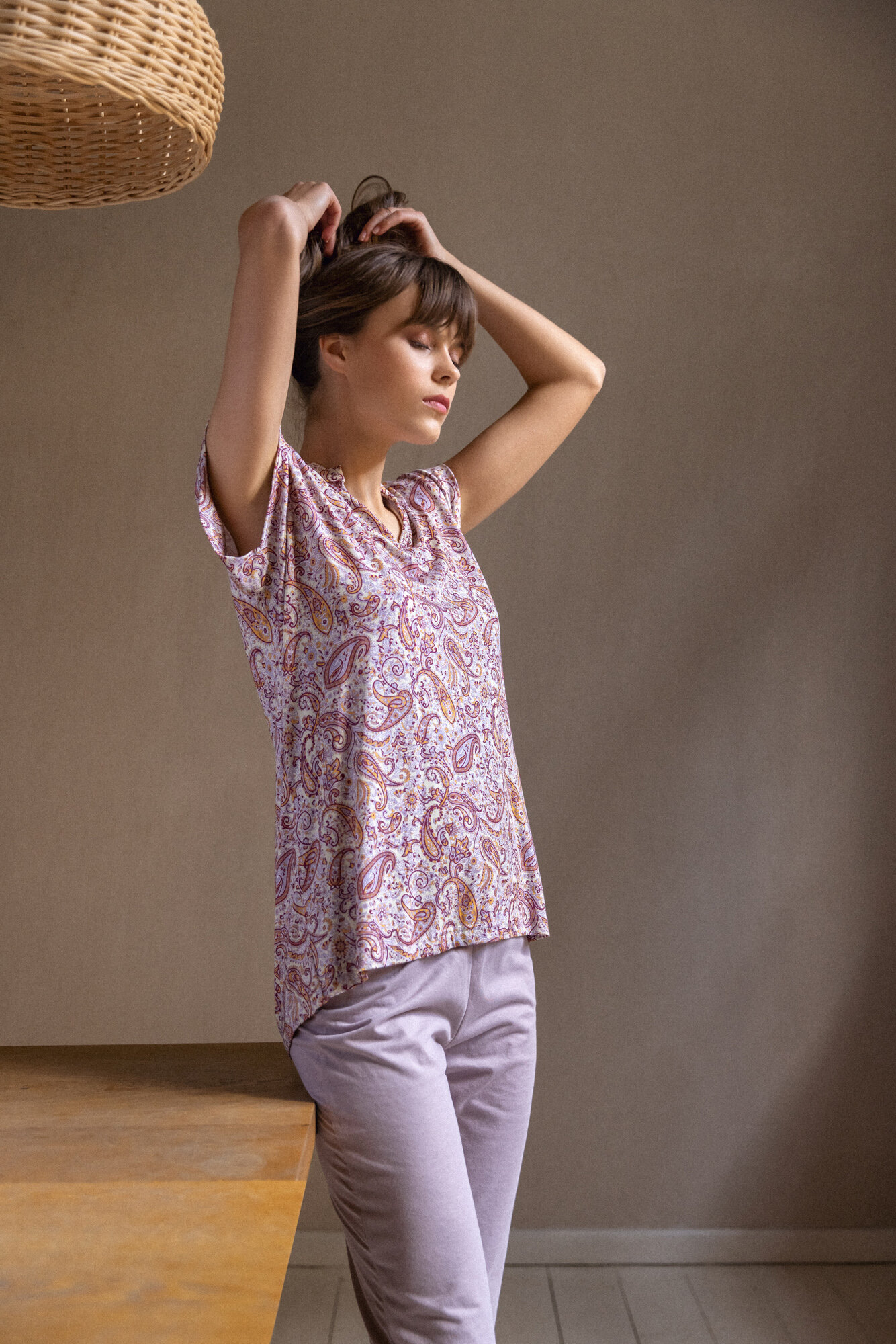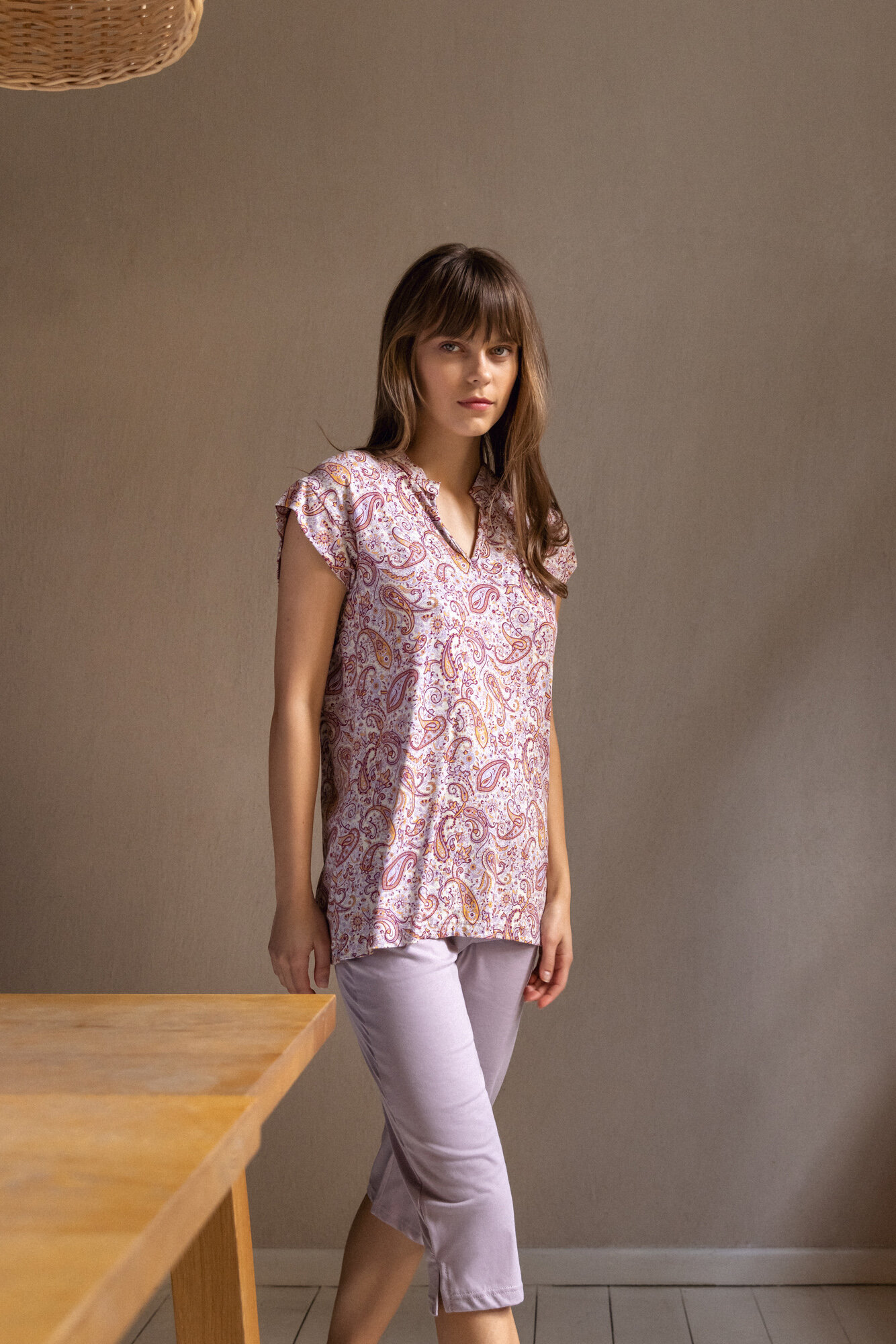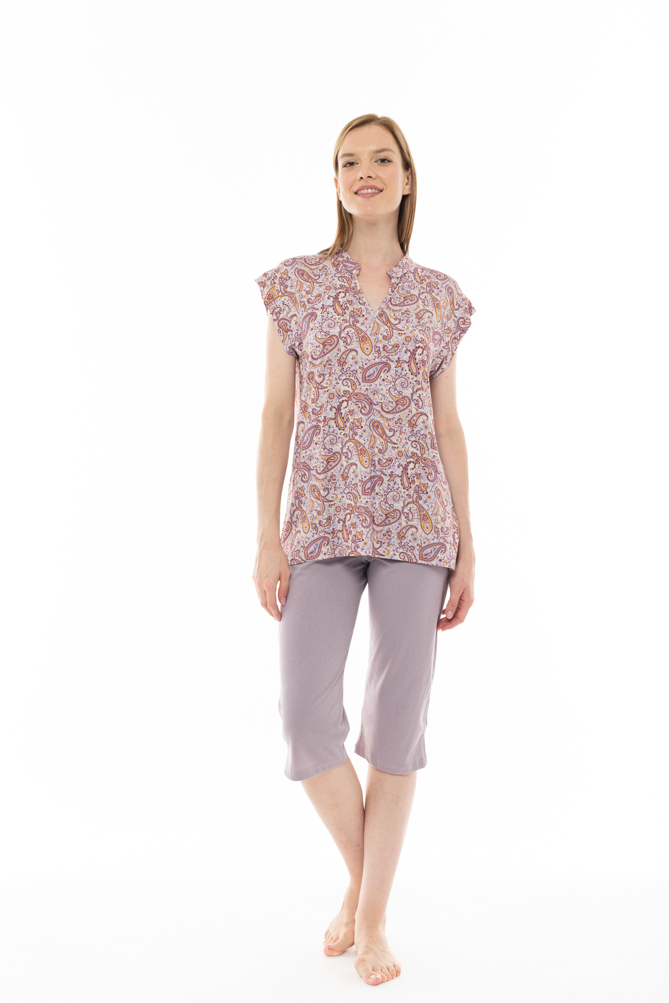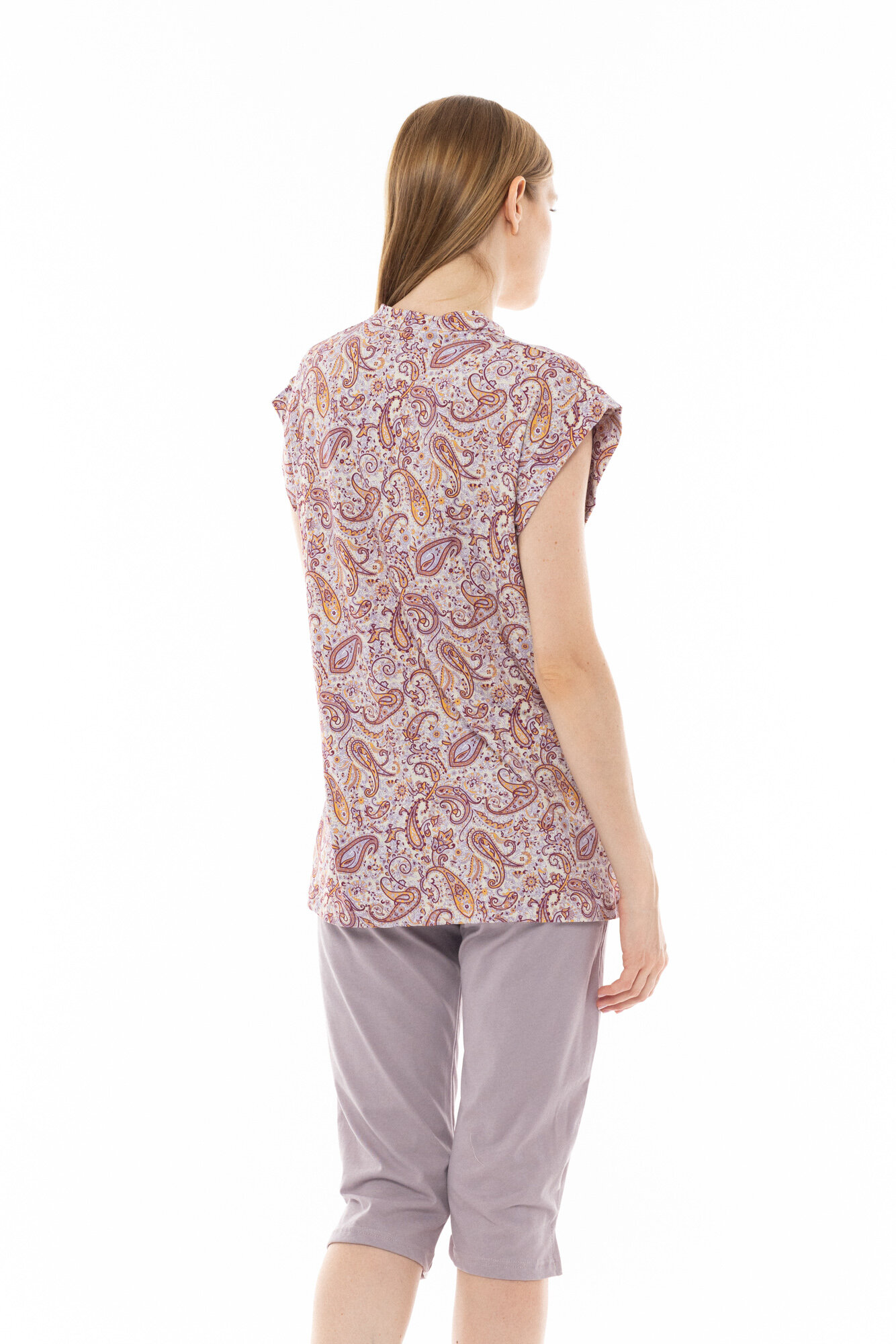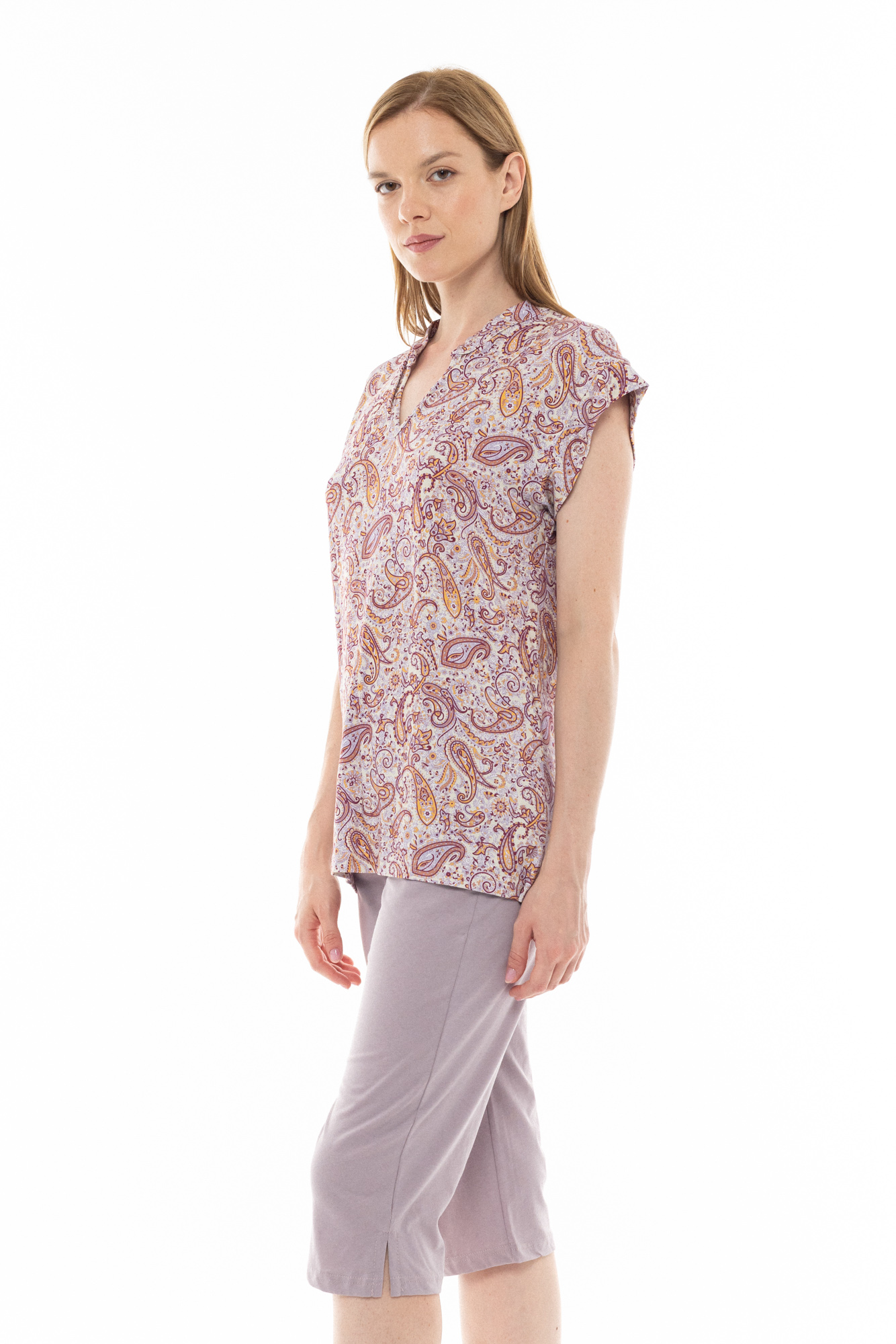 Γυναικεία Πυτζάμα Pink Label με μονόχρωμο λιλά κάπρι παντελόνι σε ίσια γραμμή με ανοίγμα στο πλάι. Καλοκαιρινή πυτζάμα με αμάνικη μπλούζα εμπριμέ με λαχούρια και μάο γιακά.