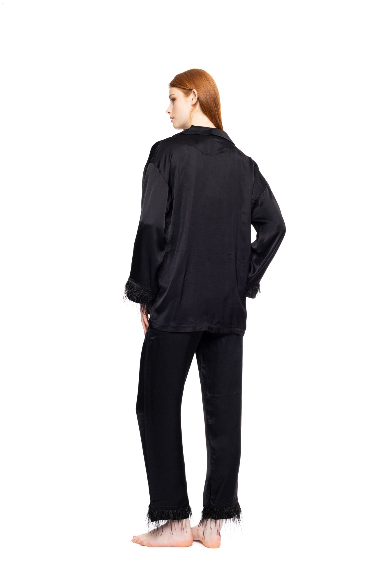 Γυναικεία πυτζάμα σεμιζιέ Pink Label σε μαύρο σατέν viscose μαλακό ύφασμα . Μακρυμάνικη μπλούζα , τσέπη στο στήθος και κουμπιά σε όλο το μήκος. Μακρύ παντελόνι σε ίσια γραμμή με μαλακό λάστιχο στην μέση. Λεπτομέρειες από πούπουλα στα μανίκια και το τελείωμα του παντελονιού.