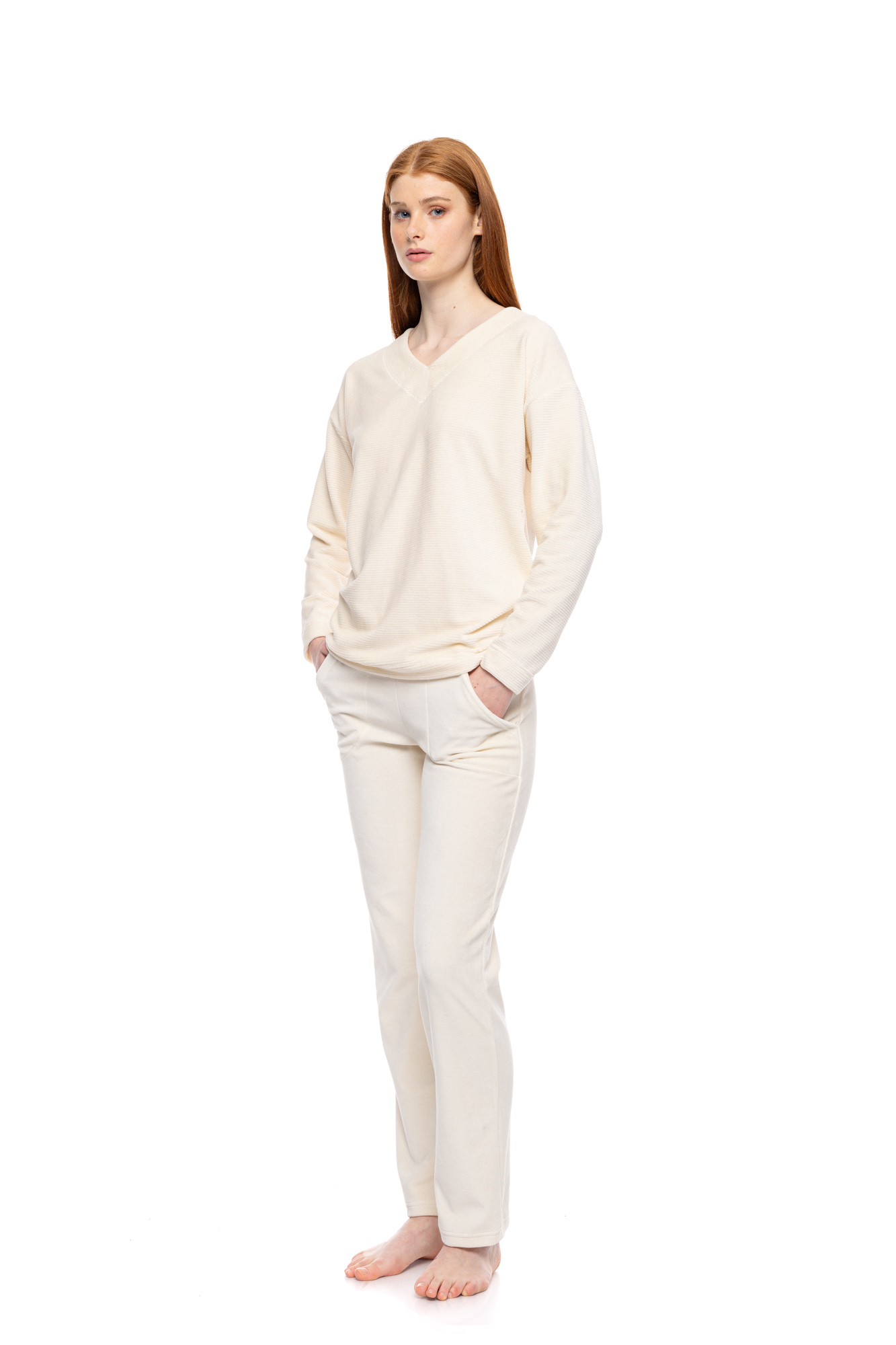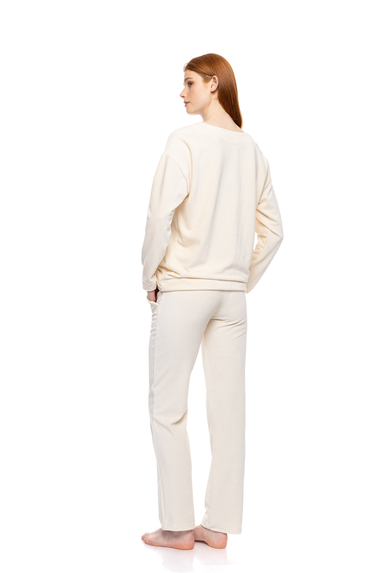 Γυναικεία πυτζάμα Pink Label Off White από πολύ μαλακό βαμβακερό ύφασμα. Μακρυμάνικη μπλούζα V Neck σε άνετη γραμμή. Μακρύ παντελόνι σε ίσια γραμμή με μαλακό λάστιχο στην μέση.