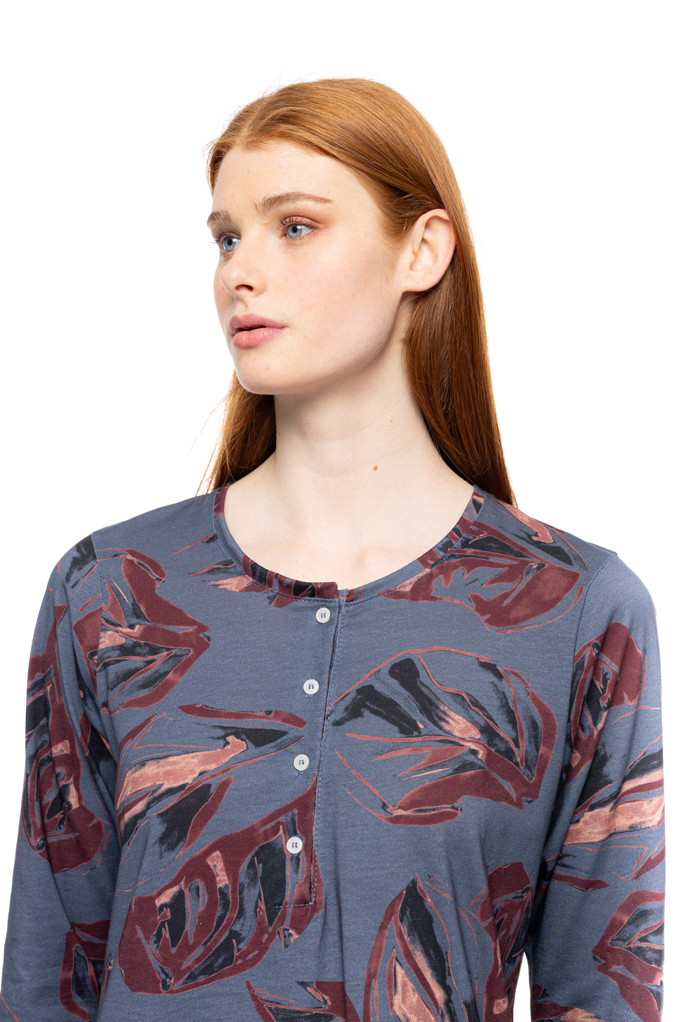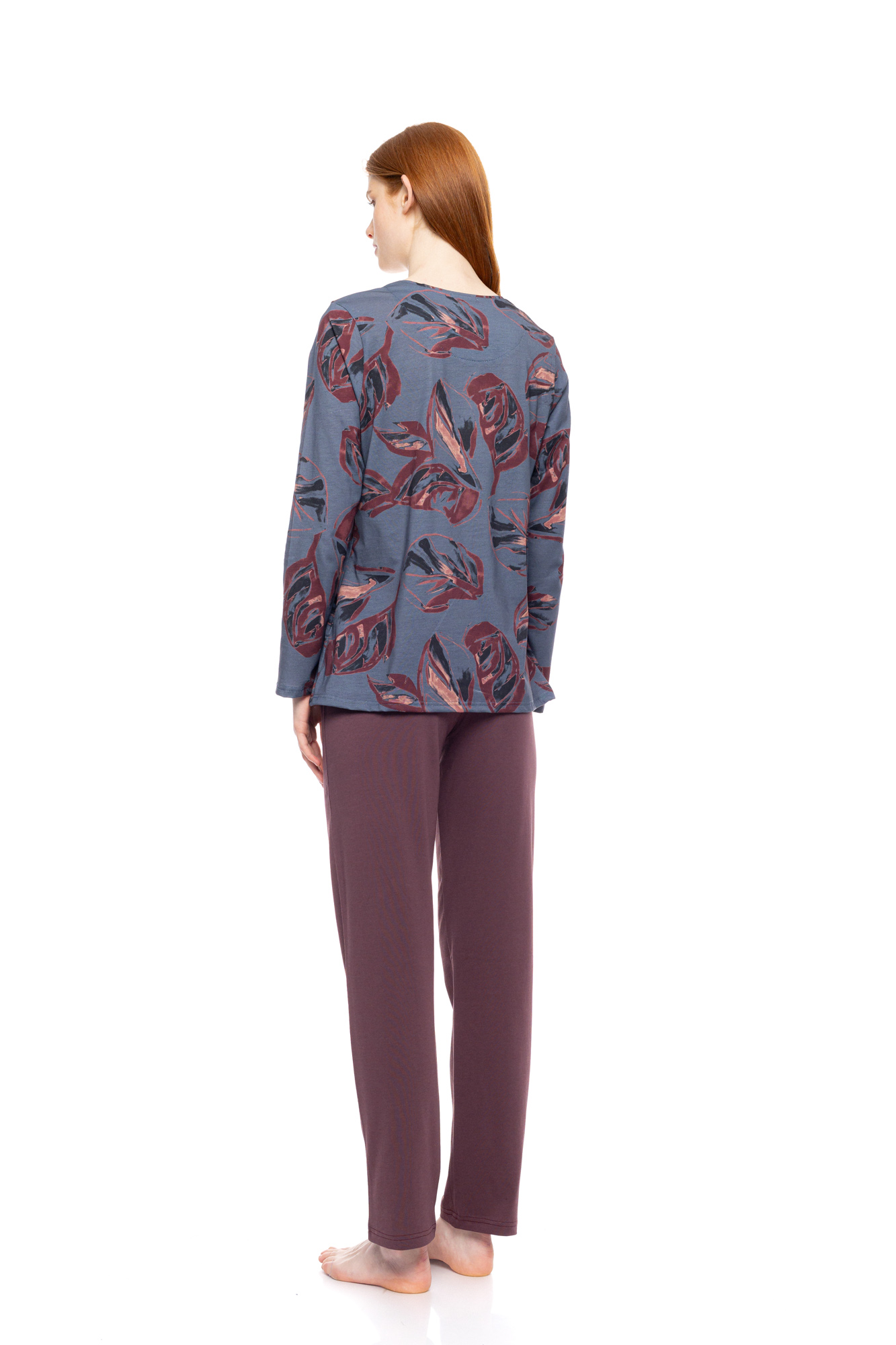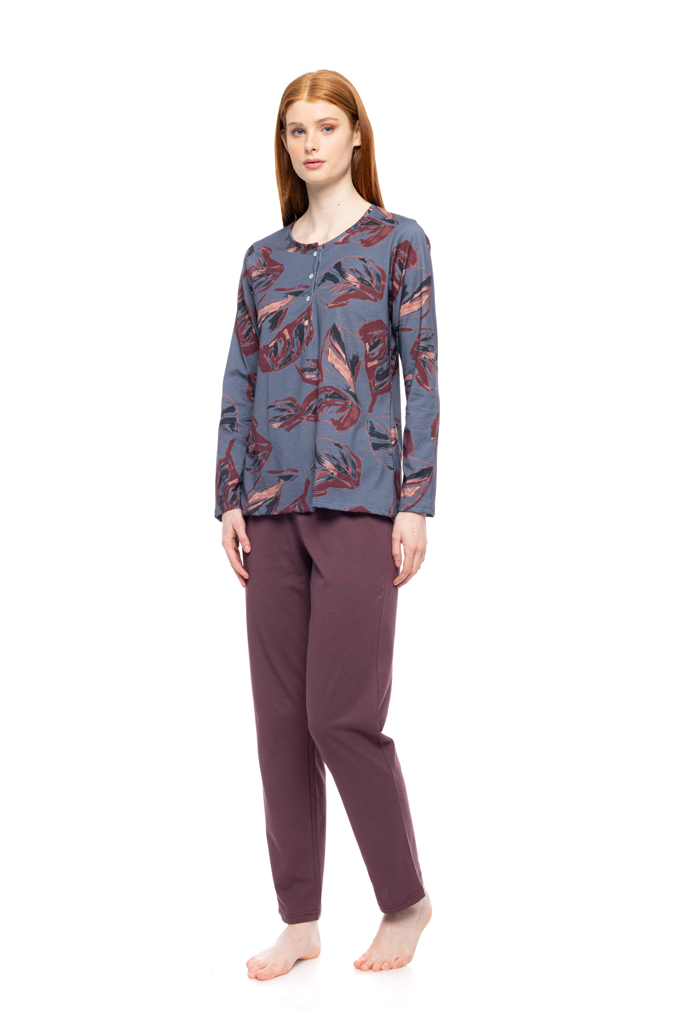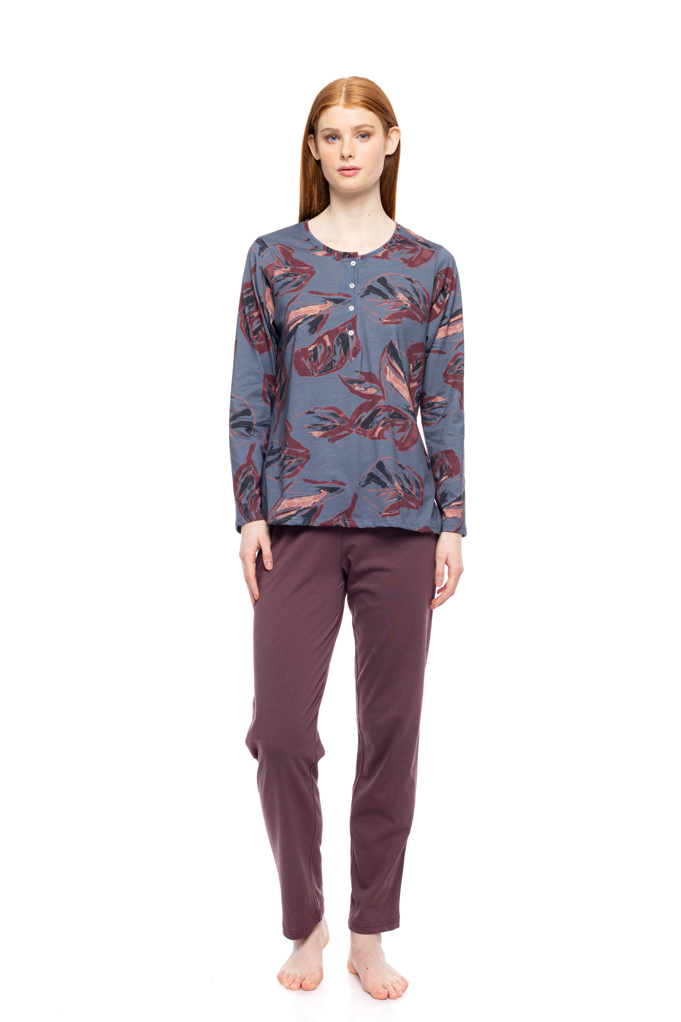 Γυναικεία πυτζάμα Pink Label. Μακρυμάνικη πυτζάμα με τύπωμα φθινοπωρινά φύλλα σε γήινους τόνους με πατιλέτα. Παντελόνι μονόχρωμο σε ίσια γραμμή με μαλακό λάστιχο στην μέση.