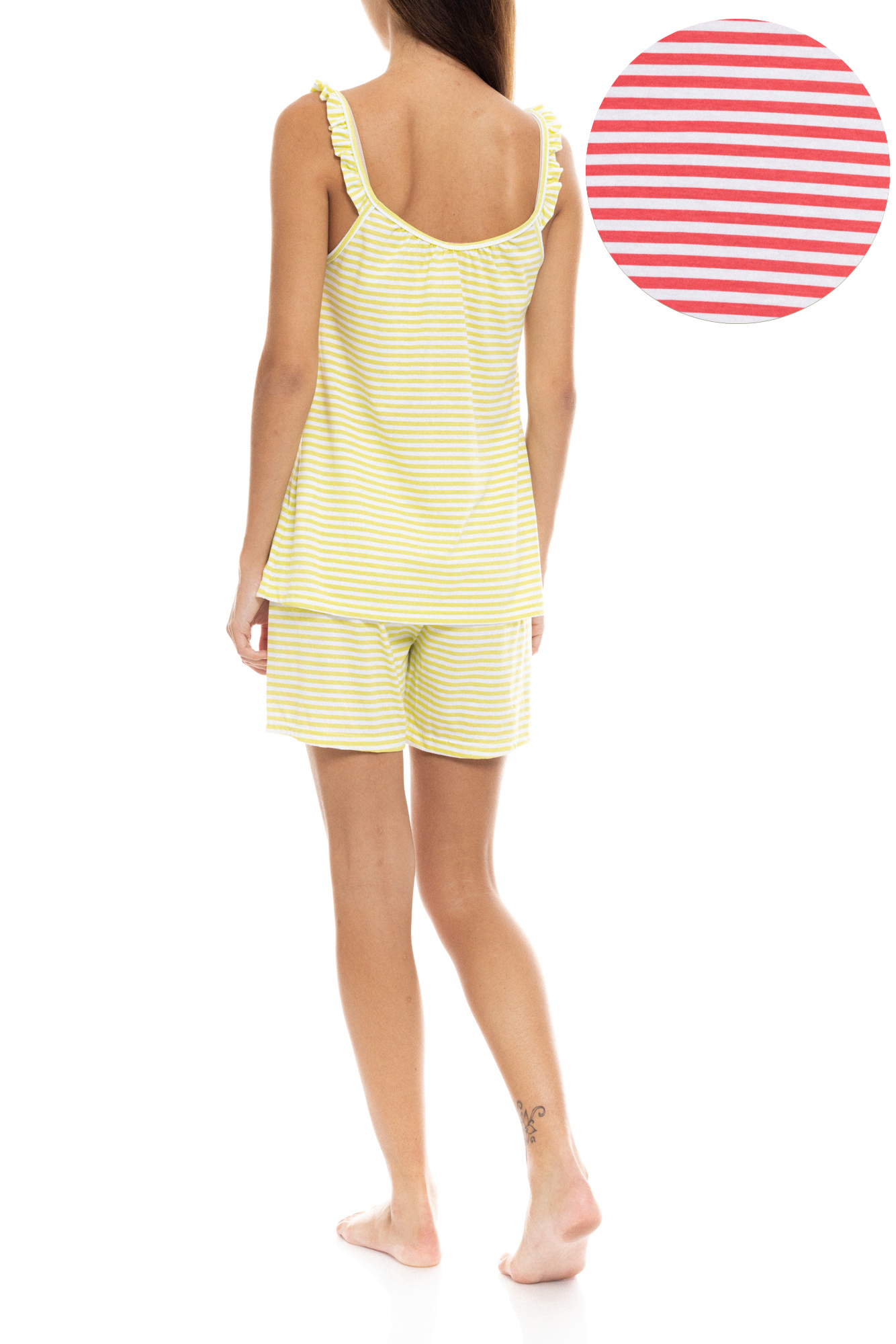 Γυναικεία Πυτζάμα Pink Label κόκκινη ριγέ με σορτσάκι και λεπτές τιράντες με βολάν. Καλοκαιρινή πυτζάμα με στρογγυλή λαιμόκοψη και κουμπάκια που διευκολύνουν τον θηλασμό.
