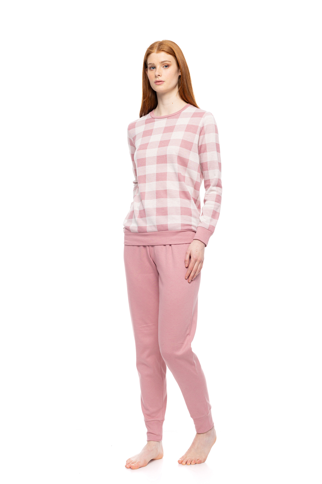 Γυναικεία πυτζάμα Pink Label με λάστιχο στα τελειώματα. Μακρυμάνικη μπλούζα με καρό print σε ροζ τόνους. Μακρύ ροζ παντελόνι σε ίσια γραμμή με μαλακό λάστιχο στην μέση και στους αστραγάλους.