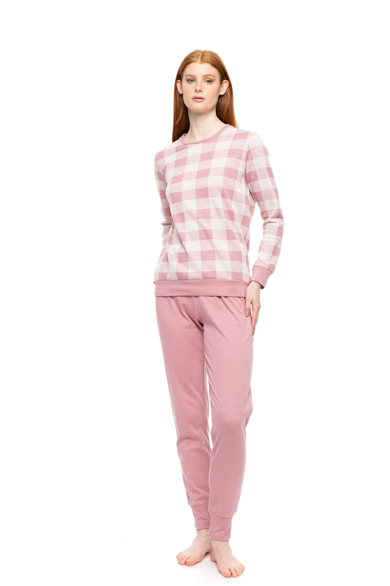 Γυναικεία πυτζάμα Pink Label με λάστιχο στα τελειώματα. Μακρυμάνικη μπλούζα με καρό print σε ροζ τόνους. Μακρύ ροζ παντελόνι σε ίσια γραμμή με μαλακό λάστιχο στην μέση και στους αστραγάλους.