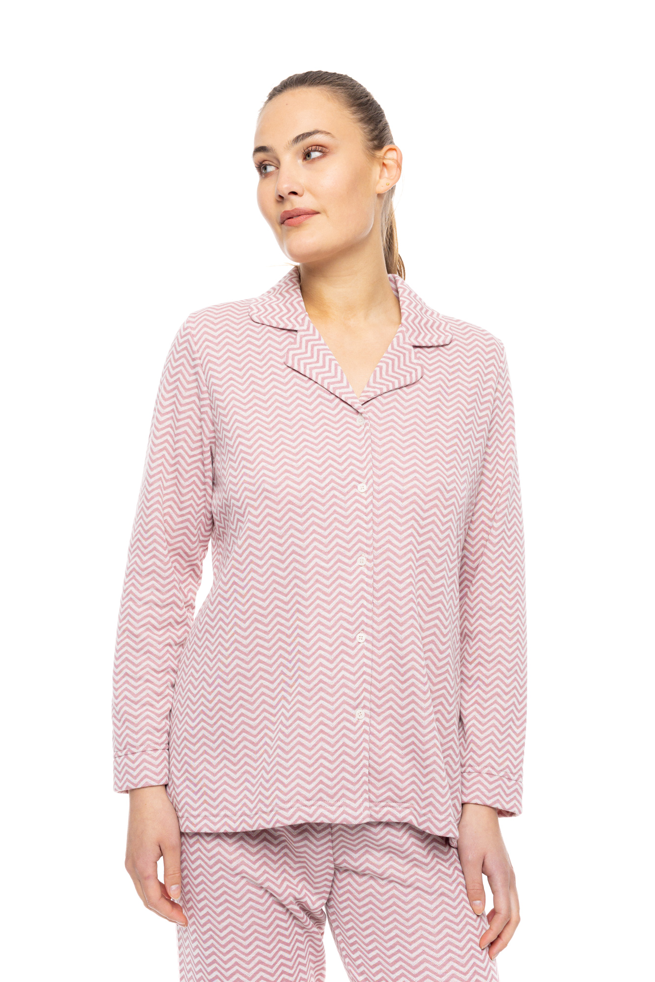 Γυναικεία πυτζάμα σεμιζιέ Pink Label με zic zac print σε απαλή ροζ απόχρωση. Μακρυμάνικη μπλούζα με γιακά και κουμπιά σε όλο το μήκος. Μακρύ παντελόνι σε ίσια γραμμή με μαλακό λάστιχο στην μέση.
