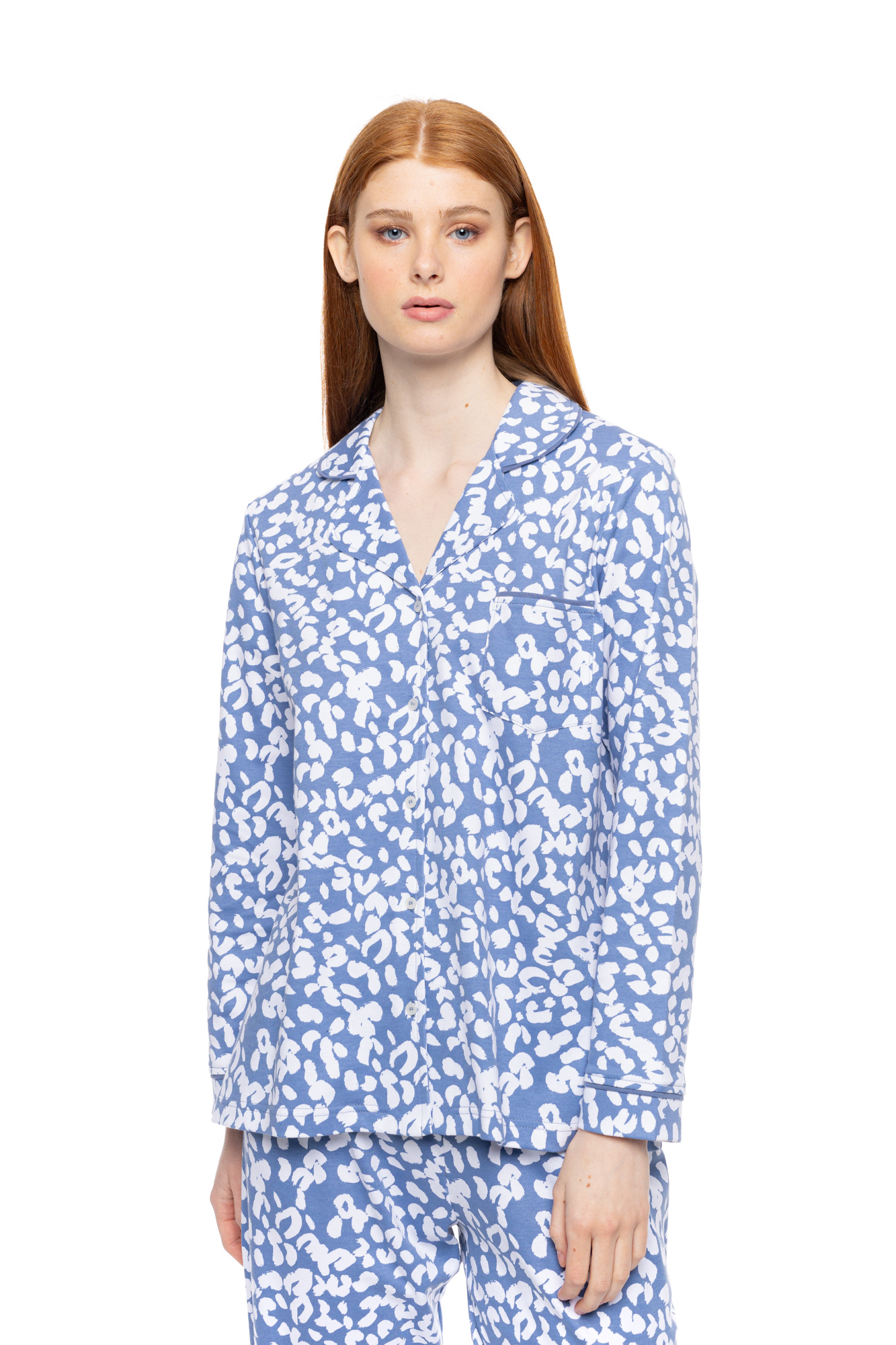 Γυναικεία πυτζάμα σεμιζιέ Pink Label Blue Leopard print. Μακρυμάνικη μπλούζα με γιακά, τσέπη στο στήθος και κουμπιά σε όλο το μήκος. Μακρύ παντελόνι Leo Print σε ίσια γραμμή με μαλακό λάστιχο στην μέση.