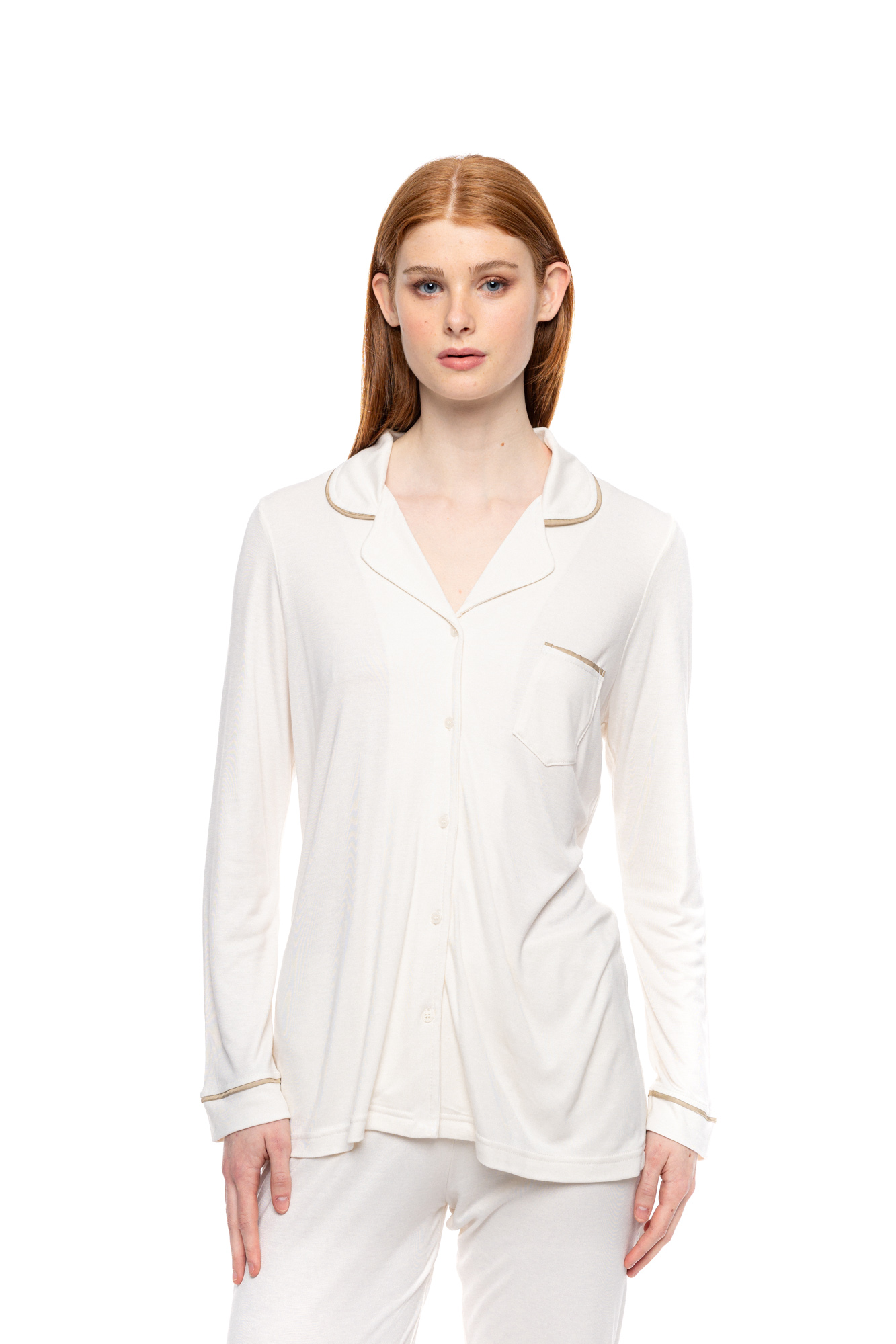 Γυναικεία πυτζάμα Pink Label. Μακρυμάνικη πυτζάμα σεμιζιέ σε Champagne χρώμα με χρυσές λεπτομέρειες κουμπιά σε όλο το μήκος, τσέπη και γιακά. Παντελόνι σε ίσια γραμμή με μαλακό λάστιχο στην μέση.