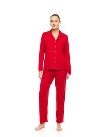 Γυναικεία πυτζάμα σεμιζιέ Pink Label με καρό print σε κόκκινη απόχρωση. Μακρυμάνικη μπλούζα με γιακά, τσέπη στο στήθος και κουμπιά σε όλο το μήκος. Μακρύ παντελόνι σε ίσια γραμμή με μαλακό λάστιχο στην μέση.