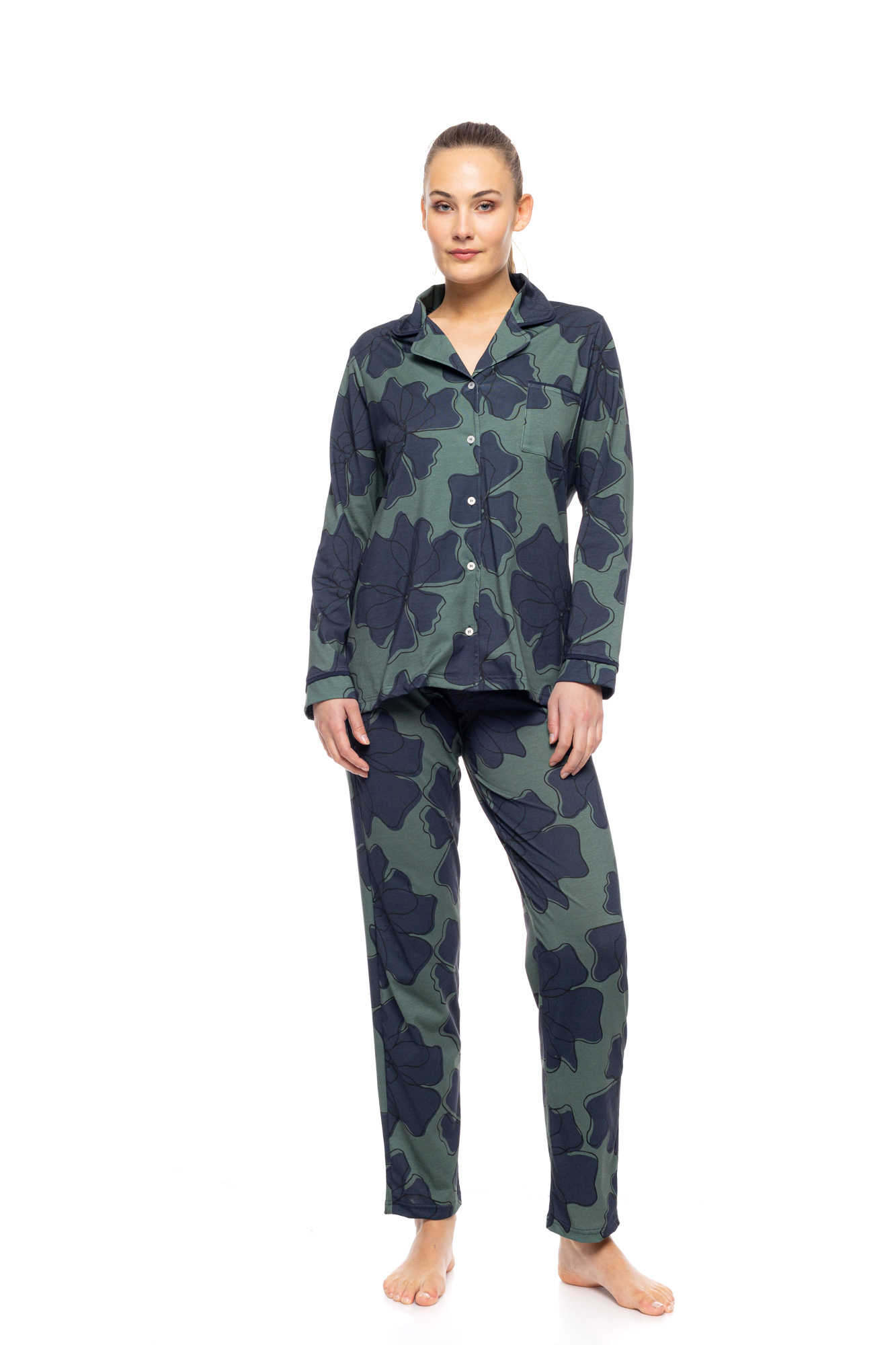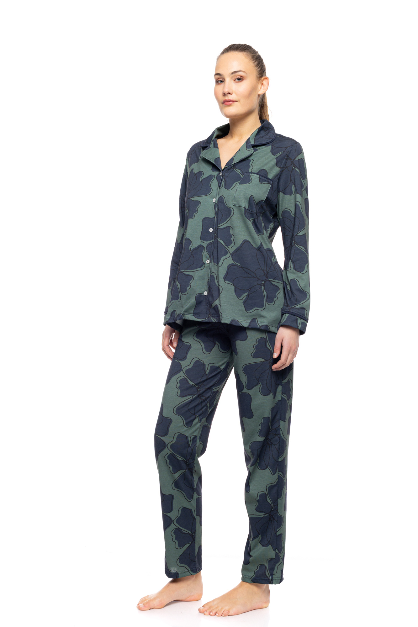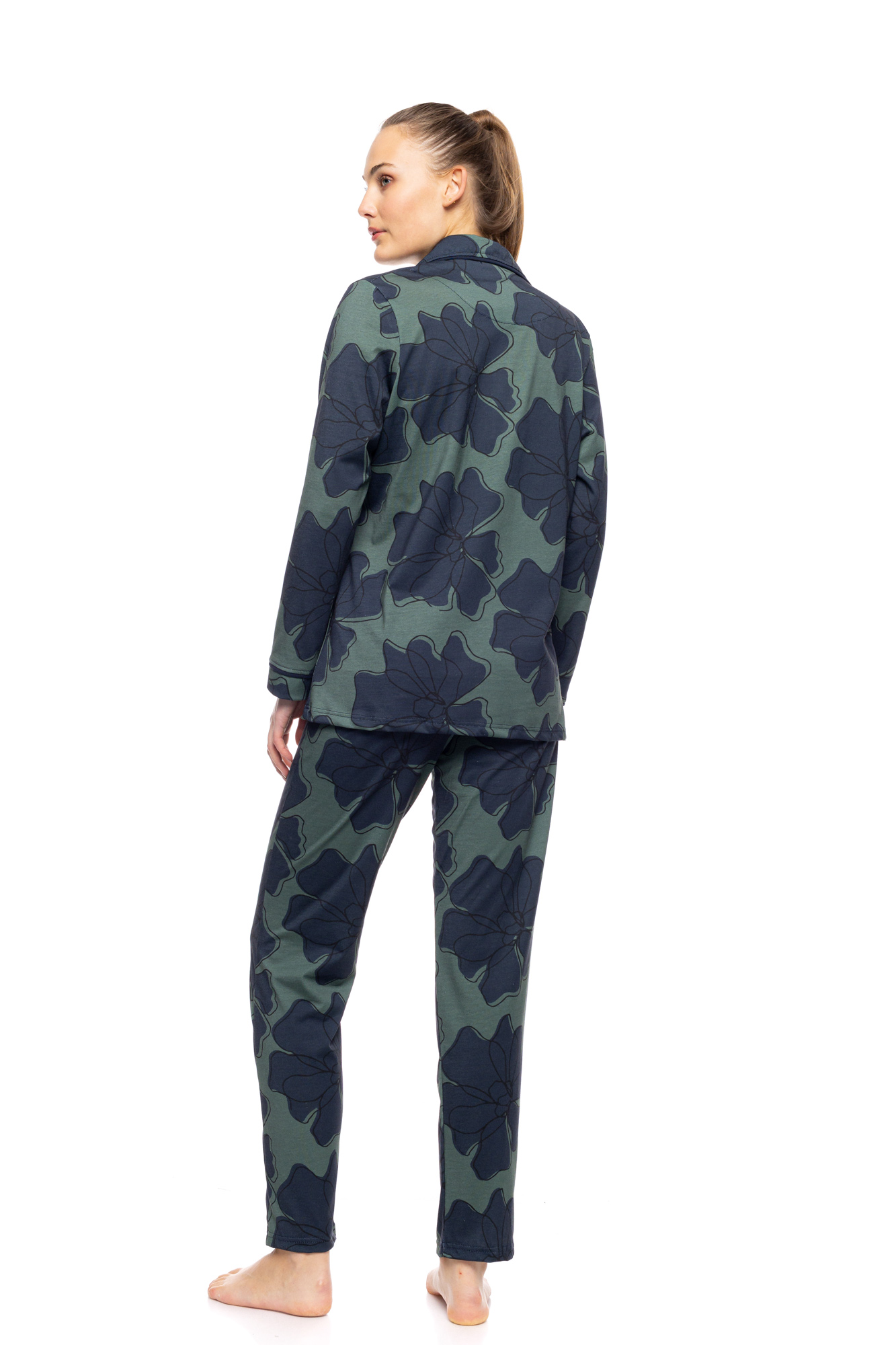 Γυναικεία πυτζάμα Pink Label. Μακρυμάνικη πυτζάμα σεμιζιέ floral σε μπλε και πράσινους τόνους με κουμπιά σε όλο το μήκος και γιακά. Παντελόνι σε ίσια γραμμή με μαλακό λάστιχο στην μέση.