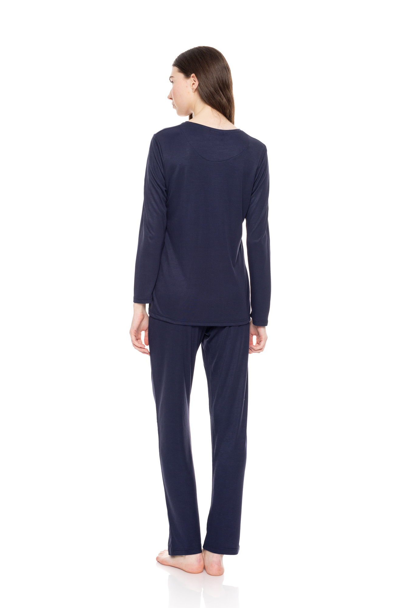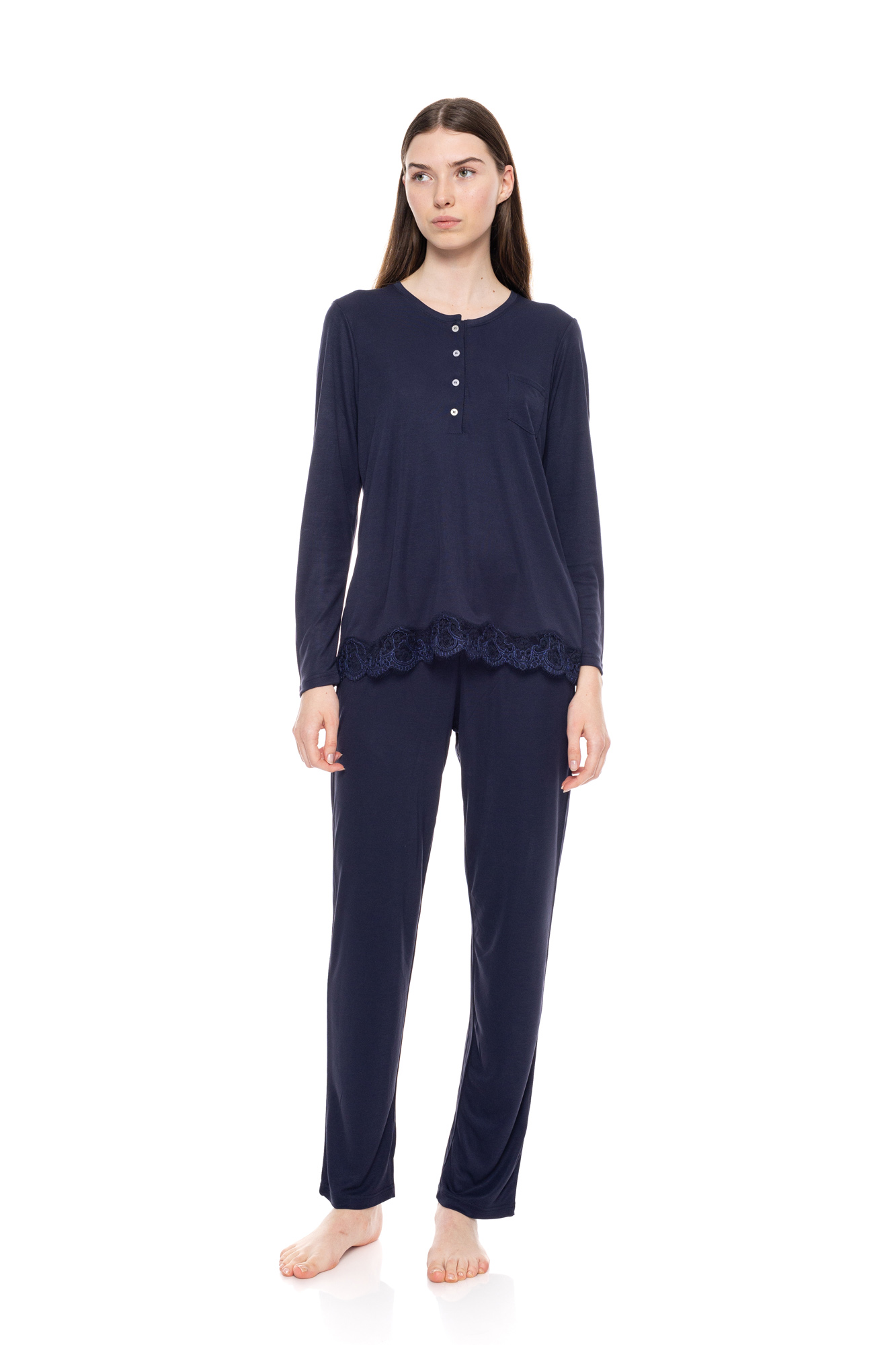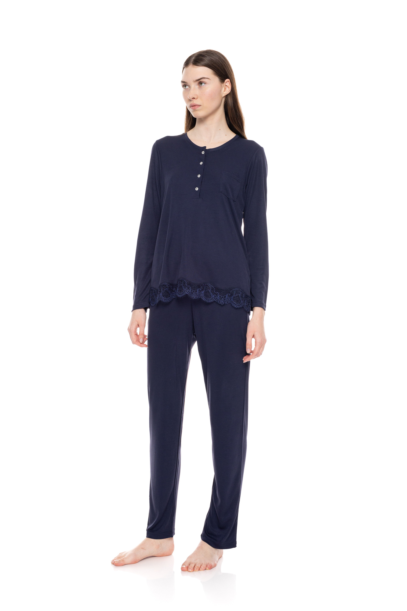 Γυναικεία πυτζάμα Pink Label. Yacht Blue μακρυμάνικη μπλούζα με δαντέλα στο τελείωμα και στρογγυλή λαιμόκοψη με κουμπιά. Μακρύ παντελόνι σε ίσια γραμμή με μαλακό λάστιχο στην μέση.