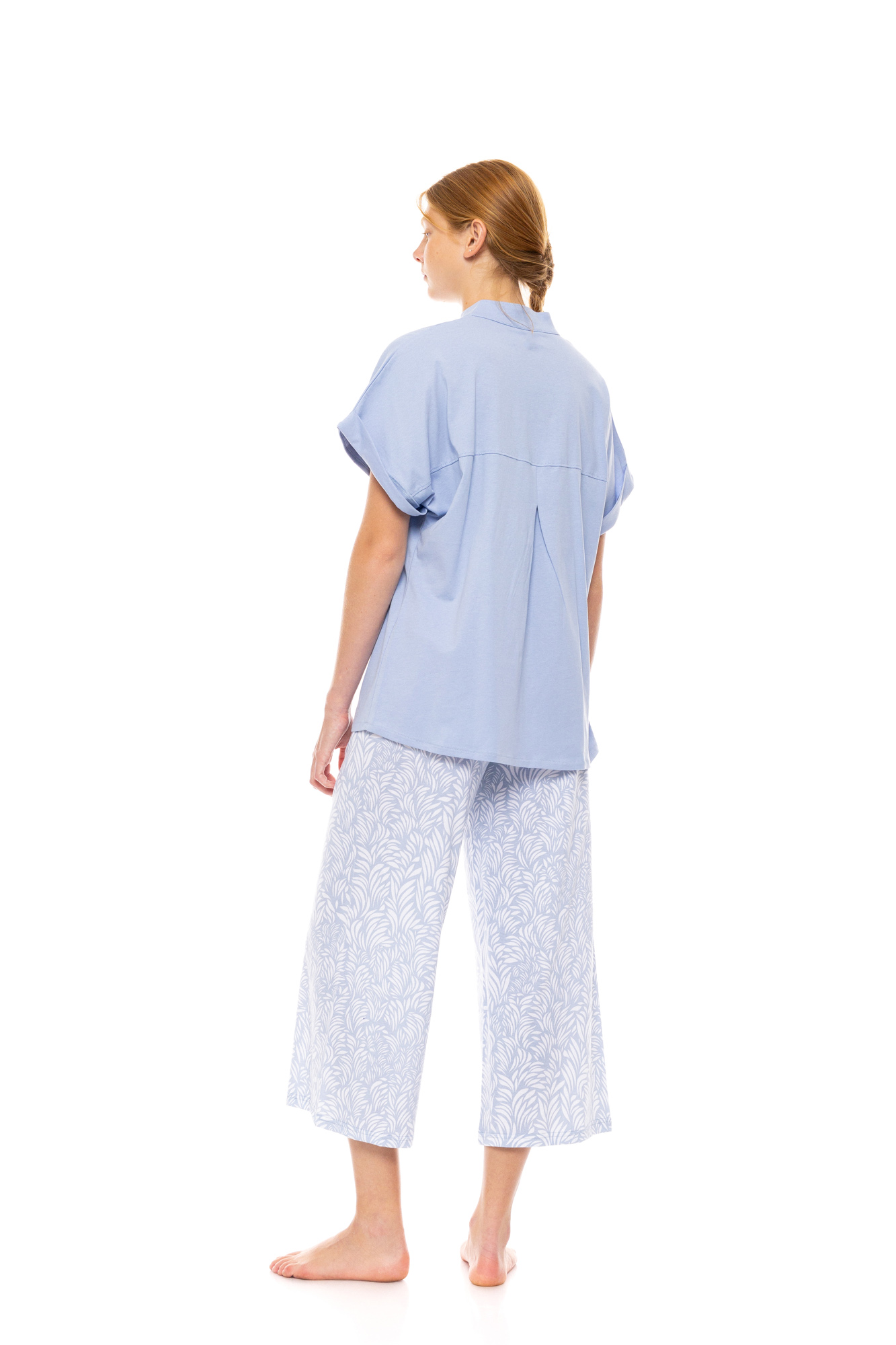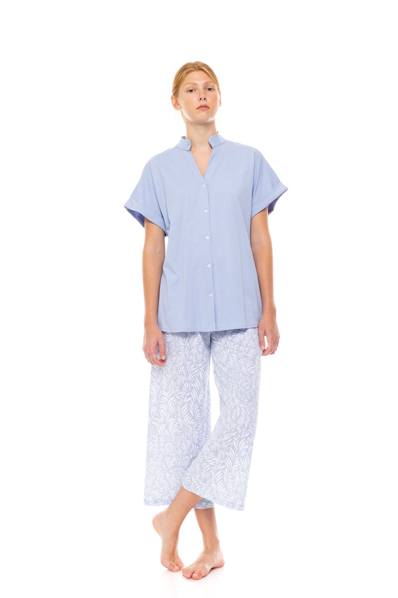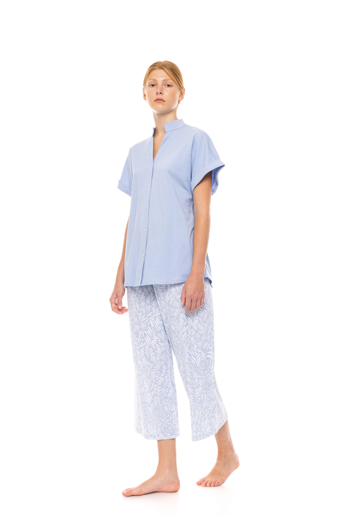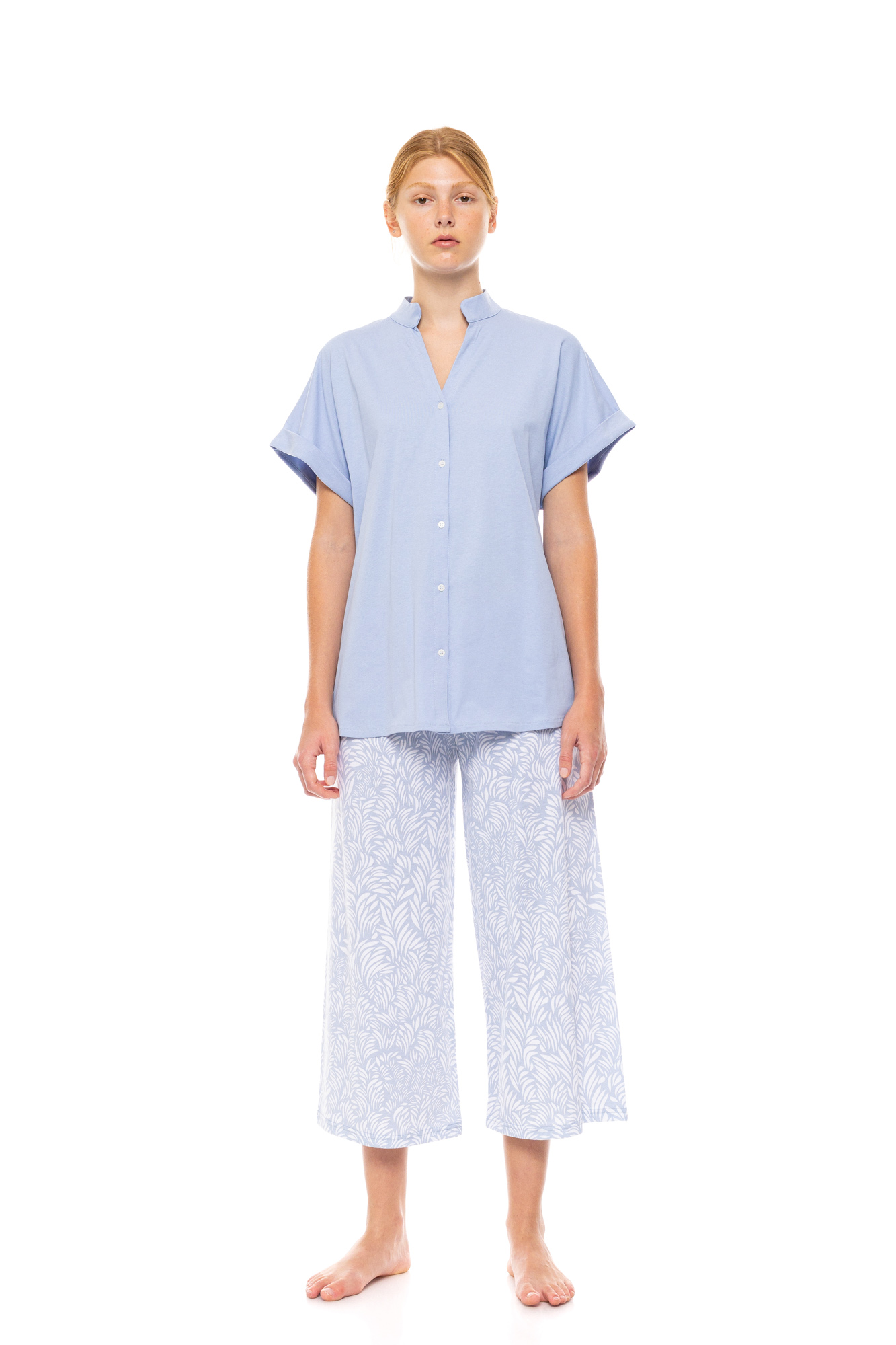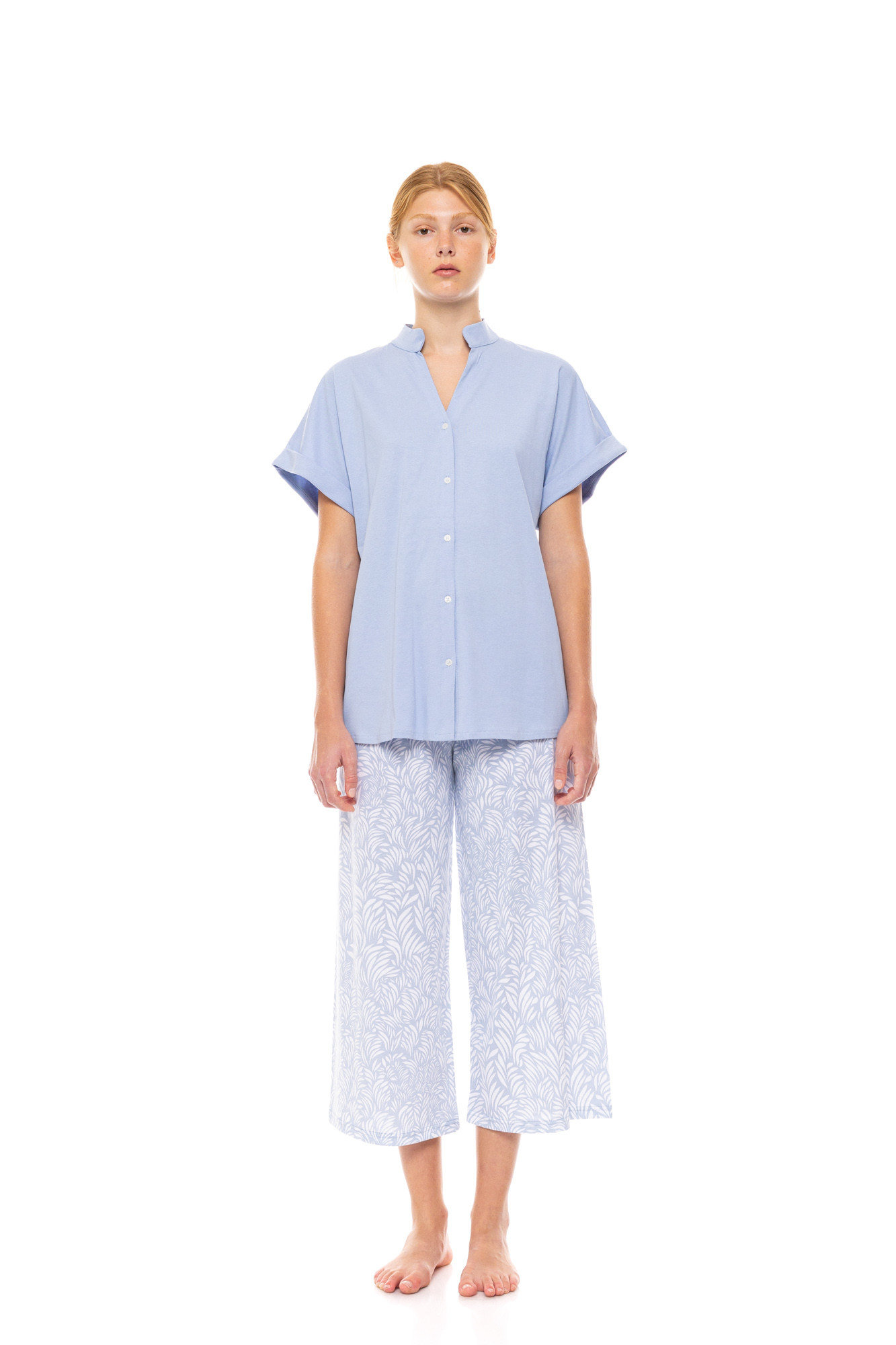 Γυναικεία καλοκαιρινή πυζάμα Pink Label. Κομψή σιέλ χρώμα με κουμπιά και μακρύ παντελόνι .