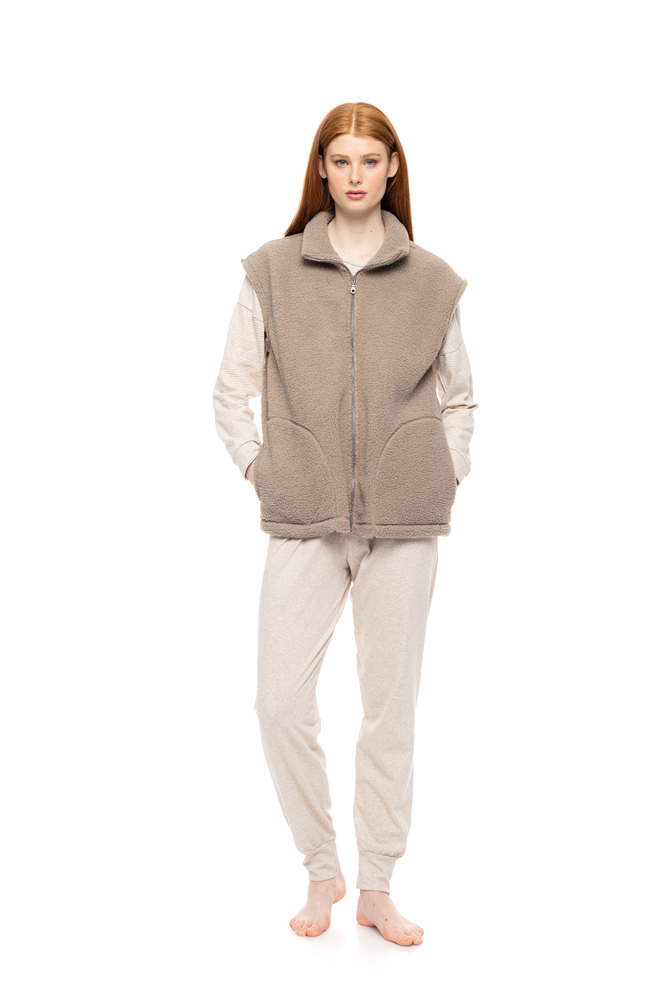 Γυναικεία Ρόμπα - γιλέκο Pink Label FLEECE . Νεανική αμάνικη Ρόμπα κοντή Sand σε ίσια γραμμή κατασκευασμένη από απαλό και ζεστό ύφασμα, τσέπες και κλείσιμο με φερμουάρ.