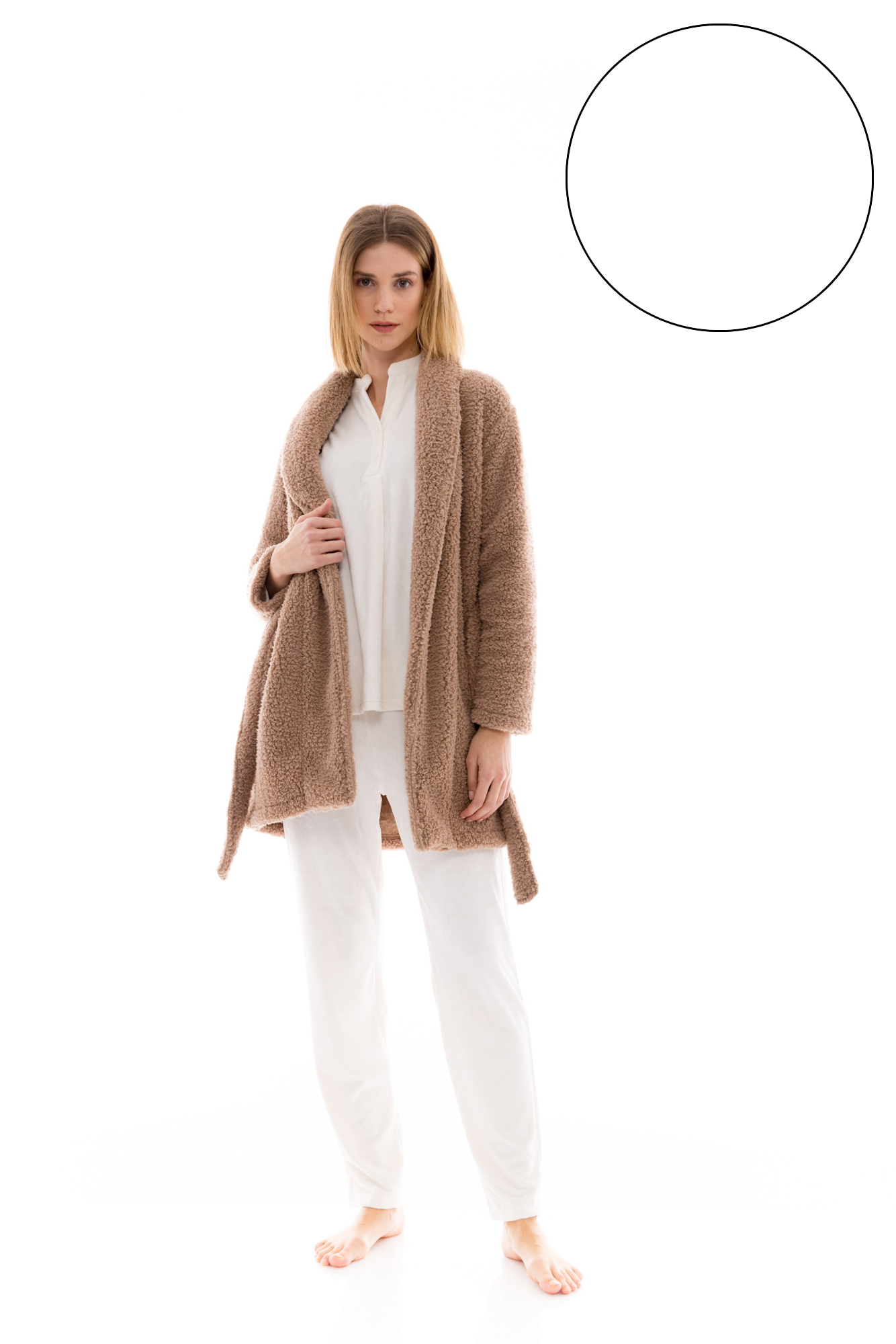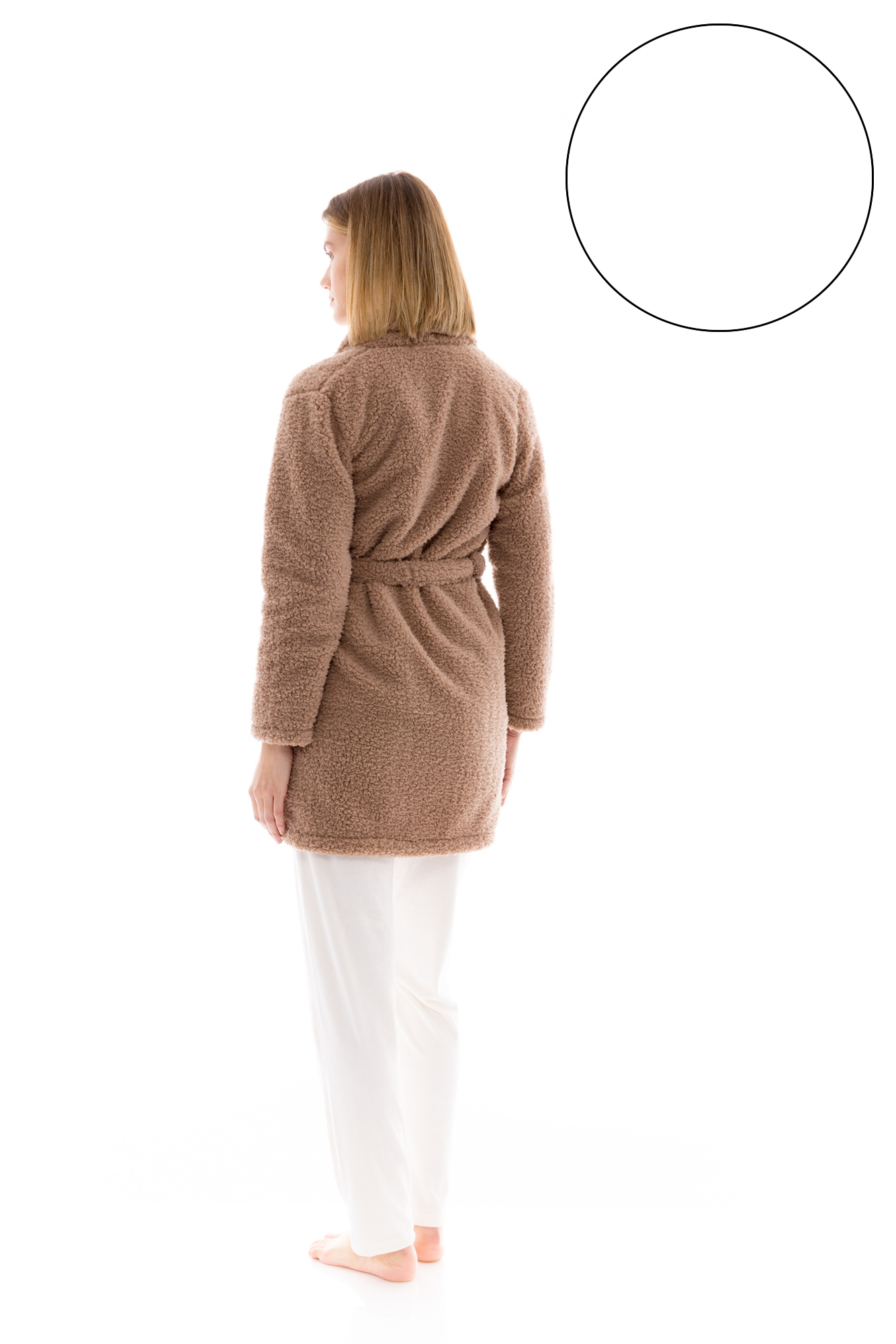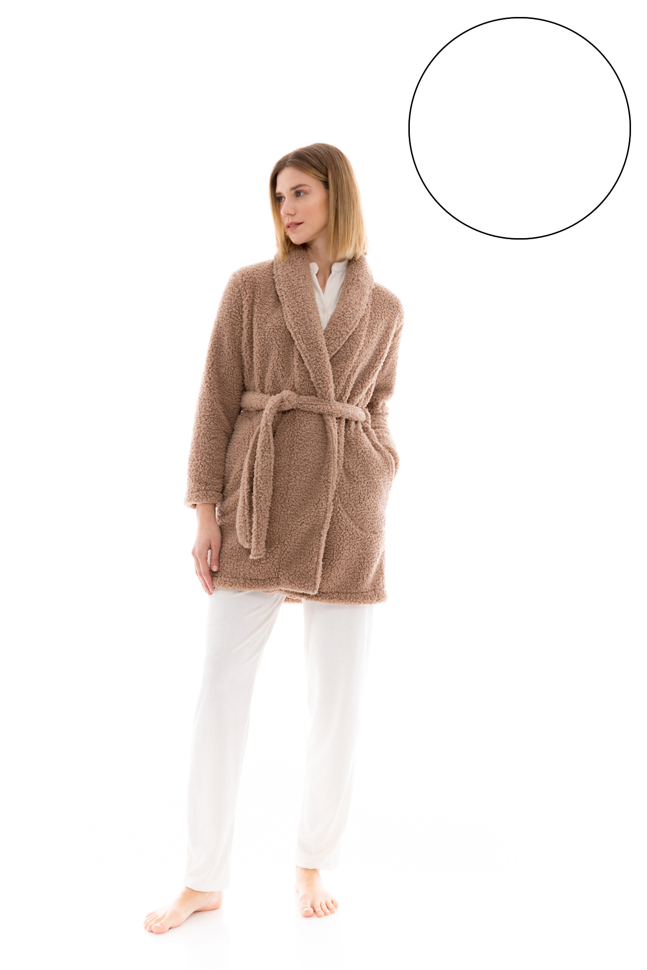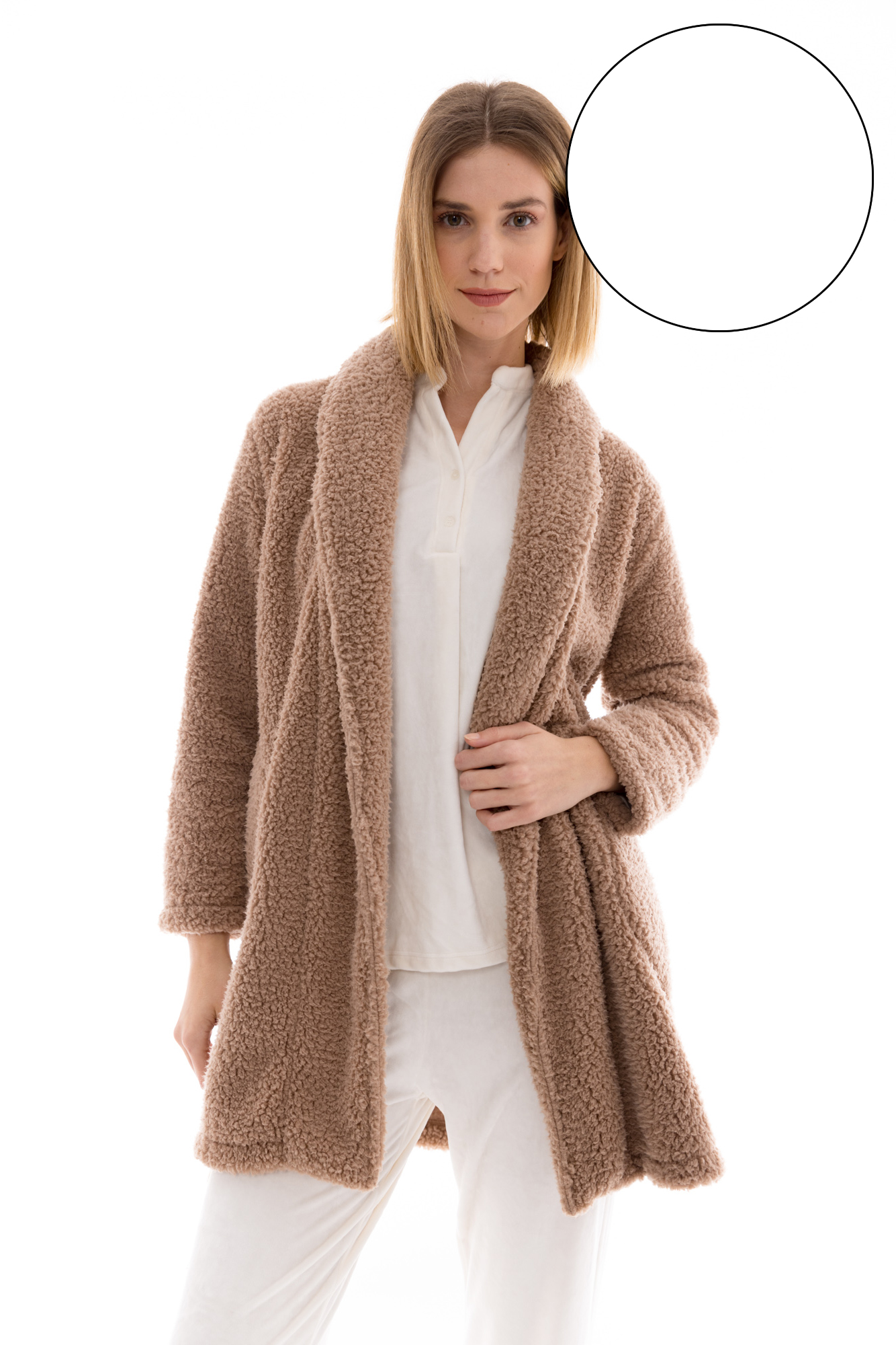 Γυναικεία Ρόμπα με μακρύ μανίκι Pink Label. Νεανική Ρόμπα κοντή Λευκή σε ίσια γραμμή κατασκευασμένη από ζεστό fleece ύφασμα, με ζώνη για δέσιμο στην μέση και τσέπες.