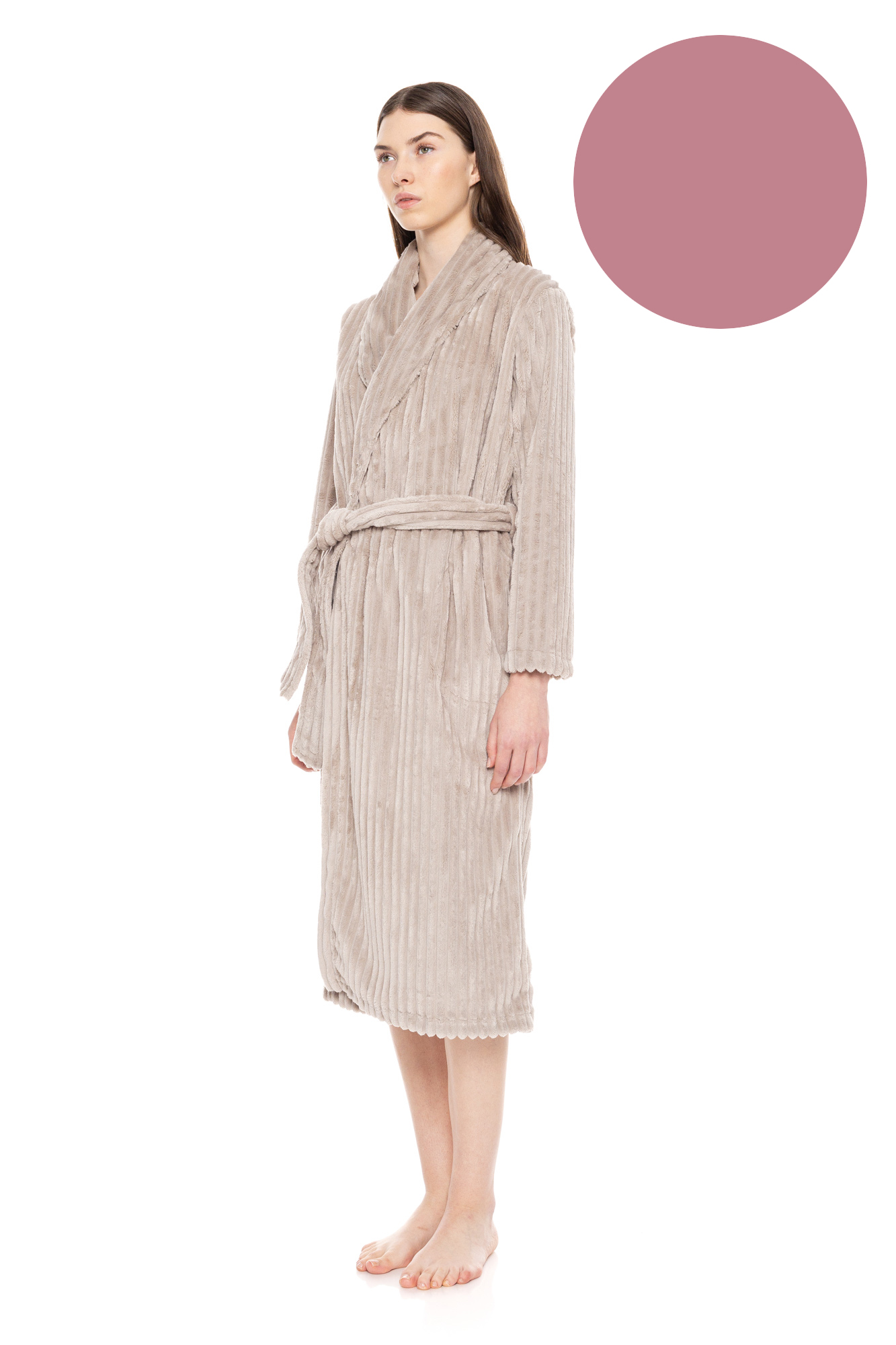 Γυναικεία Ρόμπα με μακρύ μανίκι Pink Label. Νεανική Ρόμπα μακριά Dusty Pink σε ίσια γραμμή κατασκευασμένη από ζεστό fleece ύφασμα, με ανάγλυφες ρίγες, ζώνη για δέσιμο στην μέση και τσέπες.