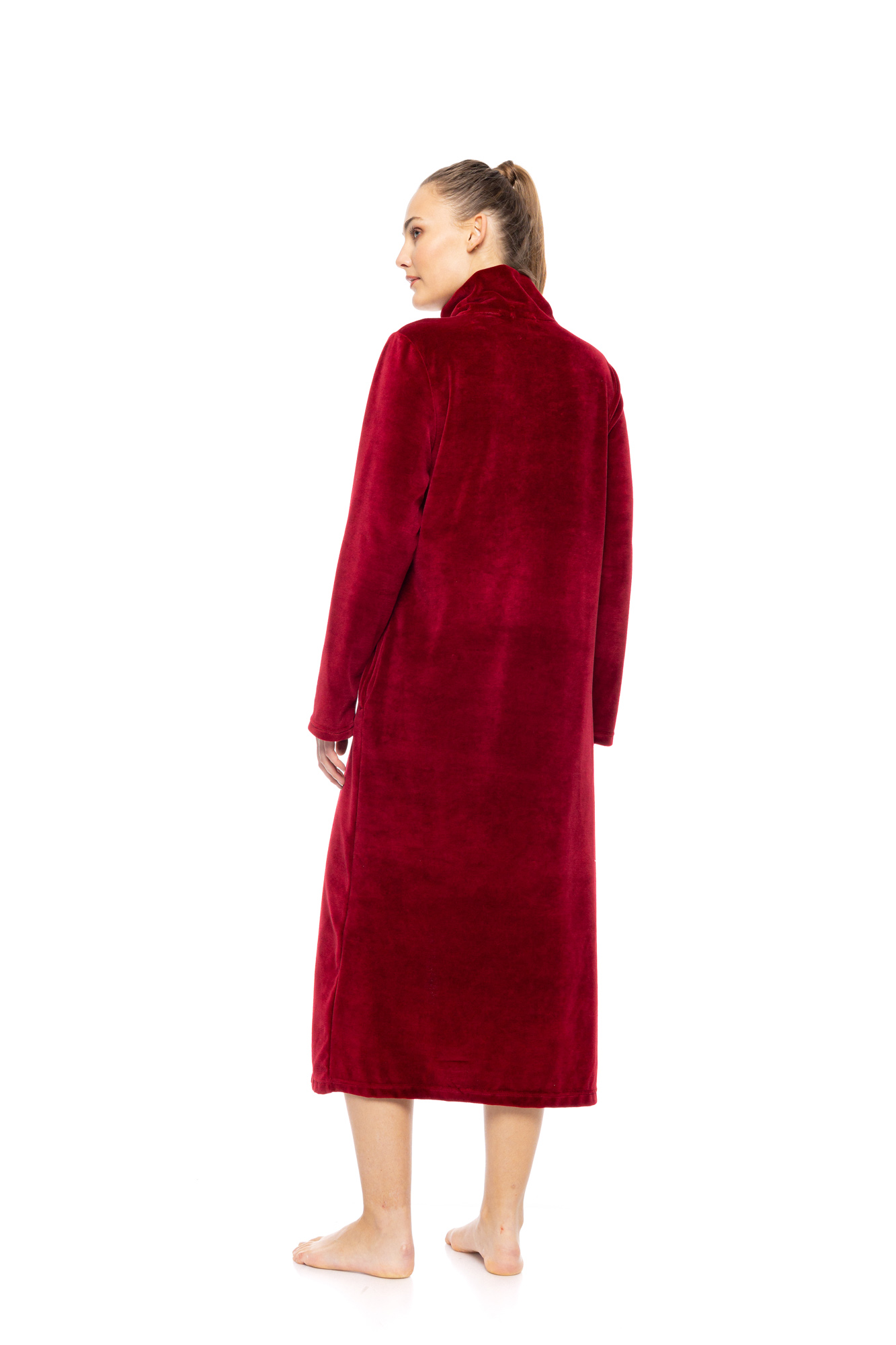 Γυναικεία Ρόμπα με μακρύ μανίκι Pink Label. Νεανική μπορντό Ρόμπα μακριά βελουτέ σε ίσια γραμμή κατασκευασμένη από απαλό και ζεστό ύφασμα, τσέπες και κλείσιμο με φερμουάρ.