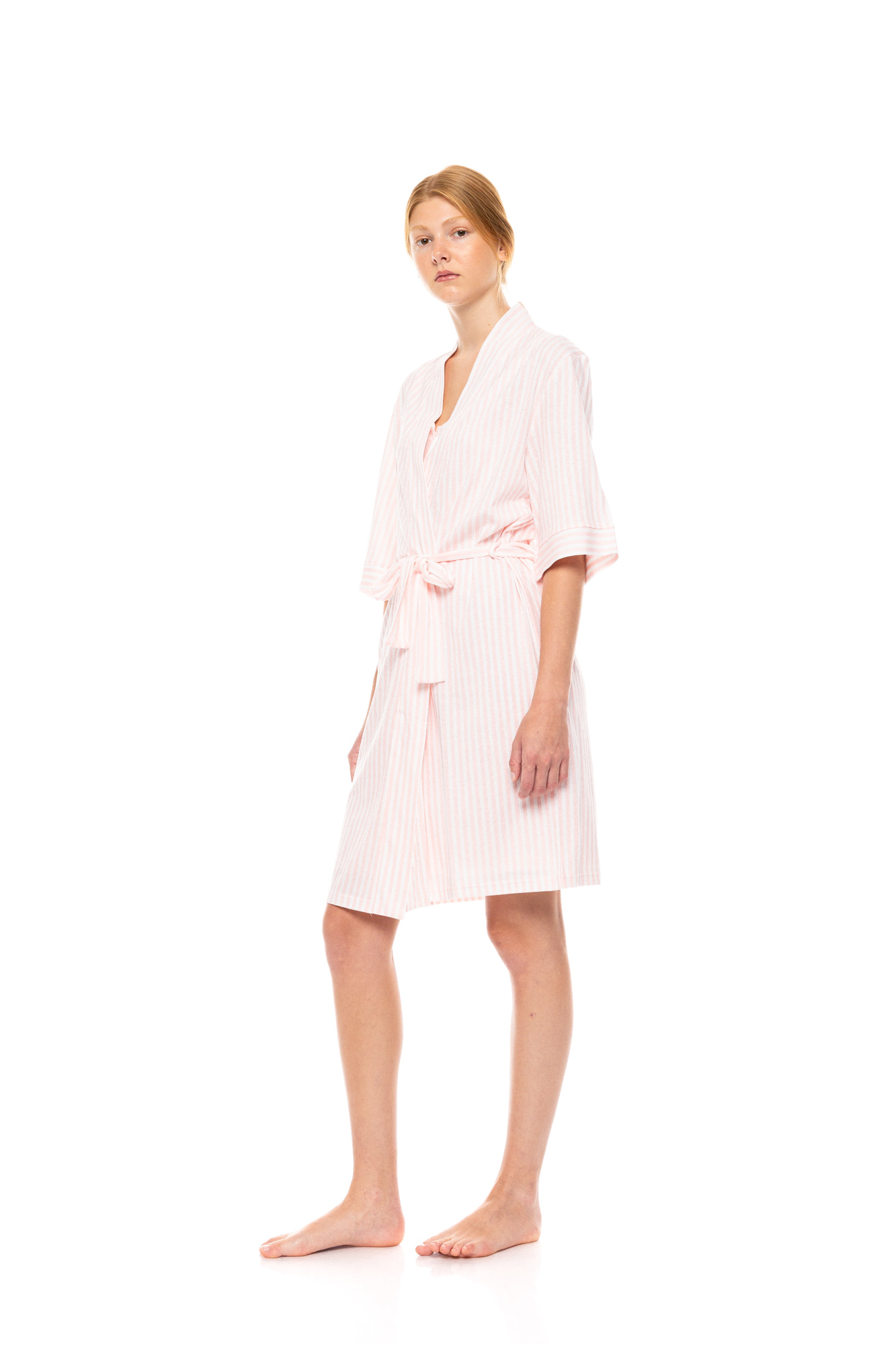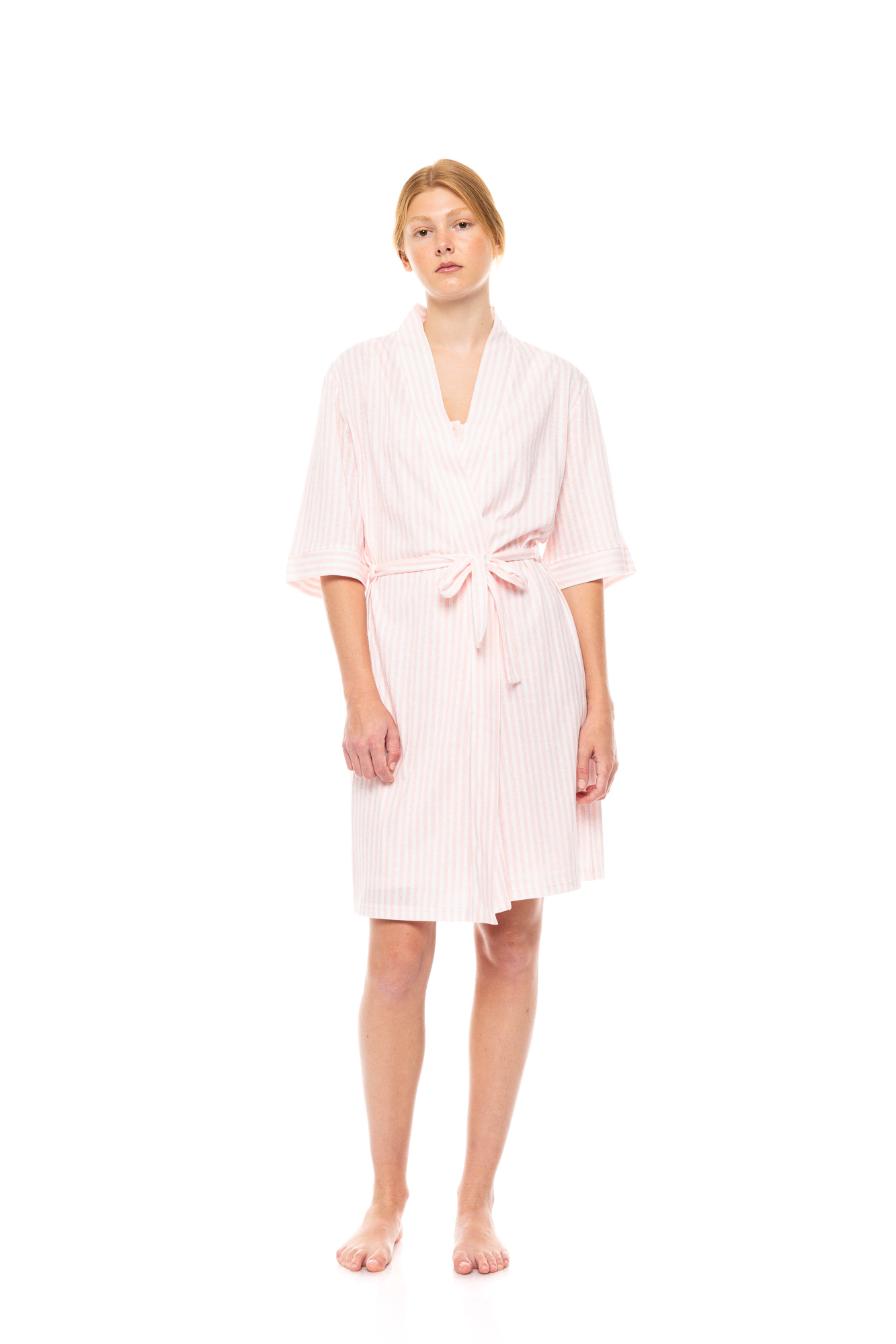 Γυναικεία Ρόμπα Pink Label ροζ ριγέ με σταυρωτό δέσιμο και ζώνη. Νεανική ρόμπα σε ίσια γραμμή με 3/4 μανίκια και βολάν στο τελείωμα τους. Ιδανική επιλογή για το μαιευτήριο και την περίοδο της εγκυμοσύνης.