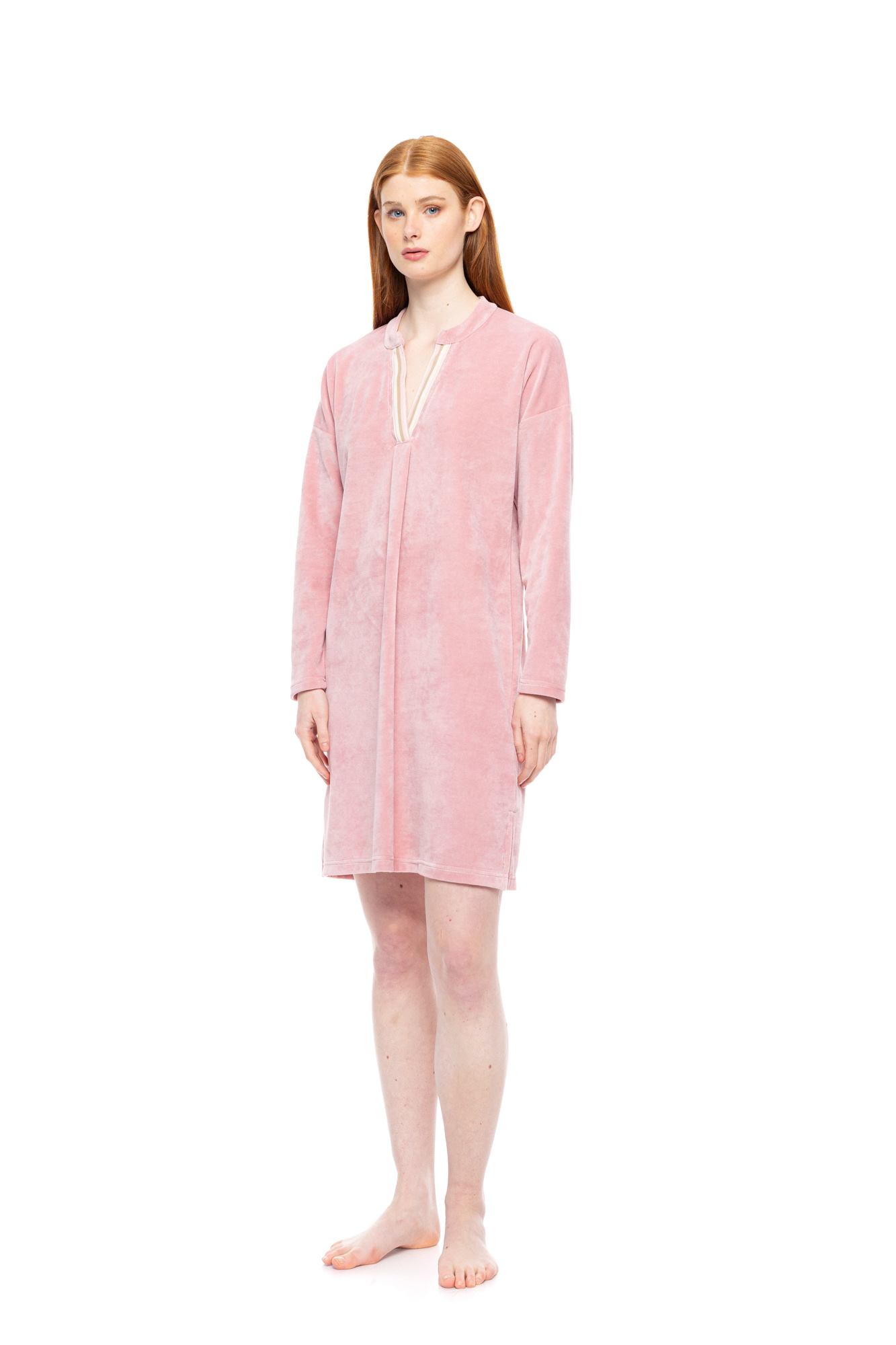 Γυναικείο φόρεμα βελουτέ Pink Label σε Dusty Pink χρώμα με V άνοιγμα στην λαιμόκοψη, διακοσμημένο με λευκές και ροζ ρίγες.