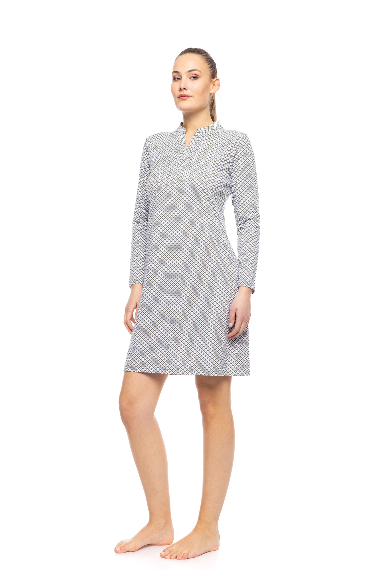 Γυναικείο mini νυχτικό Pink Label. Μακρυμάνικο νυχτικό γεωμετρικό print σε γκρί , μπλε και πράσινους τόνους, σε άνετη γραμμή με άνοιγμα και κουμπιά στο στήθος.
