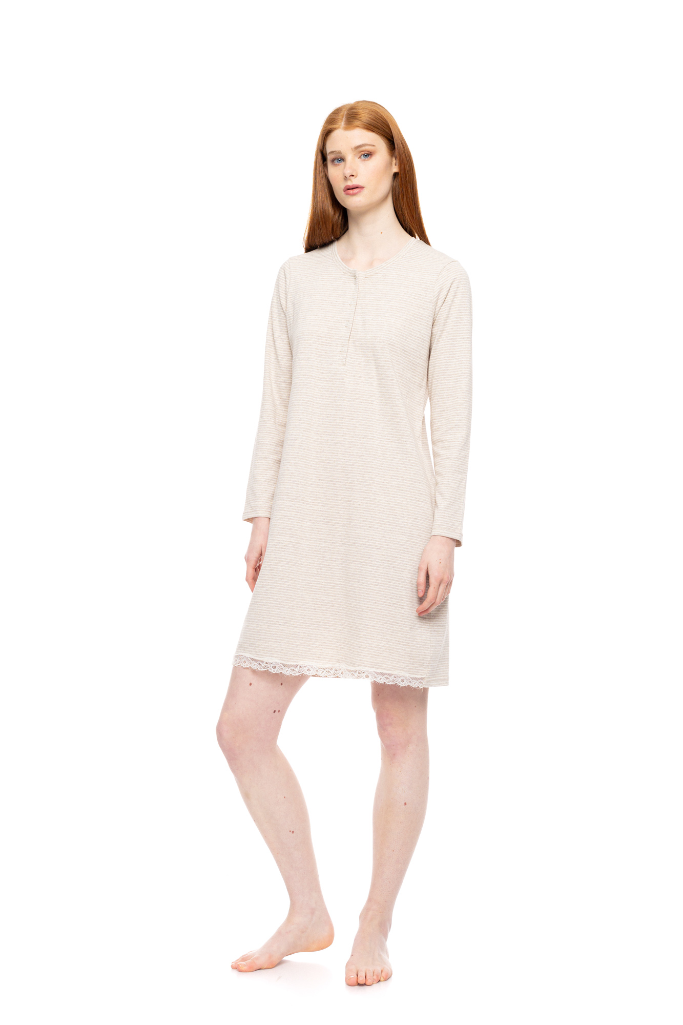 Γυναικείο mini νυχτικό Pink Label. Μακρυμάνικο νυχτικό HAZELNUT STRIPES, σε άνετη γραμμή με στρογγυλή λαιμόκοψη, πατιλέτα και λευκή δαντέλα στο τελείωμα.