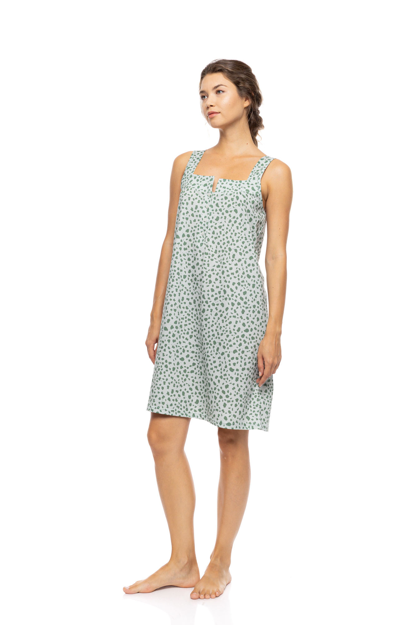 Γυναικείο καλοκαιρινό νυχτικό Pink Label. Κομψό νυχτικό Με φαρδιές Τιραντες  - πατιλέτα σε ίσια γραμμή με  λαιμόκοψη. Το απόλυτο δροσερό βαμβακερό υφάσμα σε συνδυασμό με το γήινο χρώμα JADE LEO  το καθιστά ιδανίκο για όλο το καλοκαίρι.