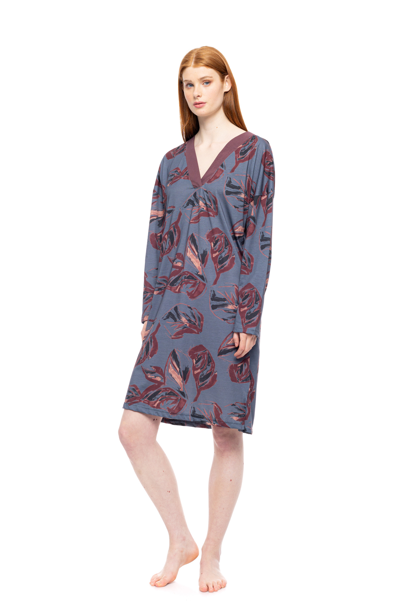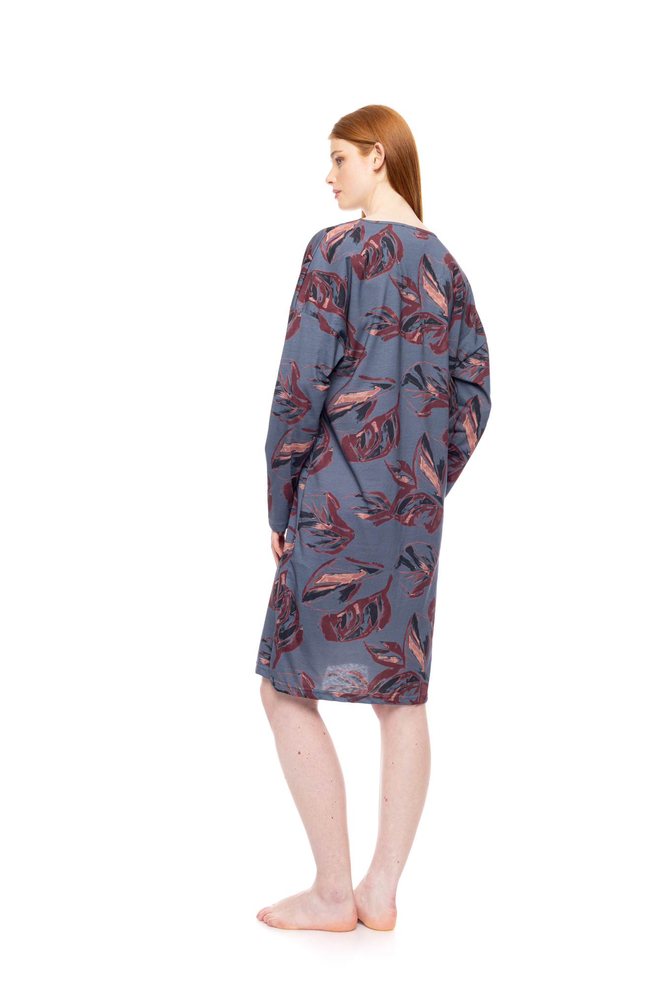 Γυναικείο midi νυχτικό Pink Label με φθινοπωρινά φύλλα σε μπλε φόντο. Μακρυμάνικο νυχτικό, κλασικό με V λαιμόκοψη σε άνετη γραμμή.