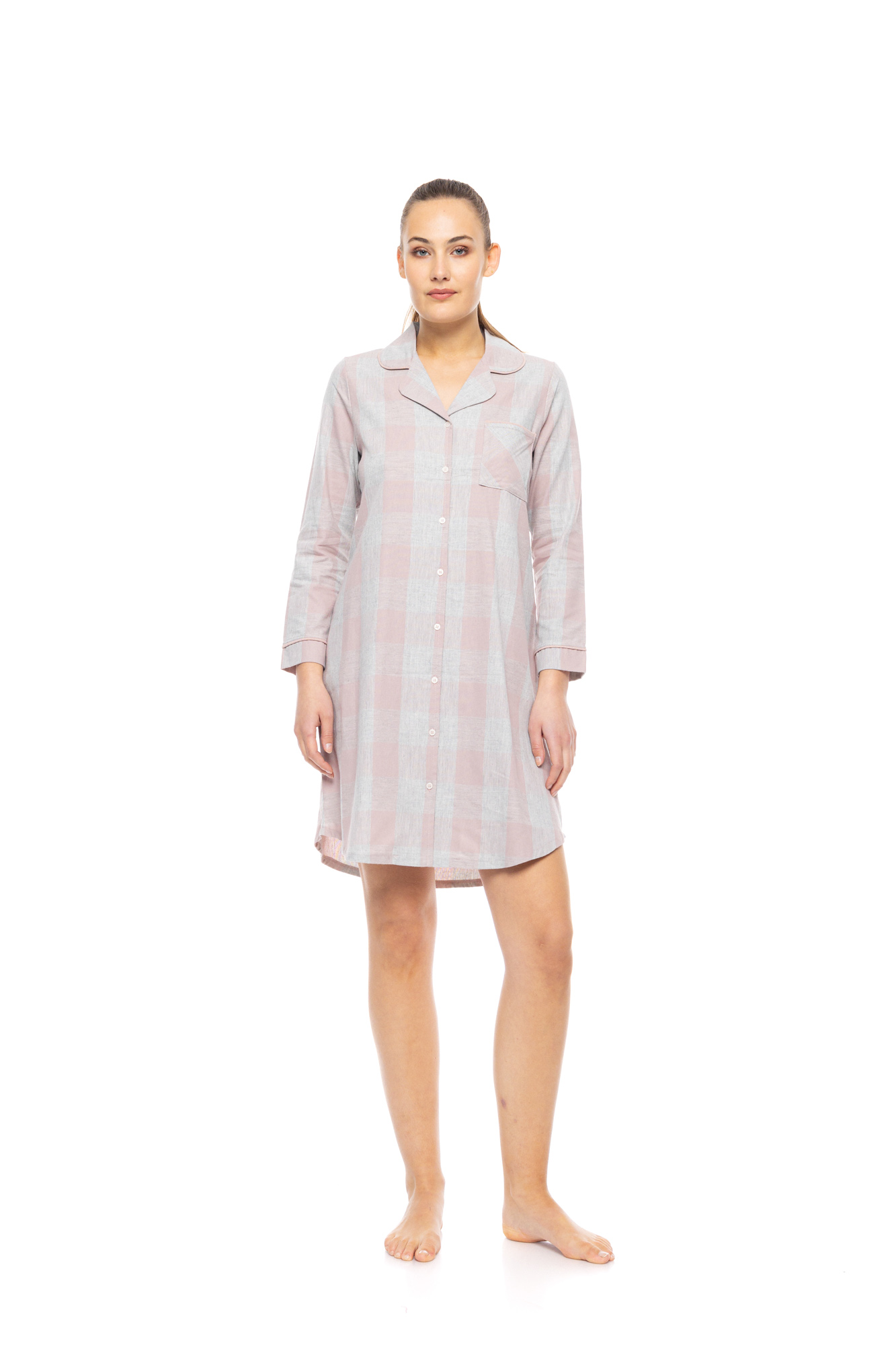 Γυναικείο mini νυχτικό Pink Label απαλό ροζ. Μακρυμάνικο σεμιζιέ νυχτικό με καρό print, σε άνετη γραμμή με γιακά και τσέπη.