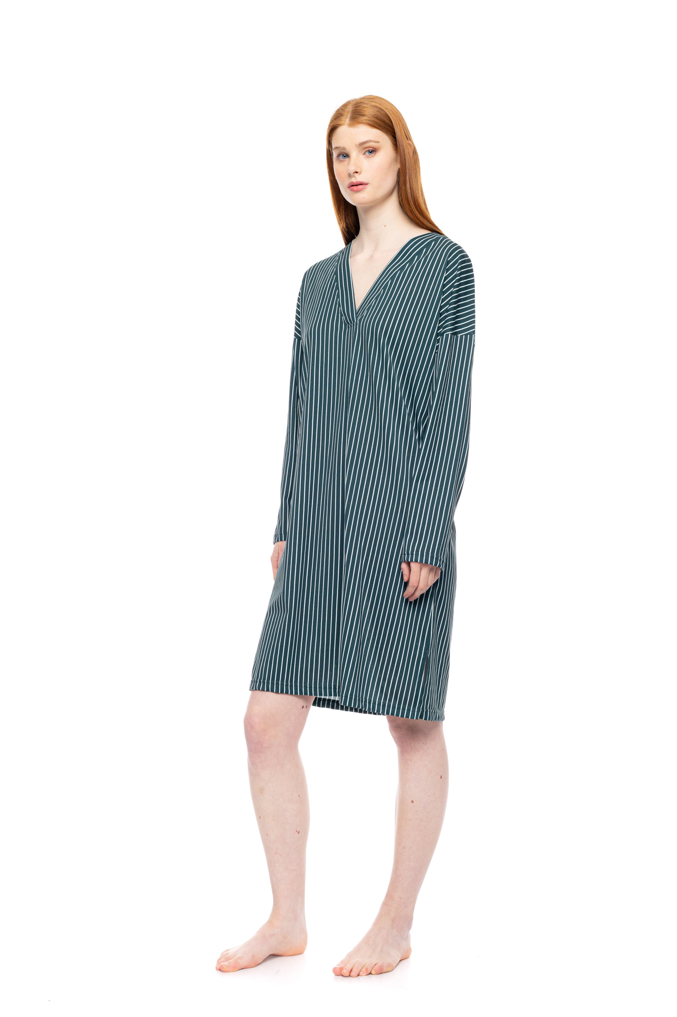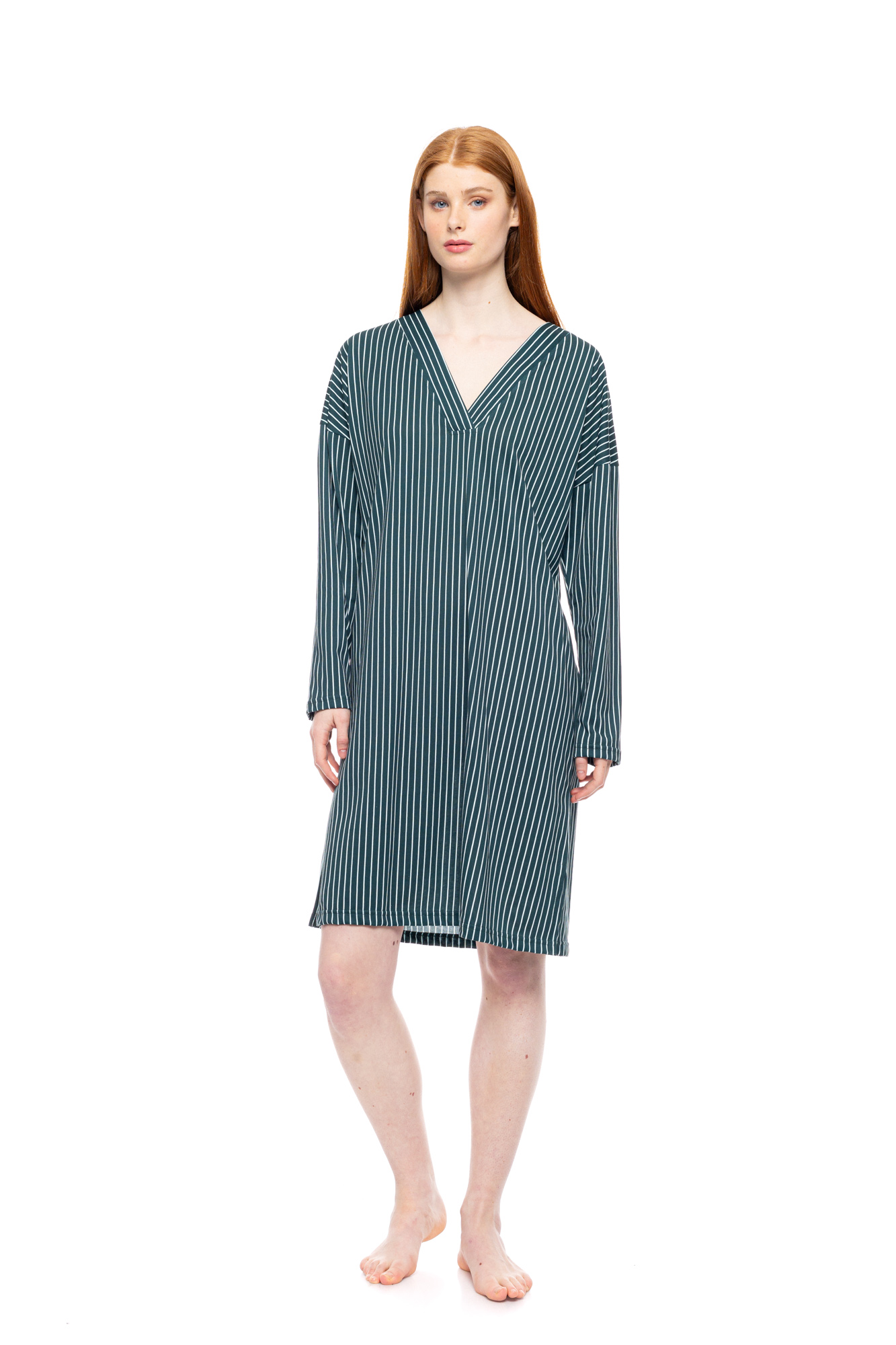 Γυναικείο midi νυχτικό Pink Label. Μακρυμάνικο νυχτικό με Green Forest stipes print, σε άνετη γραμμή με V λαιμόκοψη.