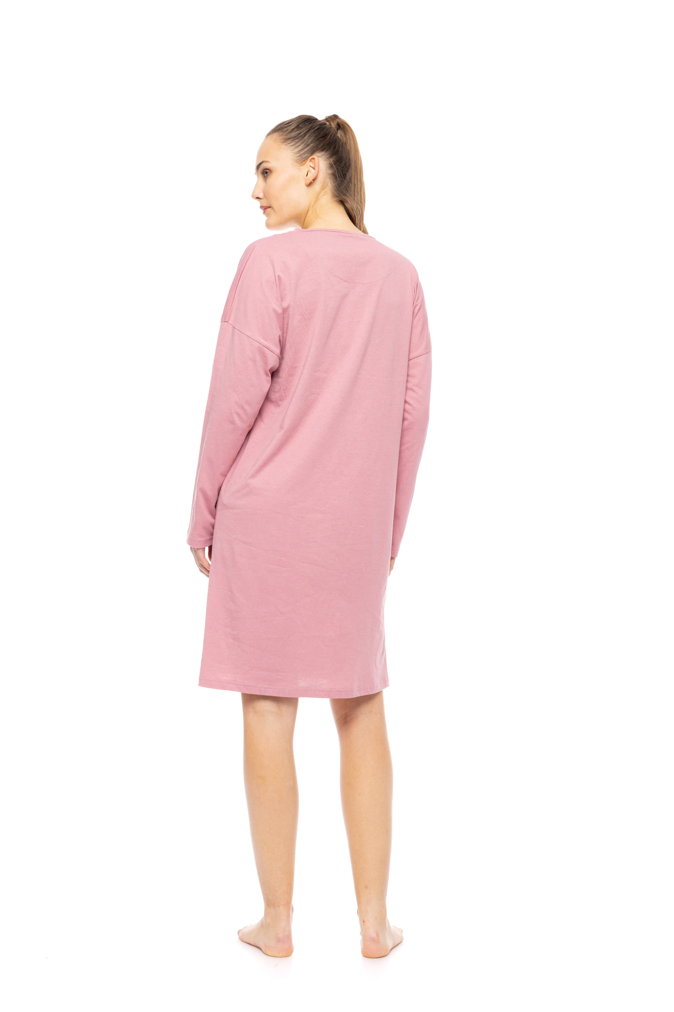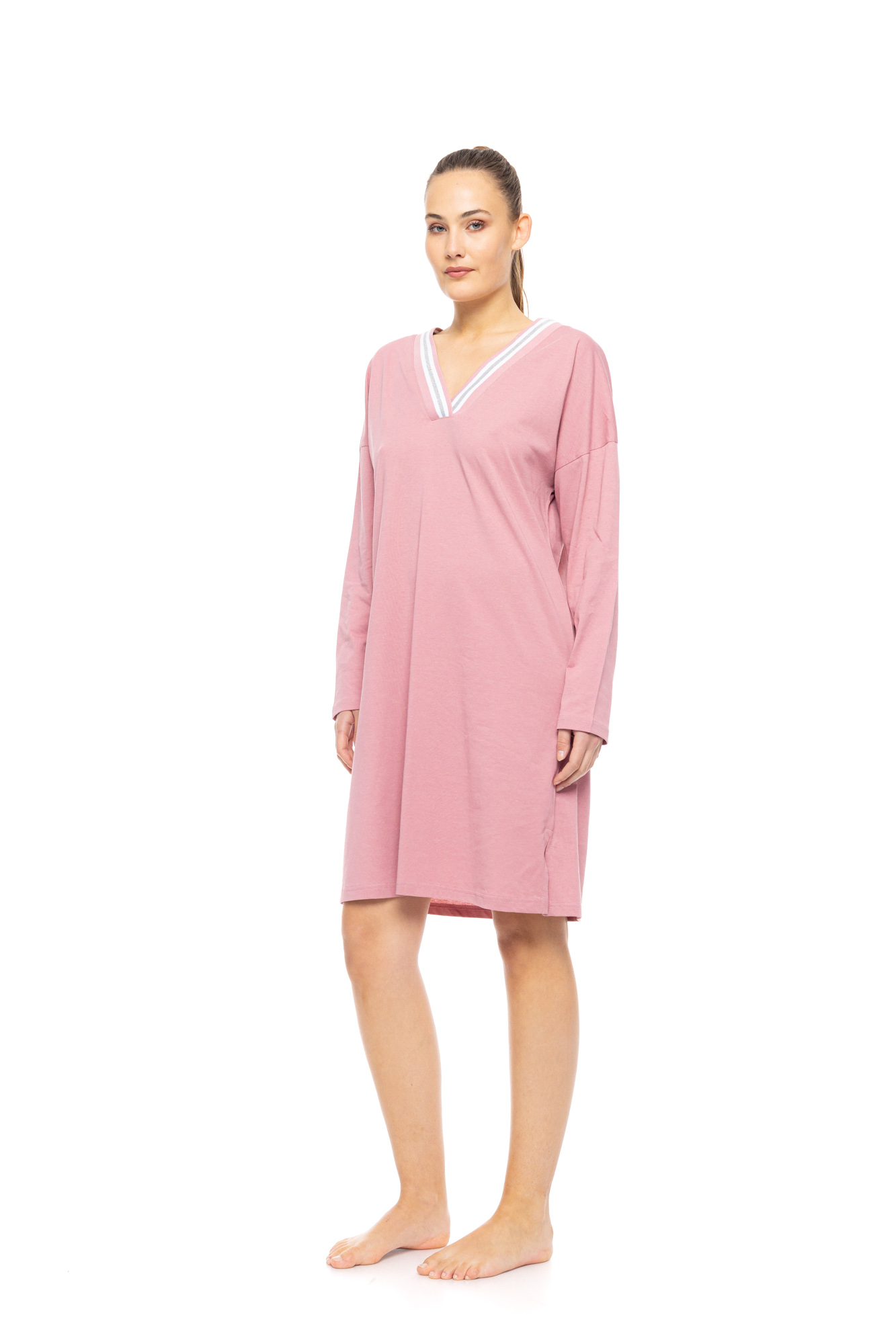 Γυναικείο midi νυχτικό Pink Label. Μακρυμάνικο νυχτικό ροζ, σε άνετη γραμμή με V λαιμόκοψη διακοσμημένη με ασημί και λευκές ρίγες.