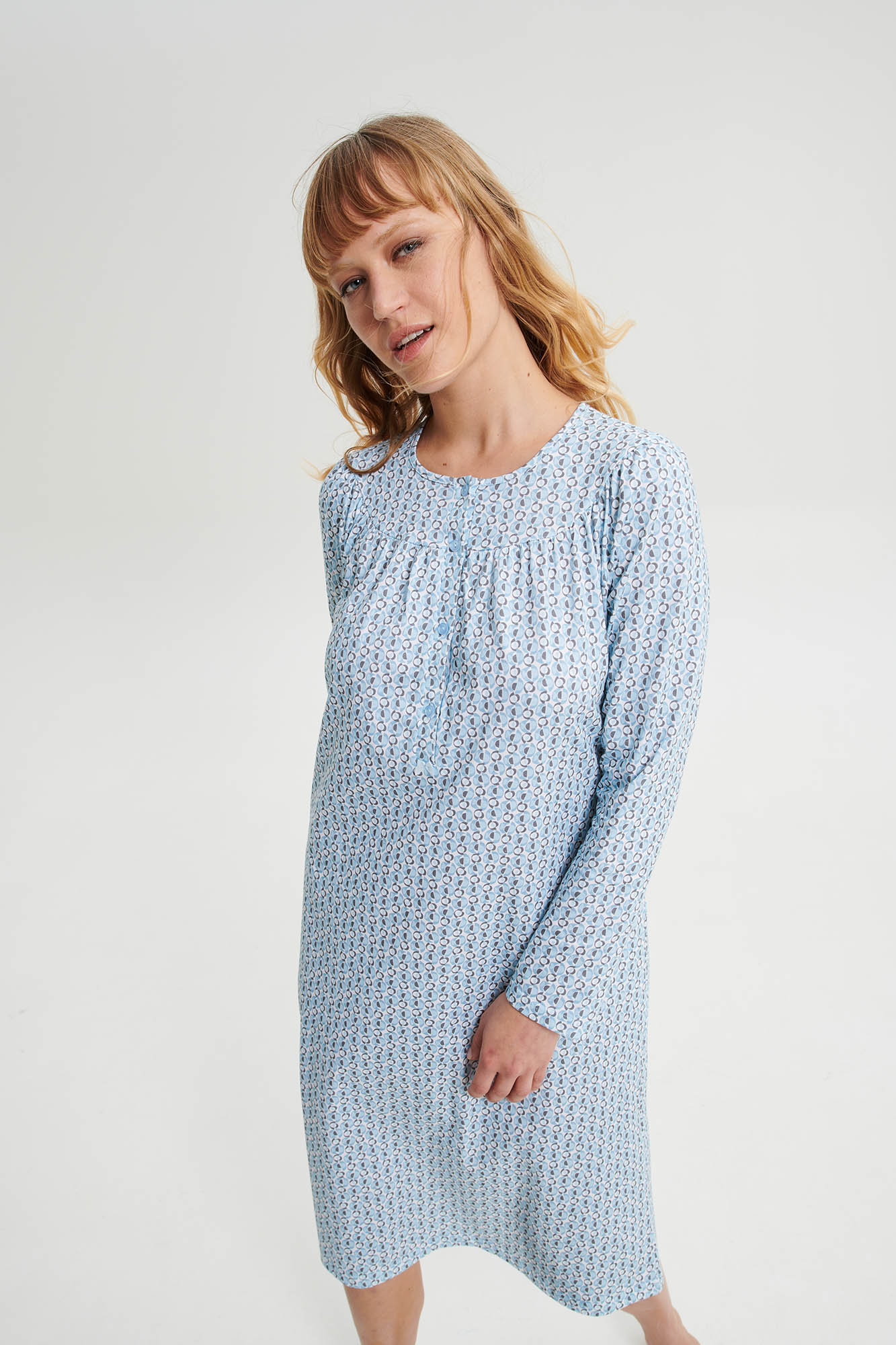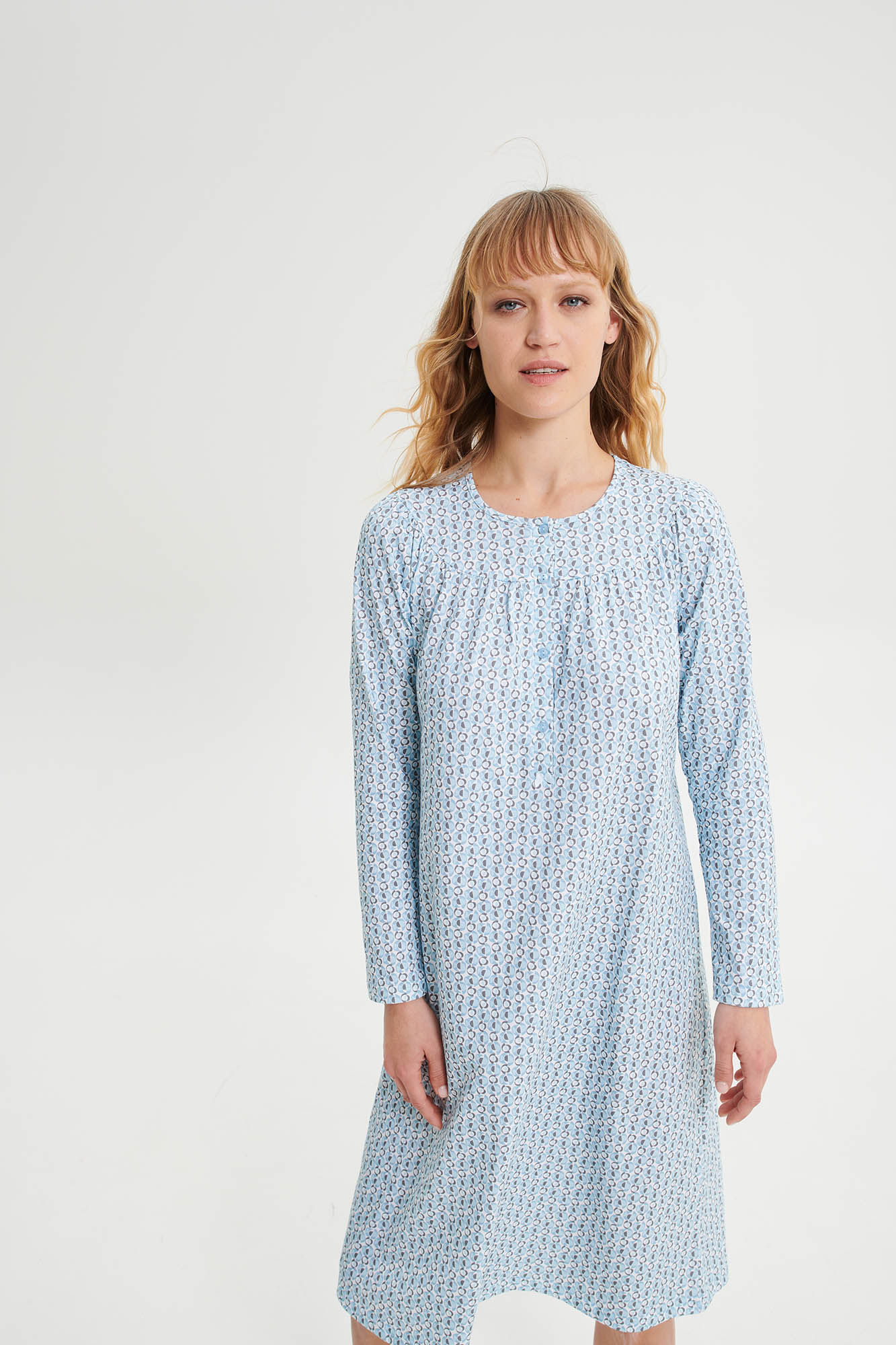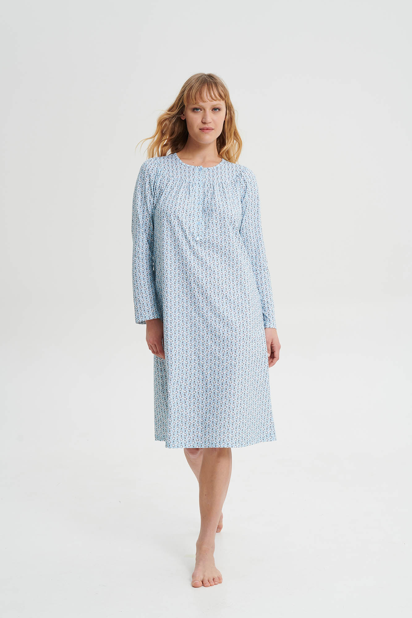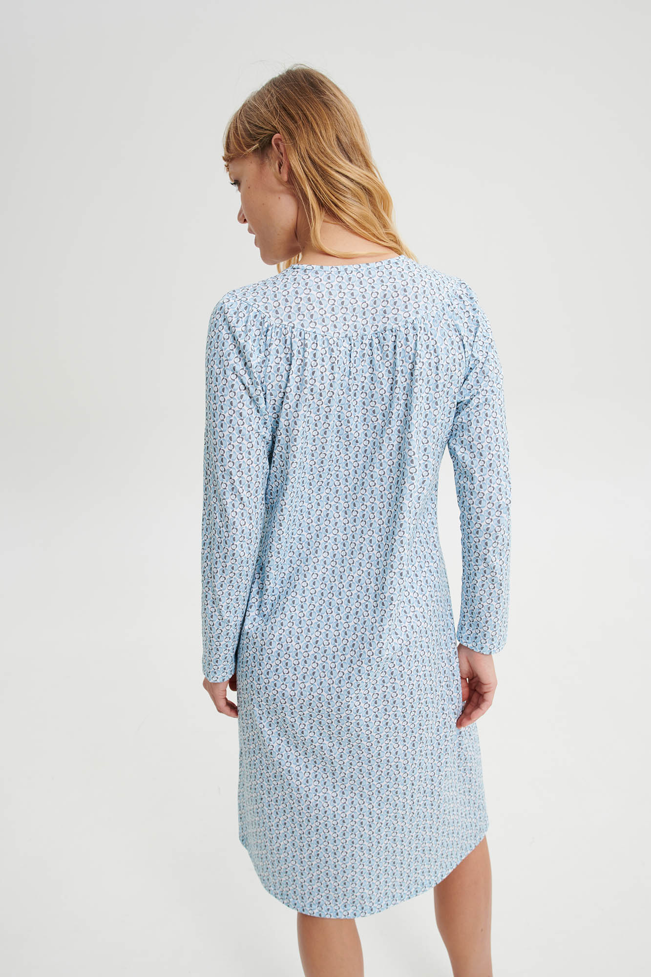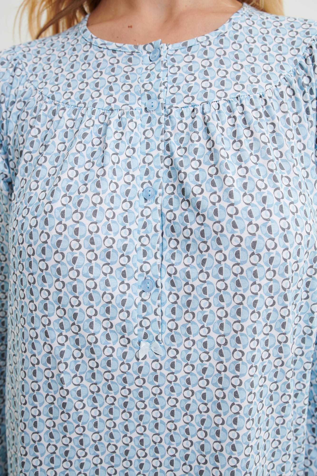Εμπριμέ νυχτικό με πατιλέτα και μακρύ μανίκι σε άνετη γραμμή. Μια πρόταση με κλασικό χαρακτήρα σε γαλάζιες αποχρώσεις.