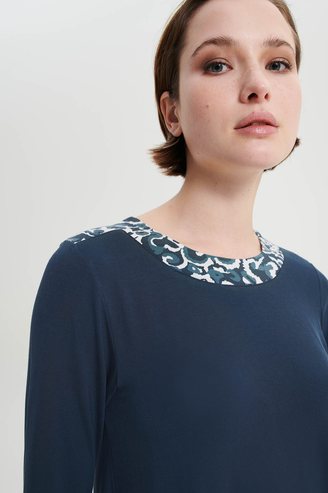 Γυναικεία πυτζάμα με εμπριμέ παντελόνι και στρογγυλή λαιμόκοψη σε άνετη γραμμή. Μια όμορφη πρόταση σε μπλε αποχρώσεις που θα φορέσετε όλη την ημέρα.