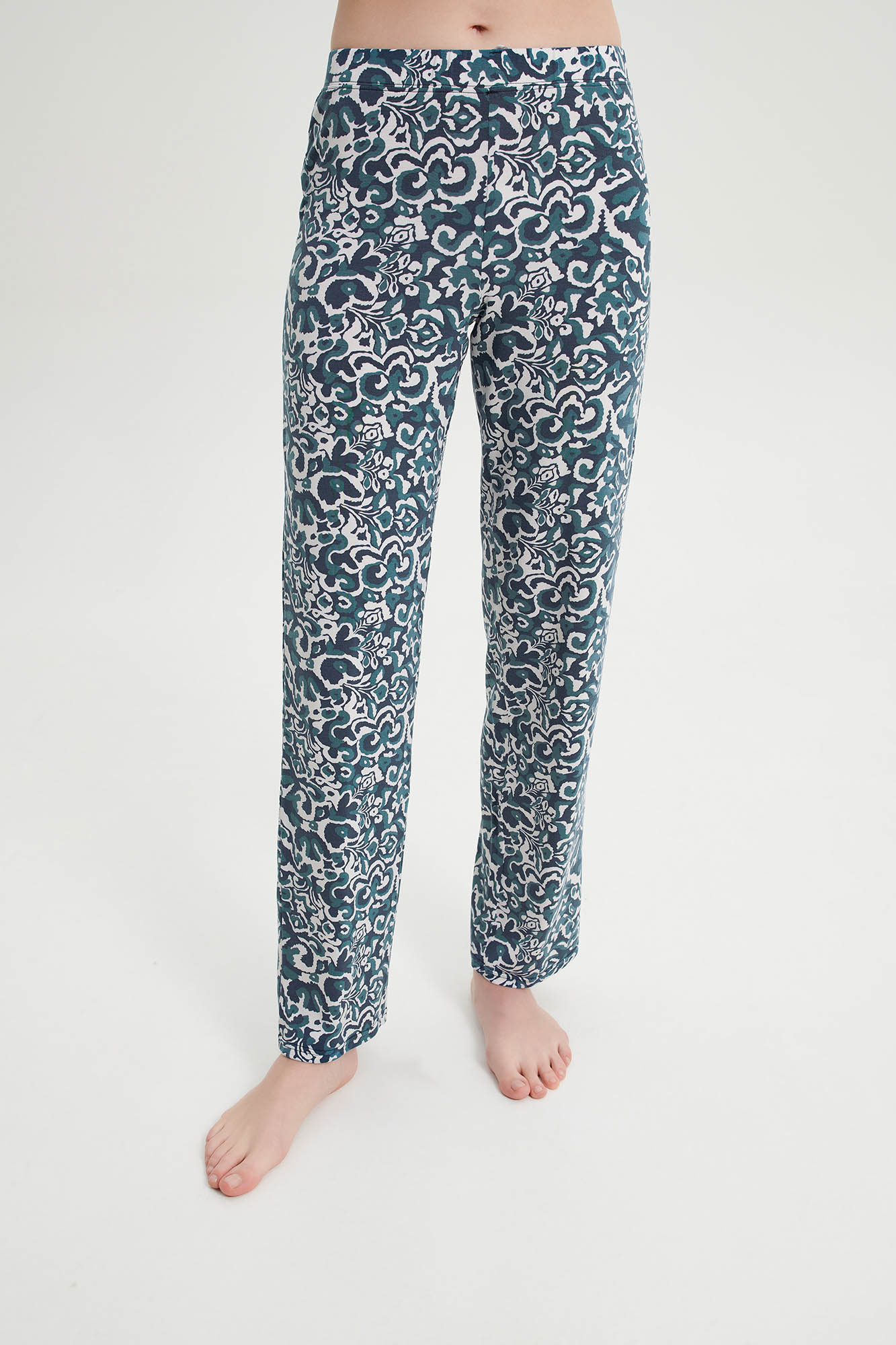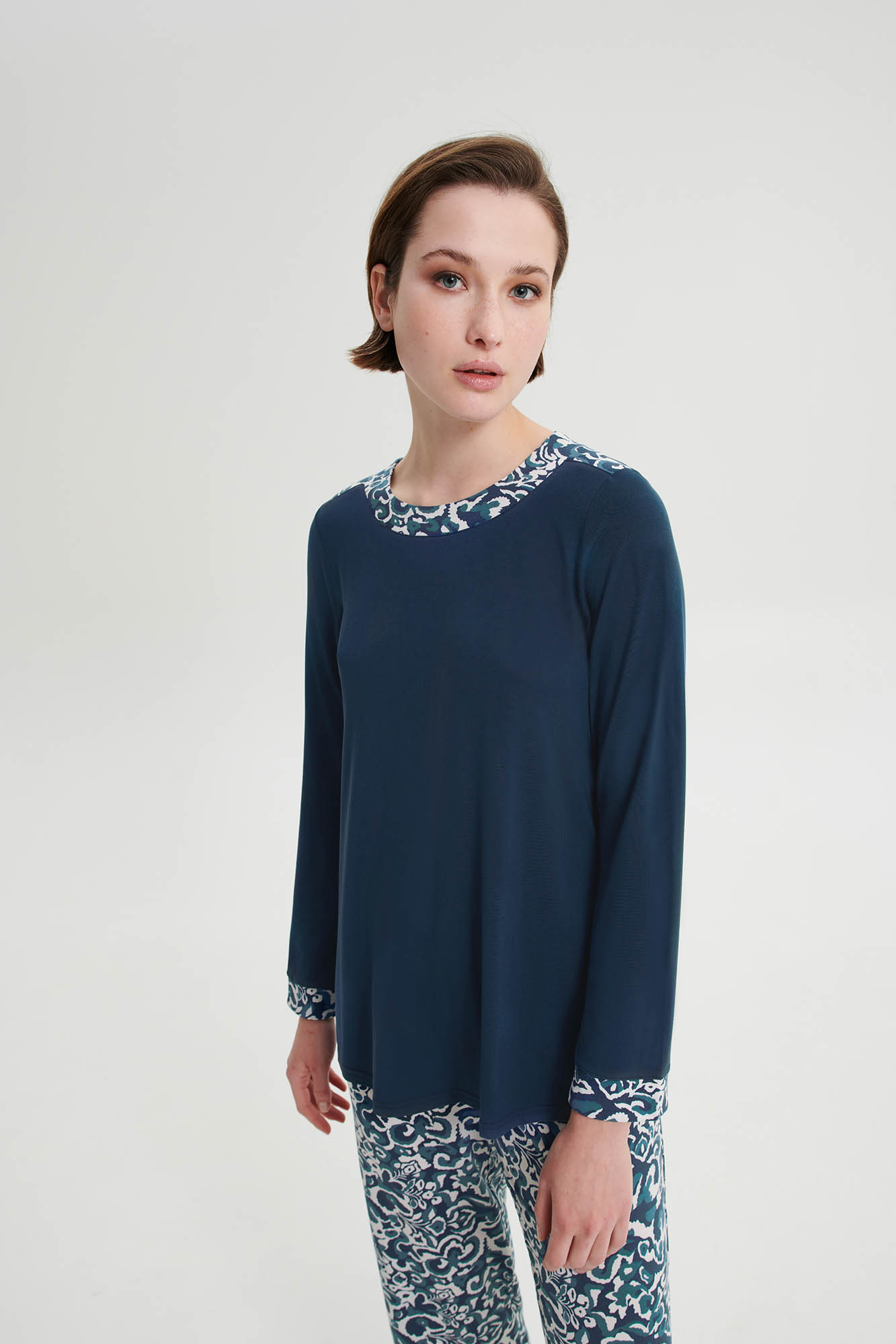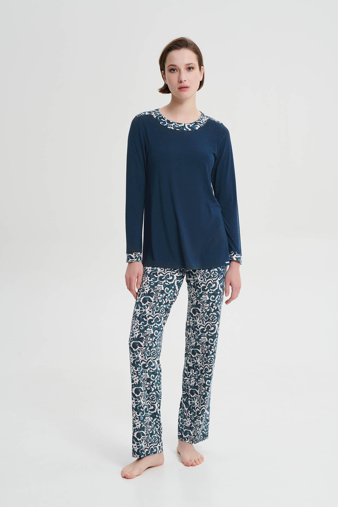 Γυναικεία πυτζάμα με εμπριμέ παντελόνι και στρογγυλή λαιμόκοψη σε άνετη γραμμή. Μια όμορφη πρόταση σε μπλε αποχρώσεις που θα φορέσετε όλη την ημέρα.