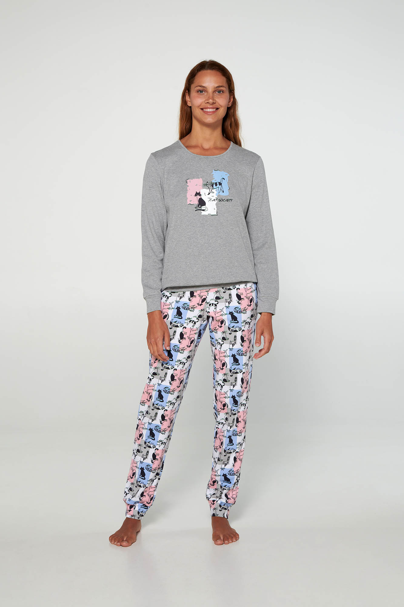 Γυναικεία πυτζάμα με στρογγυλή λαιμόκοψη και εμπριμέ παντελόνι με λάστιχο. Φτιαγμένη από βαμβάκι, θα φορεθεί με ευχαρίστηση στο σπίτι.