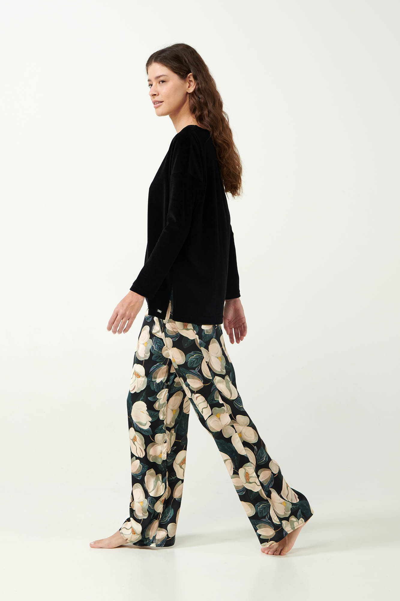 Αυτό το γυναικείο σετ πιτζάμες συνδυάζει ένα μονόχρωμο μαύρο τοπ από βελούδο με ένα φαρδύ παντελόνι σε φλοράλ μοτίβο με ανθισμένες μανόλιες. Το πάνω μέρος προσφέρει μαλακή και ζεστή αίσθηση ενώ το παντελόνι από σατέν viscose δίνει μια απαλή σα μετάξι αίσθηση στο δέρμα. Η αντίθεση των χρωμάτων και τον διαφορετικών υφών δημιουργεί ένα ιδιαίτερο και κομψό σύνολο που θα σας εξασφαλίσει την άνεση που αναζητάτε καθ’ όλη τη διάρκεια της ημέρας.
