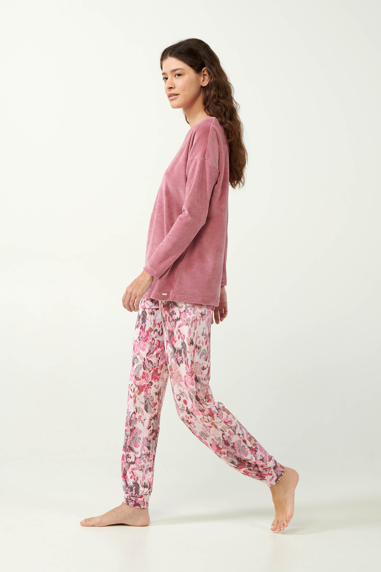 Αγκαλιάστε την κομψότητα που σας προσφέρει αυτό το όμορφο σετ γυναικείς πυτζάμες. Αποτελείται από ένα μονόχρωμο τοπ φτιαγμένο από απαλό βελούδο που συνδυάζεται αρμονικά με ένα micromodal φλοράλ παντελόνι με μανσέτες. Σχεδιασμένο για χαλαρές στιγμές στο σπίτι, θα σας προσφέρει μια κομψή εμφάνιση και άνεση που διαρκεί. Προσθέστε στη συλλογή σας ένα σετ που θα απολαύσετε για χρόνια.