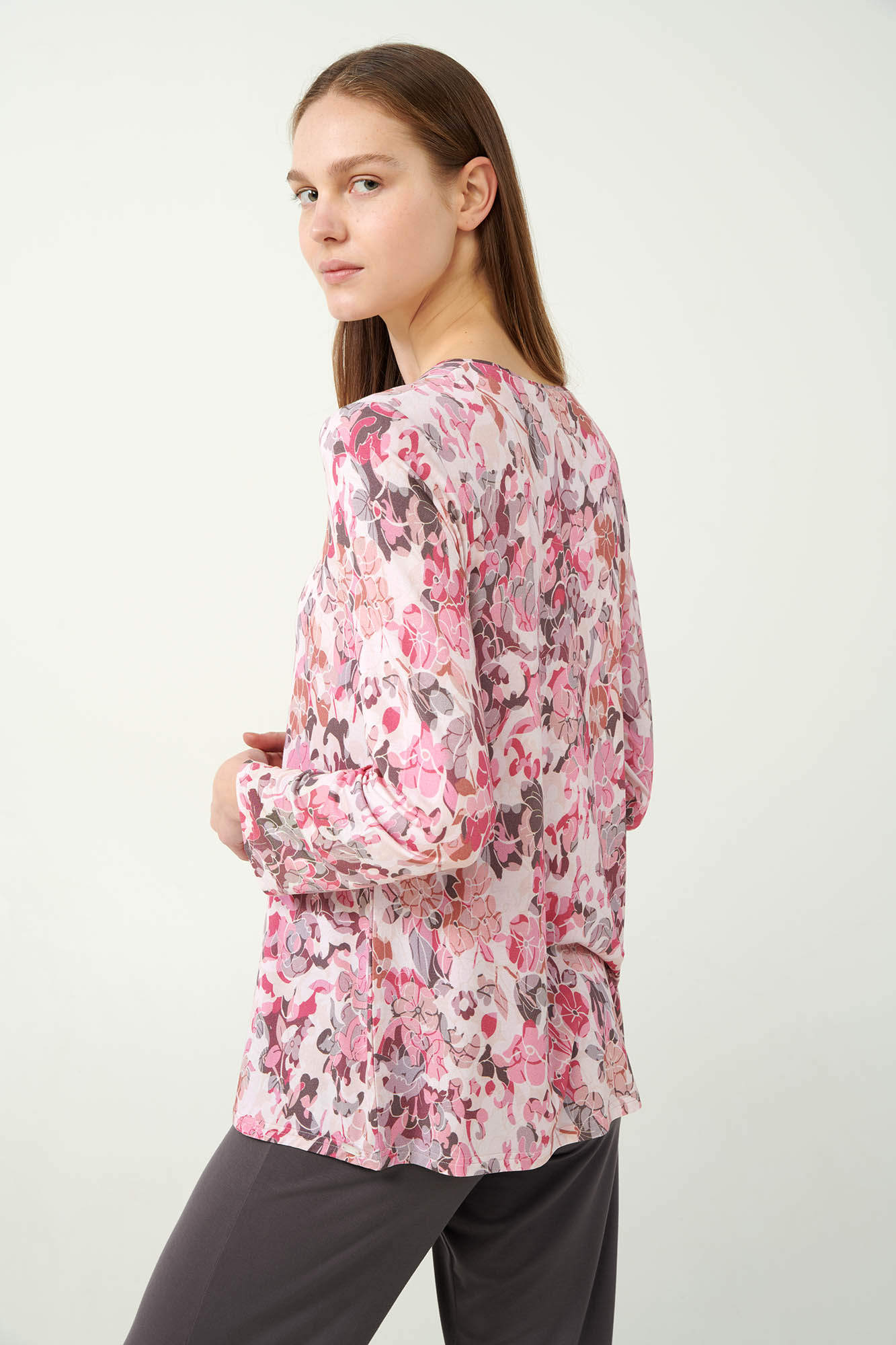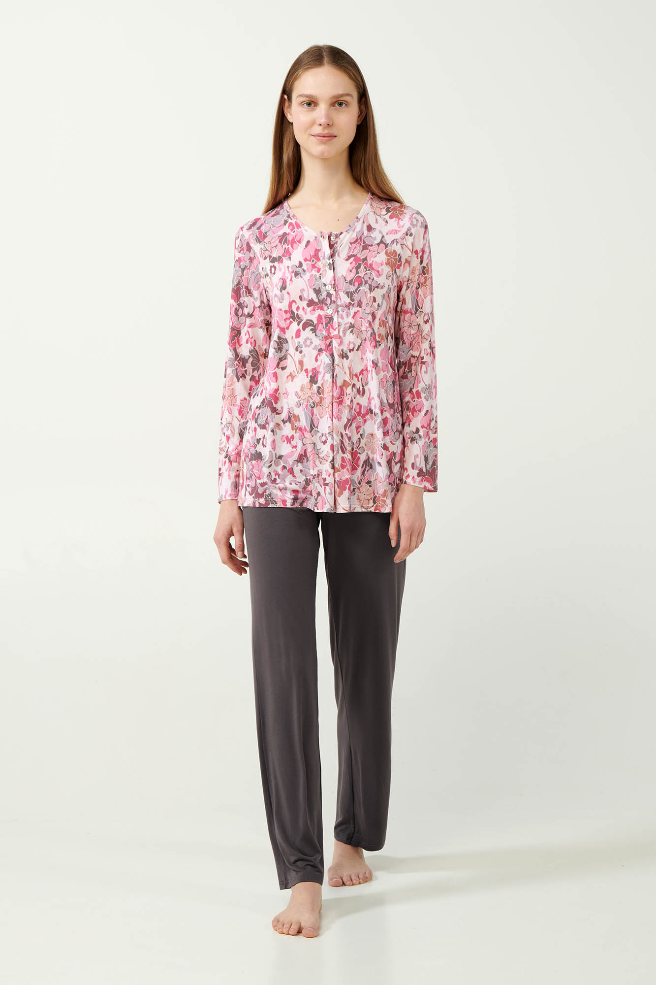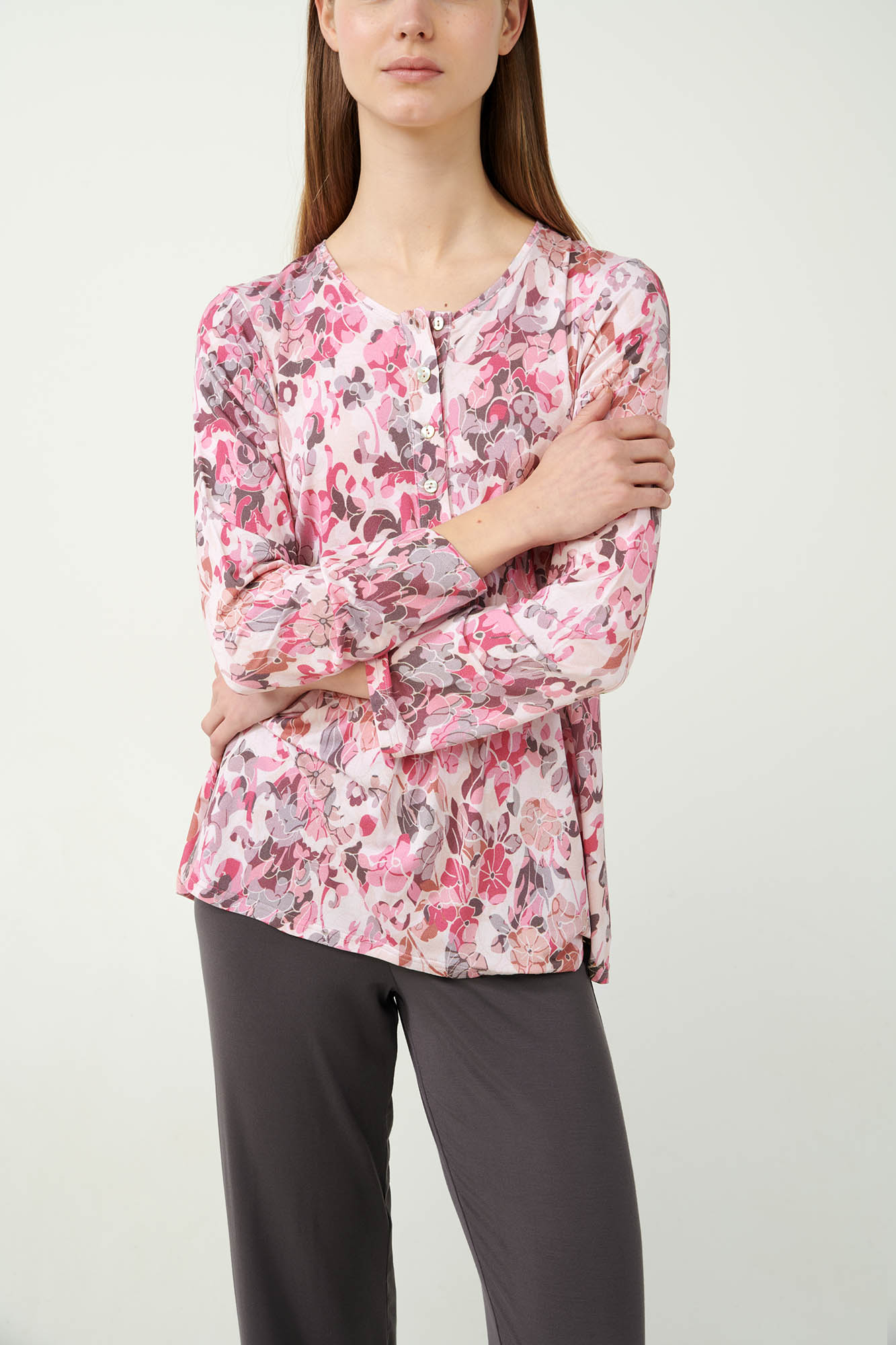 Απολαύστε έναν ιδανικό συνδυασμό στυλ και άνεσης με ένα σετ γυναικείες πυτζάμες. Φλοράλ μπλούζα με πατιλέτα και πιέτα που προσδίδει κομψότητα και μεγαλύτερη ελευθερία κινήσεων σε απαλές ρόζ αποχρώσεις. Το σετ συμπληρώνει ένα μονόχρωμο παντελόνι που δημιουργεί μια αρμονική αντίθεση χρωμάτων. Φτιαγμένες από απαλό micromodal με πολυτελές άγγιγμα αυτές οι πυτζάμες θα συνοδεύσουν ευχάριστα τις στιγμές χαλάρωσης ή το βραδινό σας ύπνο.