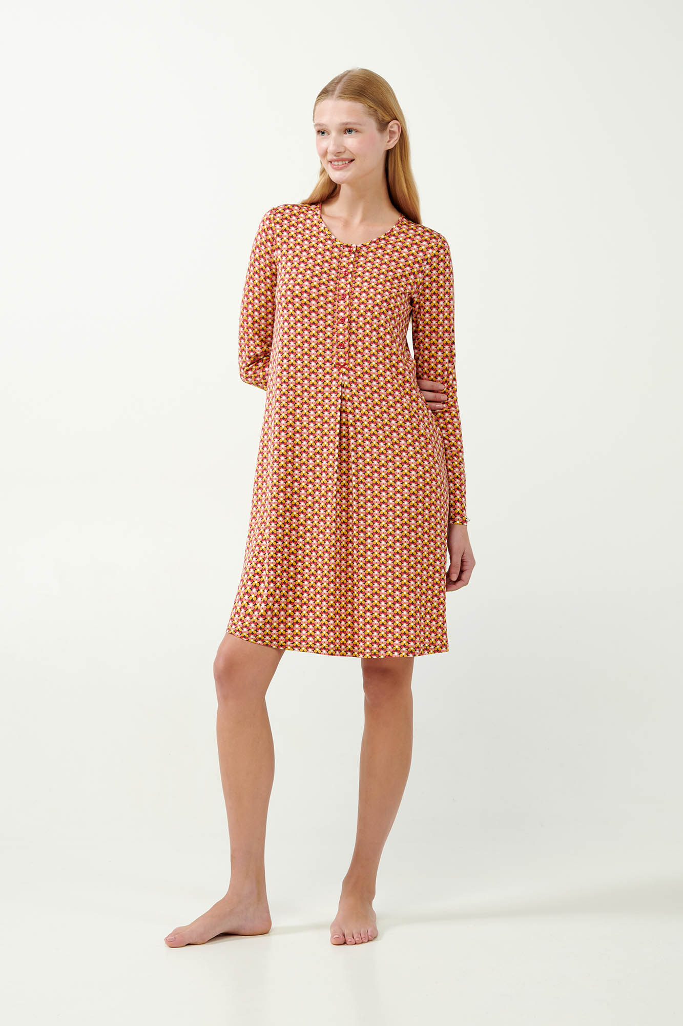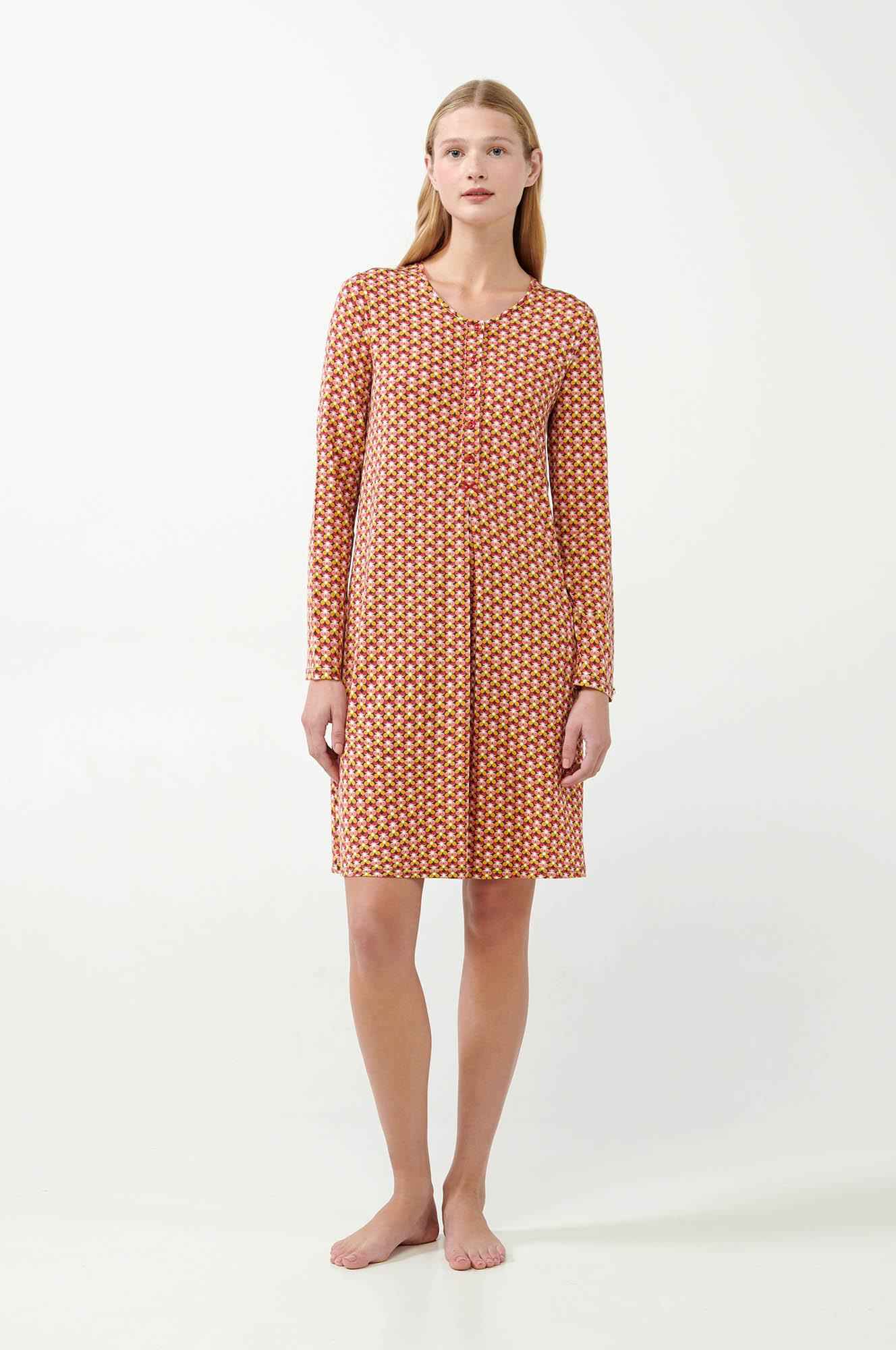 Απολαύστε τη διαχρονική γοητεία που προσφέρει αυτό το νυχτικό με ένα γεωμετρικό φλοράλ μοτίβο. Ένα κλασικό σχέδιο με πρακτική πατιλέτα και πιέτα μπροστά για μεγαλύτερη άνεση και ευκολία. Κατασκευασμένο από micromodal ιδιαίτερα απαλό στην αφή, επιτρέπει στο σώμα να αναπνέει και αγκαλιάζει ευχάριστα το σώμα. Ιδανικό για το βραδινό σας ύπνο ή χαλαρά απογεύματα, αυτό το νυχτικό συνδυάζει κλασικό στυλ και άνεση.