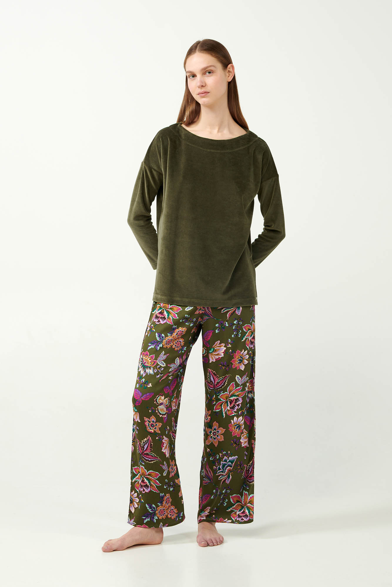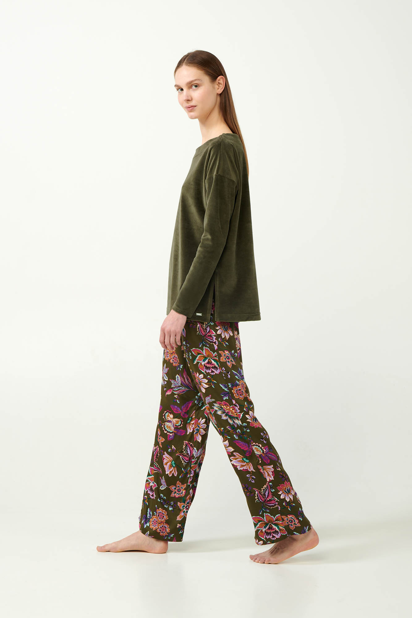 Αφεθείτε στη πολυτελή άνεση που σας προσφέρει αυτό το σετ γυναικείες πυτζάμες. Η μονόχρωμη μπλούζα από βελούδο, σχεδιασμένη σε χαλαρή γραμμή, διαθέτει ένα διακριτικό σκίσιμο στο κάτω μέρος που προσθέτει στυλ και μεγαλύτερη ελευθερία κινήσεων. Το σετ συμπληρώνει ένα φαρδύ παντελόνι σε φλοράλ μοτίβο κατασκευασμένο σε χαλαρή γραμμή από πολυτελή σατέν viscose με απαλή σα μετάξι αίσθηση στο δέρμα. Η αντίθεση των χρωμάτων και τον διαφορετικών υφών δημιουργεί ένα ιδιαίτερο και κομψό σύνολο που θα σας εξασφαλίσει την άνεση που αναζητάτε καθ’ όλη τη διάρκεια της ημέρας.