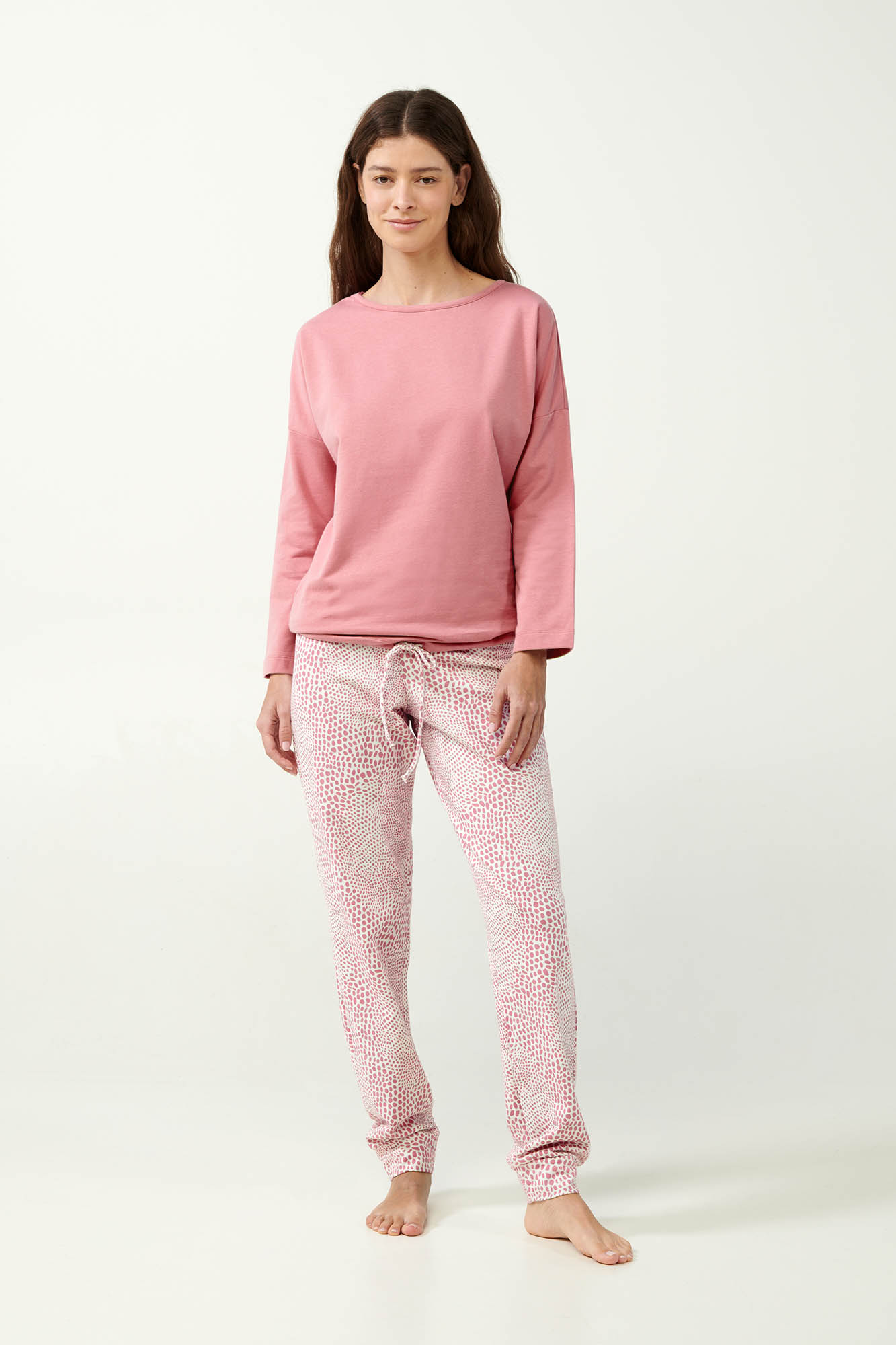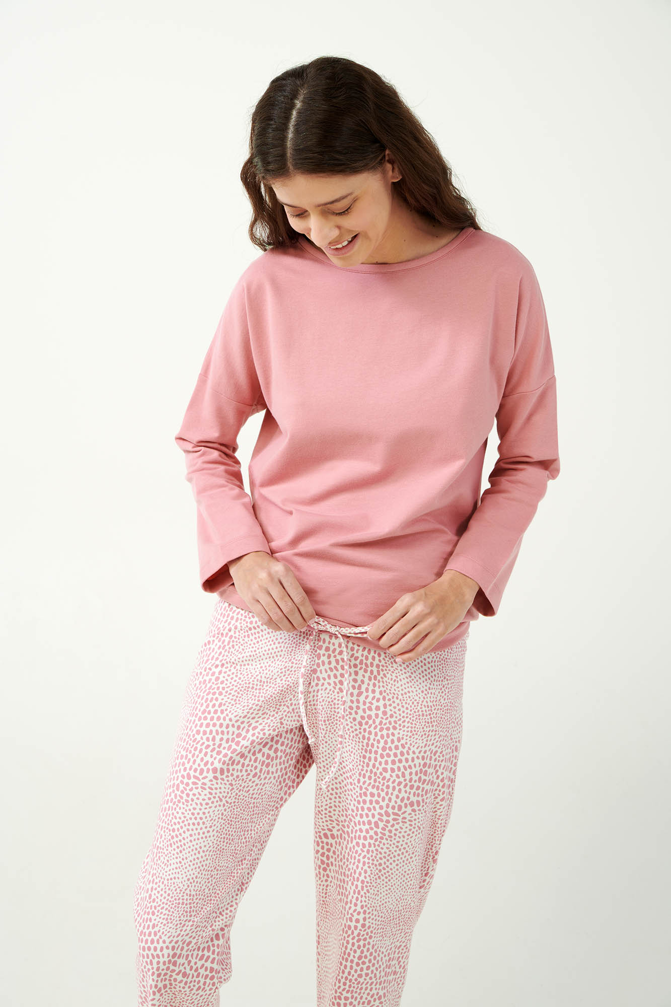 Προσθέστε στη συλλογή σας ένα σετ γυναικείες πυτζάμες σε ροζ αποχρώσεις. Το σετ αποτελείτε από παντελόνι με μανσέτες σε λεοπάρ μοτίβο που συνδυάζεται αρμονικά με ένα μονόχρωμο τοπ. Κατασκευασμένο από 100% βαμβάκι φούτερ θα προσφέρει ζεστή αίσθηση και άνετη εφαρμογή στο σώμα σας. Ένας όμορφος συνδυασμός άνεσης και νεανικής κομψότητας που θα σας κρατήσει ζεστή όλο το χειμώνα.