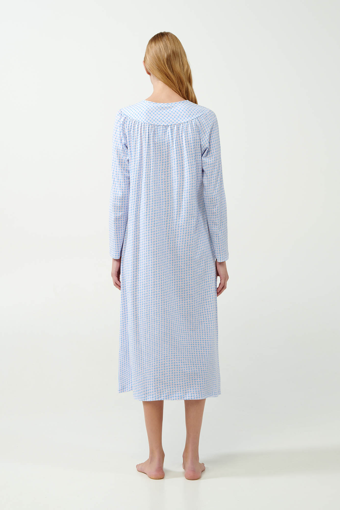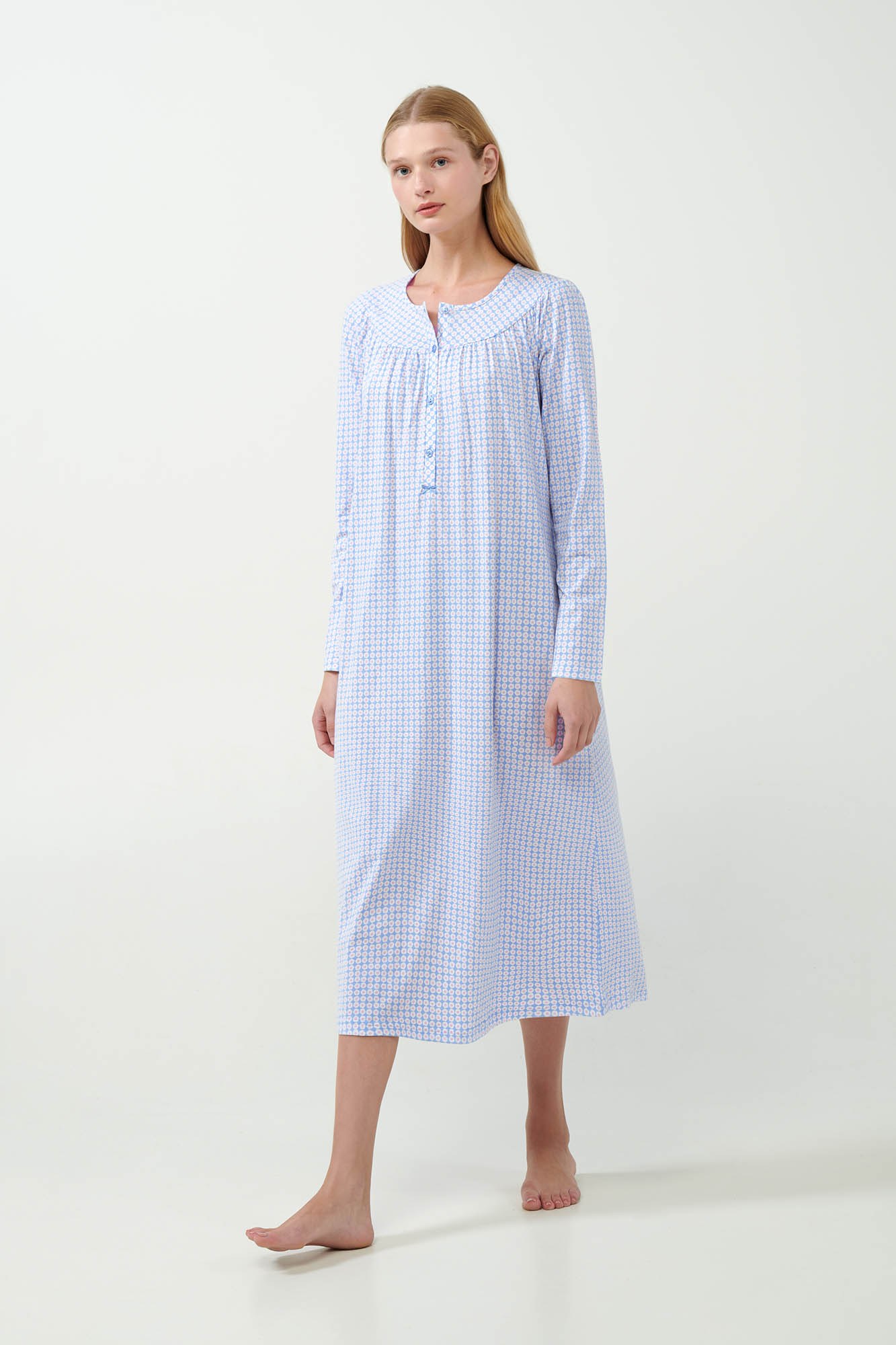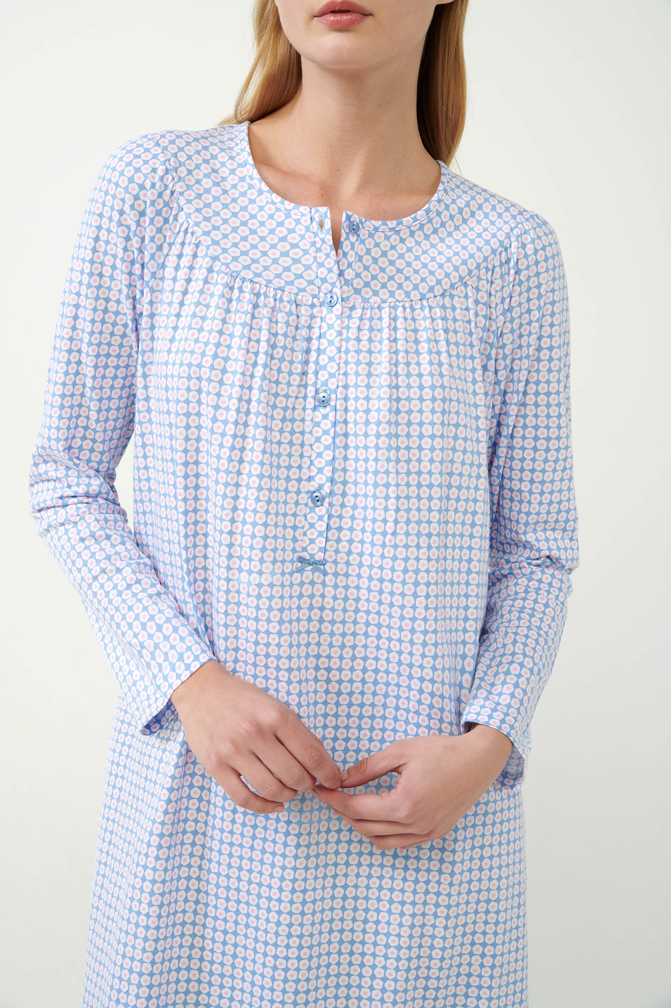 Συμπληρώστε τη συλλογή σας με ένα κλασικό μακρύ νυχτικό σε γεωμετρικό μοτίβο. Σχεδιασμένο σε γαλάζια απόχρωση με πρακτική πατιλέτα στο στήθος και χαλαρή εφαρμογή. Είναι κατασκευασμένο από 100% βαμβάκι jersey που επιτρέπει στο σώμα να αναπνέει, διασφαλίζοντας έναν ξεκούραστο βραδινό ύπνο. Ένας όμορφος συνδυασμός διαχρονικής κομψότητας και άνεσης.