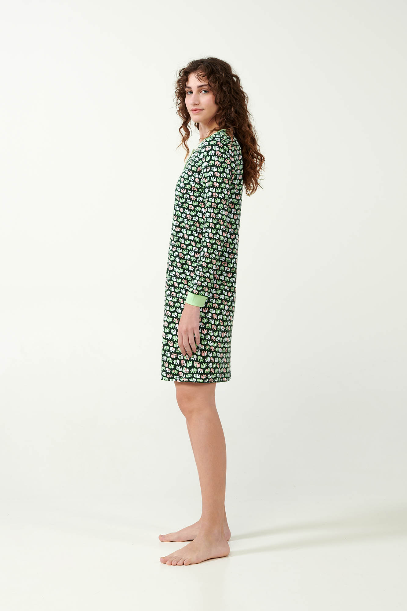 Απολαύστε την γοητεία που σας προσφέρει ένα όμορφο νυχτικό σε βαθύ πράσινο σμαραγδί χρώμα, διακοσμημένο με ένα ιδιαίτερο μοτίβο με ινδικούς ελέφαντες. Κατασκευασμένο από 100% βαμβάκι interlock για απαλό άγγιγμα που διαρκεί στο χρόνο. Ένα σχέδιο με πατιλέτα και μανσέτες στα μανίκια που προσδίδουν μια κλασσική αίσθηση και άνετη εφαρμογή. Μια ιδανική πρόταση για τις στιγμές χαλάρωσης σας το απόγεμα που συνδυάζει την άνεση με ένα όμορφο τύπωμα.