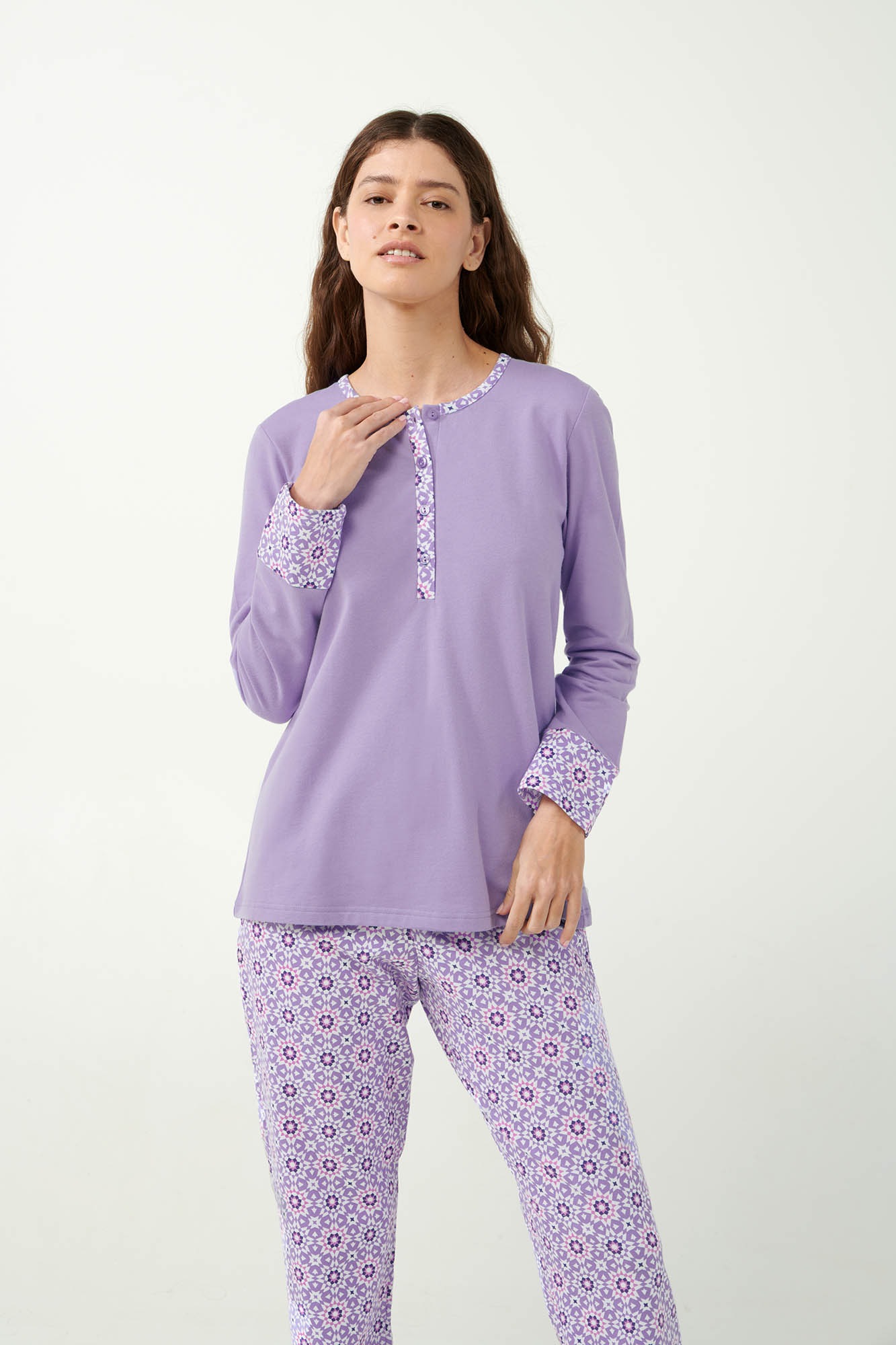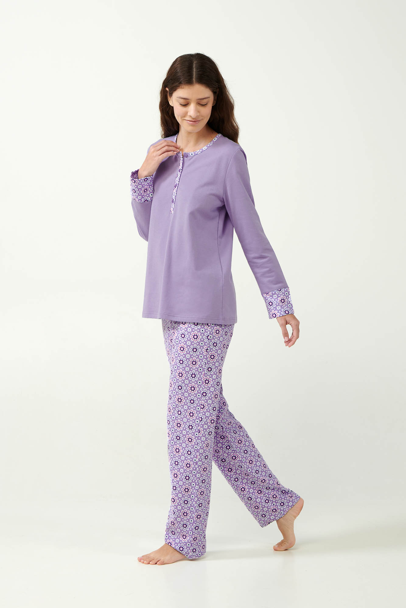 Προσθέστε στη συλλογή σας ένα όμορφο σετ γυναικείες πυτζάμες με σε λιλά αποχρώσεις με μαγευτικό μοτίβο καλειδοσκόπιο. Κατασκευασμένο από 100% βαμβάκι φούτερ που προσφέρει απαλή και ζεστή αίσθηση στο δέρμα. Η κλασική πατιλέτα προσθέτει γοητεία και πρακτικότητα. Σχεδιασμένη σε κανονική γραμμή με μανσέτες στο μανίκι για καλύτερη εφαρμογή. Μια εύκολη επιλογή για άνετες νύχτες και χαλαρά πρωινά.
