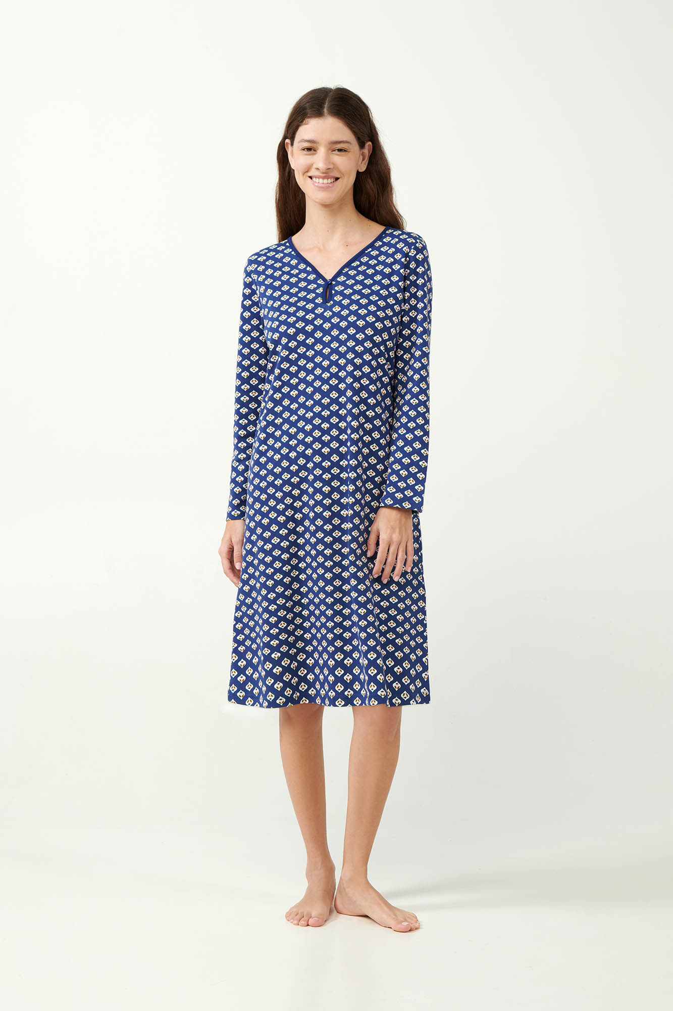 Αγκαλιάστε την διαχρονική άνεση που ας προσφέρει ένα νυχτικό σε καταπραϋντική μπλε απόχρωση και ρουστίκ μοτίβο. Σχεδιασμένο με ιδιαίτερη κουμπωτή V λαιμόκοψη και χαλαρή γραμμή για βέλτιστη εφαρμογή και μέγιστη άνεση. Κατασκευασμένο και επιτρέπει στο σώμα να αναπνέει θα δώσει κομψότητα και άνεση στα απογεύματα σας.
