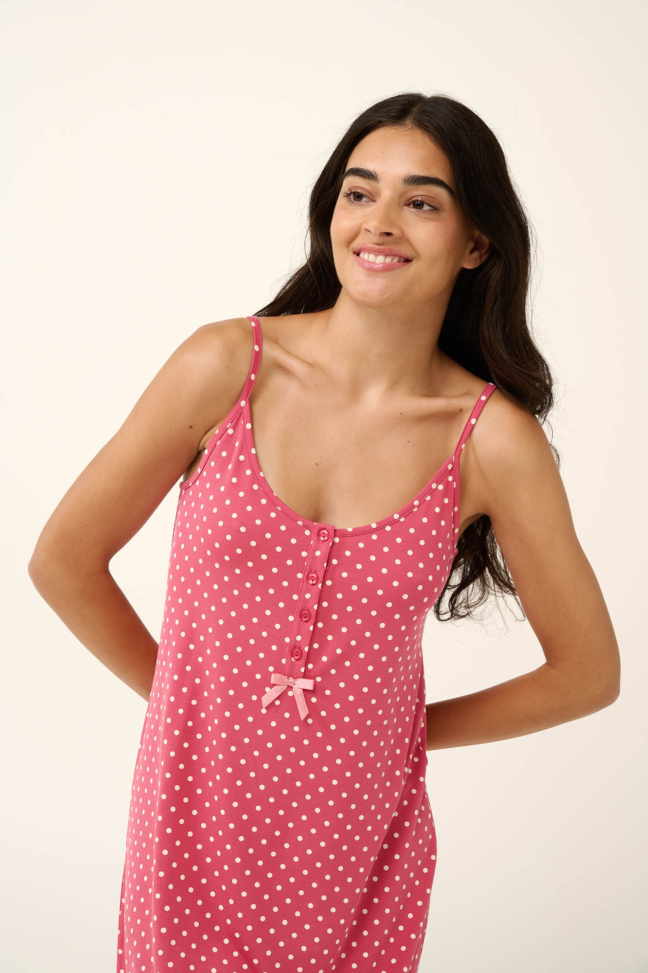 Προσθέστε στη γκαρνταρόμπα σας ένα καλοκαιρινό νυχτικό σε πουά μοτίβο με προσαρμοζόμενες τιράντες. Σχεδιασμένο με πατιλέτα σε χαλαρή γραμμή και κατασκευασμένο από διαπνέον micromodal με εξαιρετικά απαλή αίσθηση στο δέρμα. Ένα ανάλαφρο και αέρινο νυχτικό με ρομαντικό χαρακτήρα που θα σας κρατήσει δροσερή και θα σας βοηθήσει να απολαύσετε τις στιγμές χαλάρωσης σας και το βραδινό σας ύπνο.