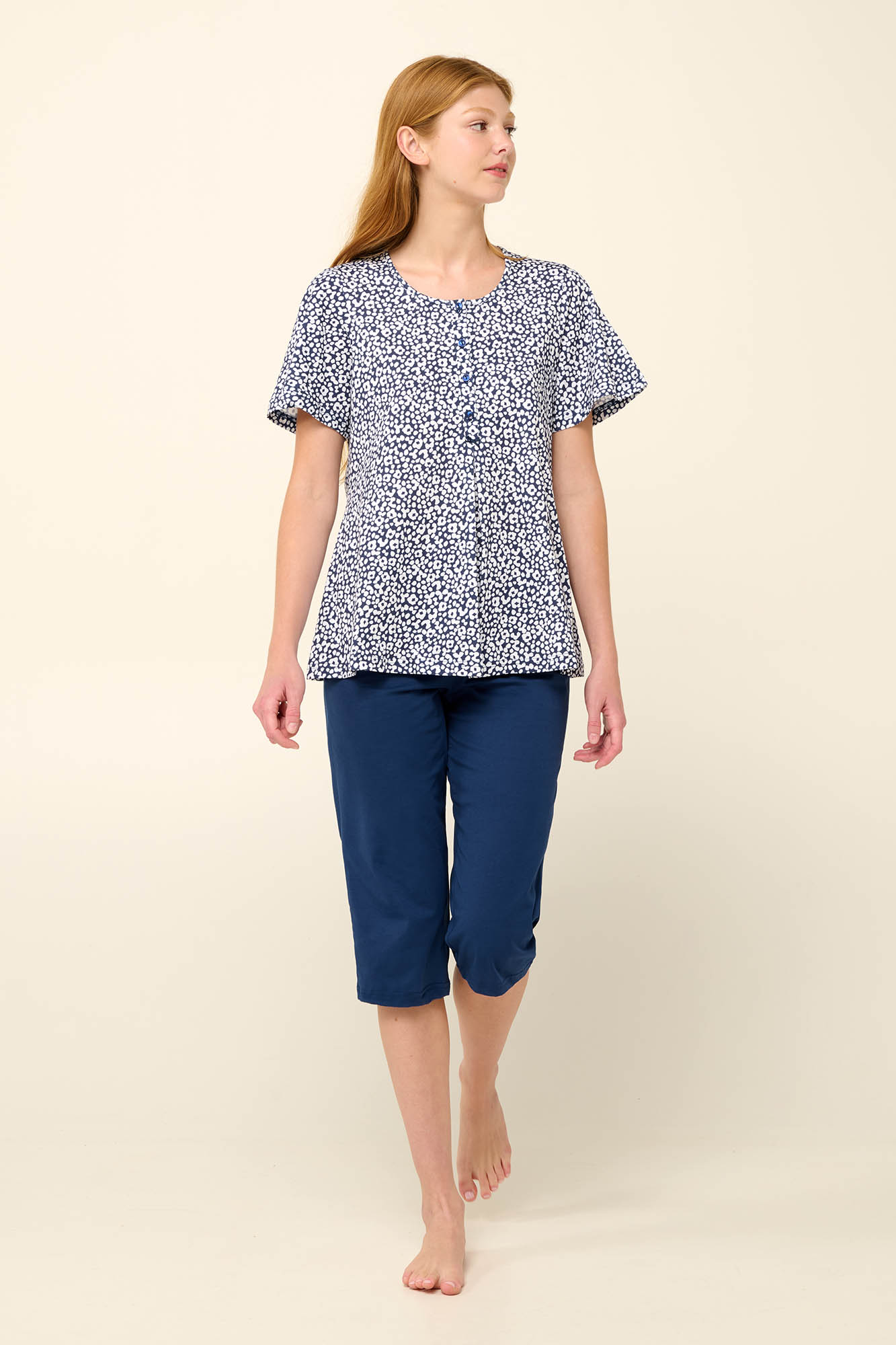 Δώστε άνεση στη καθημερινότητα σας με ένα σετ καλοκαιρινές γυναικείες πυτζάμες. Αποτελείται από μονόχρωμο κάπρι παντελόνι και μπλούζα σε δροσερό φλοράλ μοτίβο. Σχεδιασμένο με κοντό μανίκι, πατιλέτα και πιέτα μπροστά στη περιοχή της κοιλιάς. Είναι φτιαγμένες σε κανονική γραμμή από 100% βαμβάκι single jersey που επιτρέπει στο δέρμα να αναπνέει και θα σας βοηθήσει να απολαύσετε το βραδινό σας ύπνο.