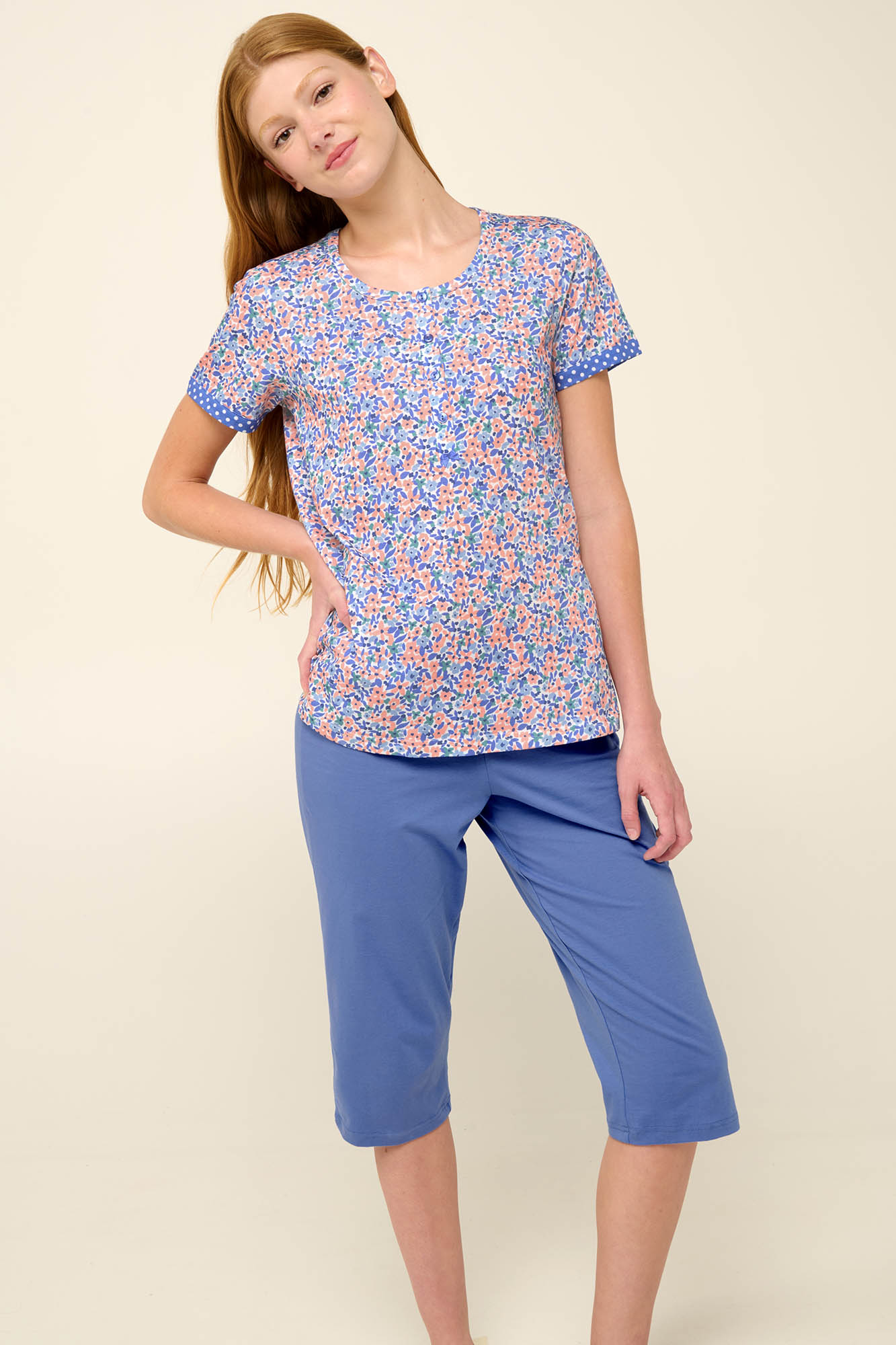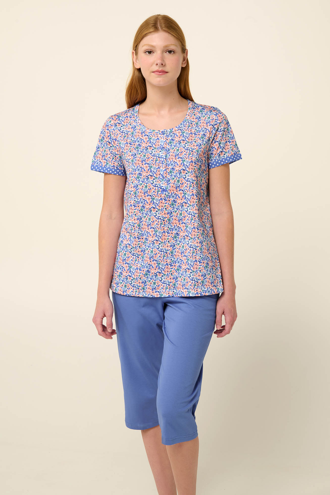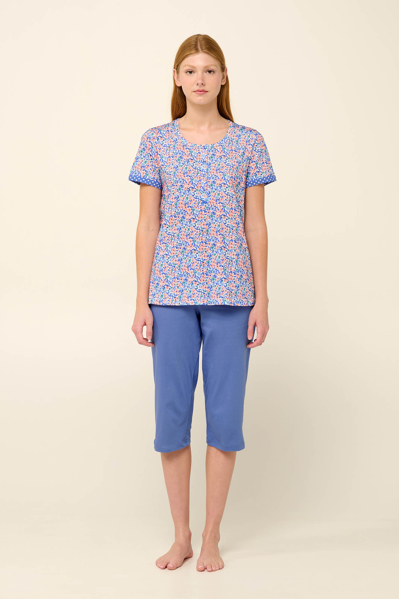 Απολαύστε στιγμές ηρεμίας και χαλάρωσης με ένα σετ καλοκαιρινές γυναικείες πυτζάμες που αποτελείται από μονόχρωμο κάπρι παντελόνι και μπλούζα με κοντό μανίκι και πατιλέτα σε παστέλ φλοράλ μοτίβο. Είναι κατασκευασμένο από 100% βαμβάκι single jersey που επιτρέπει στο δέρμα να αναπνέει και χαρίζει ανάλαφρη αίσθηση. Σχεδιασμένο σε κανονική γραμμή για άνετη εφαρμογή θα σας βοηθήσει να απολαύσετε ένα όμορφο πρωινό.