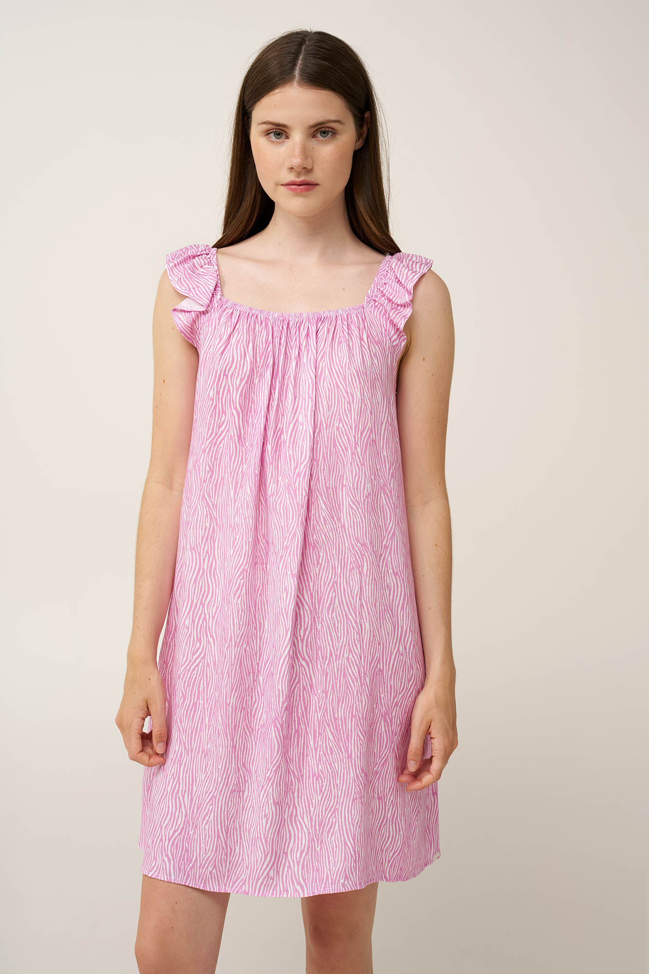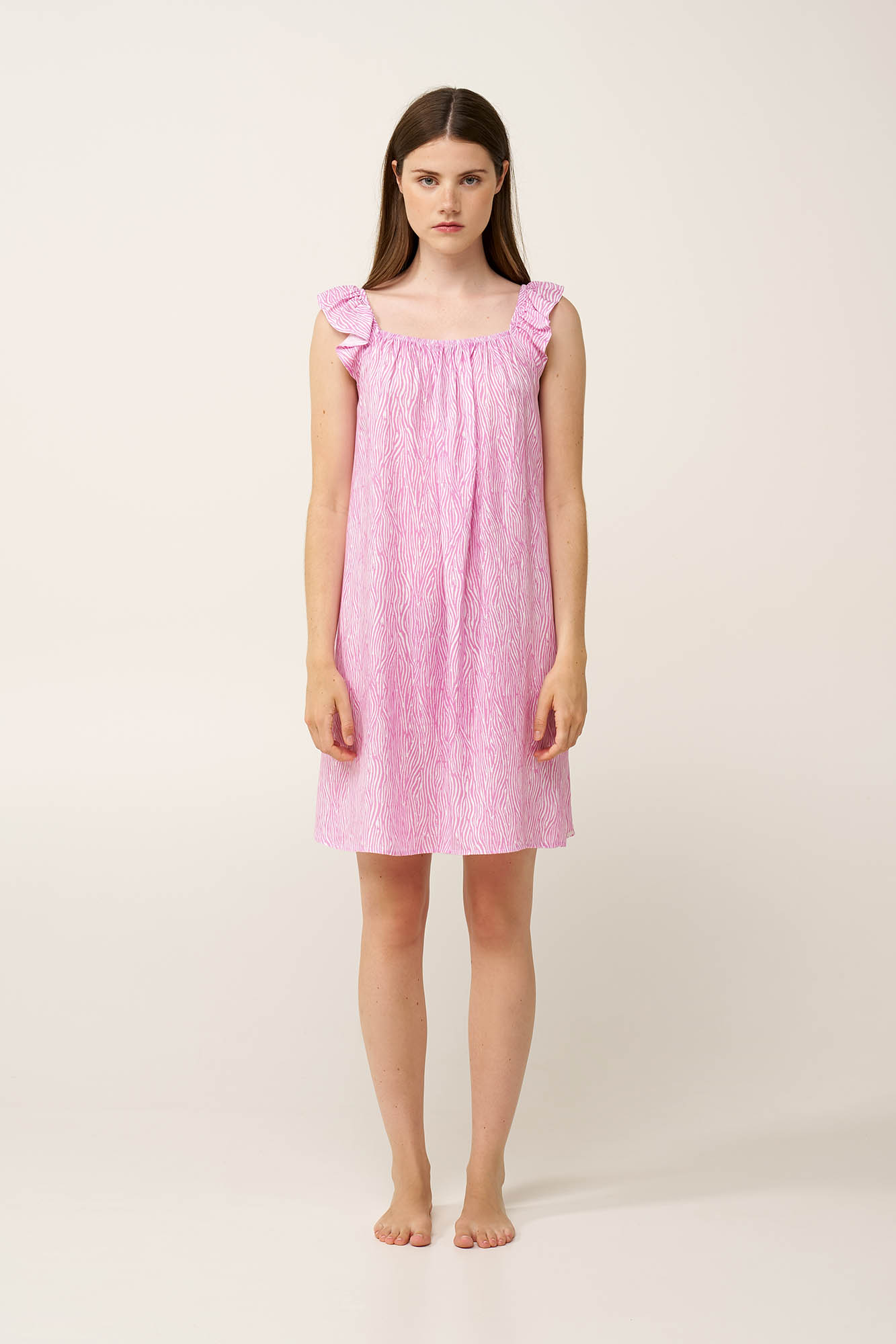Ανανεώστε τη γκαρνταρόμπα σας με αυτό το κομψό νυχτικό από ελαφριά ποπλίνα viscose, σχεδιασμένο για δροσερή και άνετη αίσθηση τις ζεστές καλοκαιρινές ημέρες. Οι τιράντες με διακριτικό βολάν προσθέτουν μια απαλή, ρομαντική πινελιά, ενώ οι μπροστά και πίσω χαρίζουν χαλαρή γραμμή και φυσική ροή στο σώμα. Το zebra-inspired μοτίβο προσθέτει κομψότητα και ρομαντισμό. Ανάλαφρο και αέρινο, είναι ιδανικό για ξεκούραστο ύπνο ή χαλαρά, ήσυχα βράδια στο σπίτι.