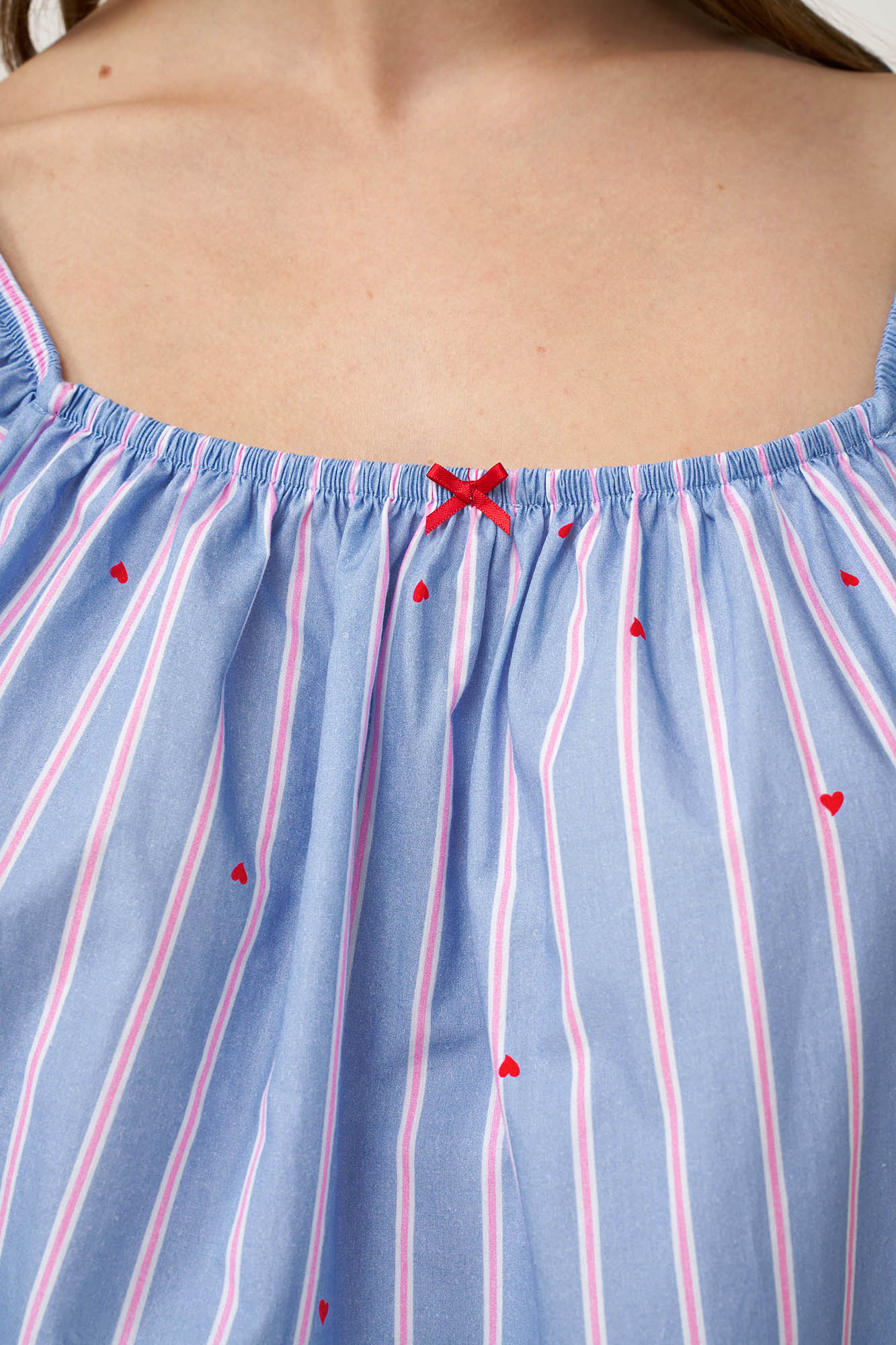 Αφεθείτε στη γλυκιά και παιχνιδιάρικη αίσθηση που προσφέρει αυτό το ανάλαφρο babyd oll. Κατασκευασμένο από δροσερή και διαπνέουσα ποπλίνα από 100% βαμβάκι, προσφέρει φρεσκάδα και ανάλαφρη αίσθηση στο δέρμα. Αποτελείται από τοπ με βολάν στους ώμους και σούρες στο στήθος που συνοδεύεται από ένα άνετο κοντό παντελόνι. Οι απαλές παστέλ ρίγες σε baby blue, ροζ και λευκό διακόπτονται από μικρές κόκκινες καρδιές, προσδίδοντας στο σετ μια ρομαντική, στοργική αίσθηση, κλασική αλλά και χαριτωμένη. Ιδανικό για χαλάρωση ή ύπνο τις πιο ζεστές ημέρες.