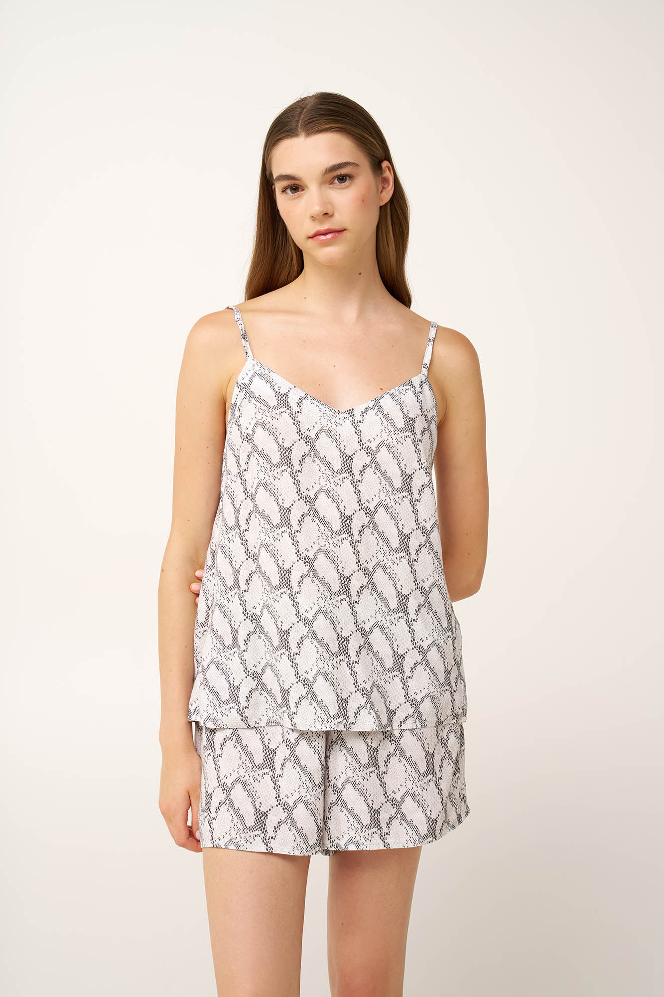 Θηλυκό και ανεπιτήδευτα κομψό, αυτό το baby doll είναι κατασκευασμένο από ελαφριά viscose ποπλίνα, προσφέροντας δροσερή αίσθηση, ιδανική για τις ζεστές καλοκαιρινές ημέρες. Αποτελείται από τοπ με λεπτές τιράντες και κολακευτική V λαιμόκοψη και κοντό παντελόνι με άνετη εφαρμογή. Φρέσκο, αέρινο και κομψό, συνδυάζει άνεση και θηλυκότητα, αποτελώντας ιδανική επιλογή για χαλάρωση στο σπίτι ή έναν ήρεμο, ξεκούραστο ύπνο.